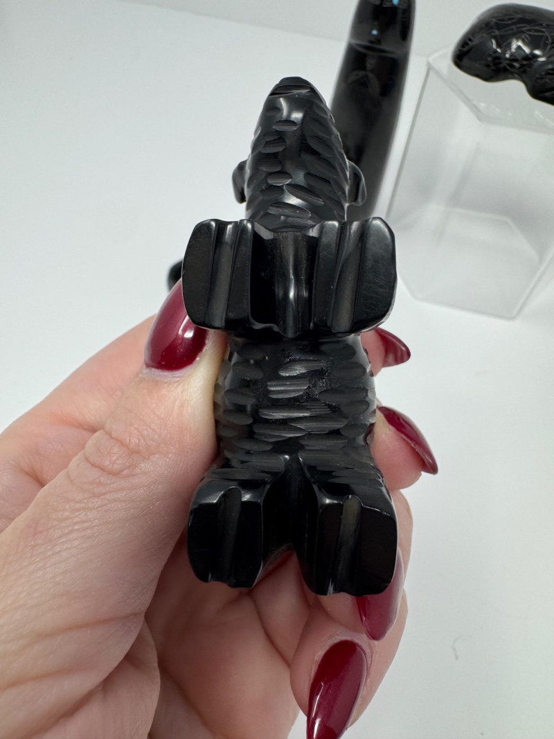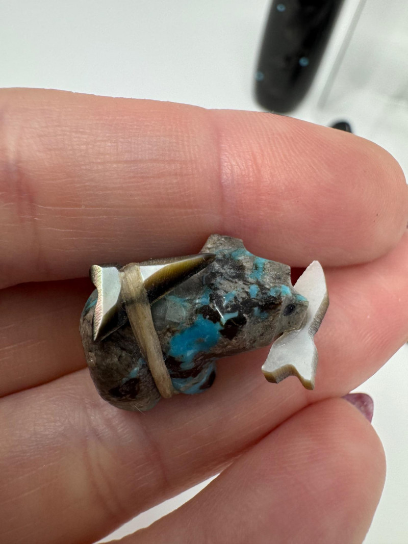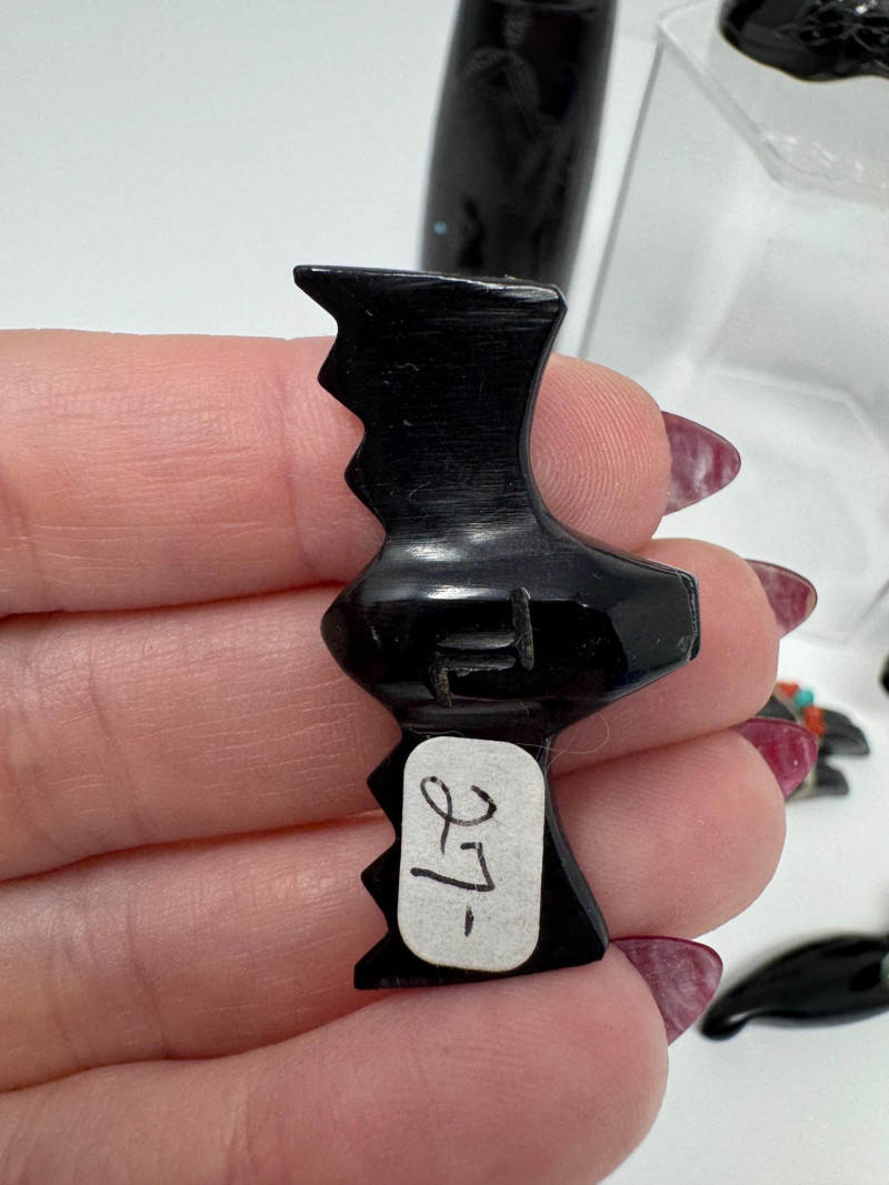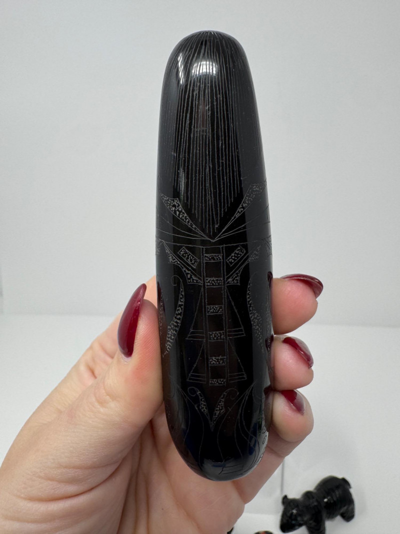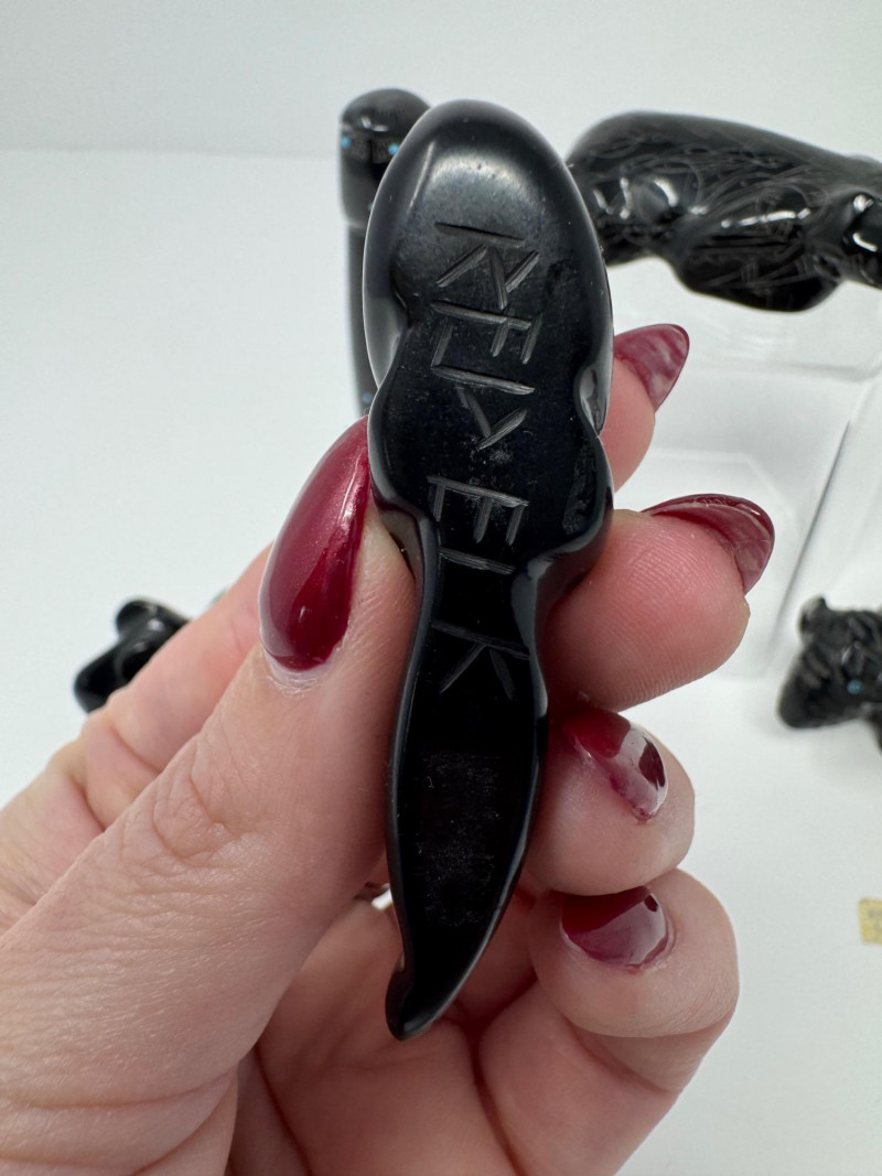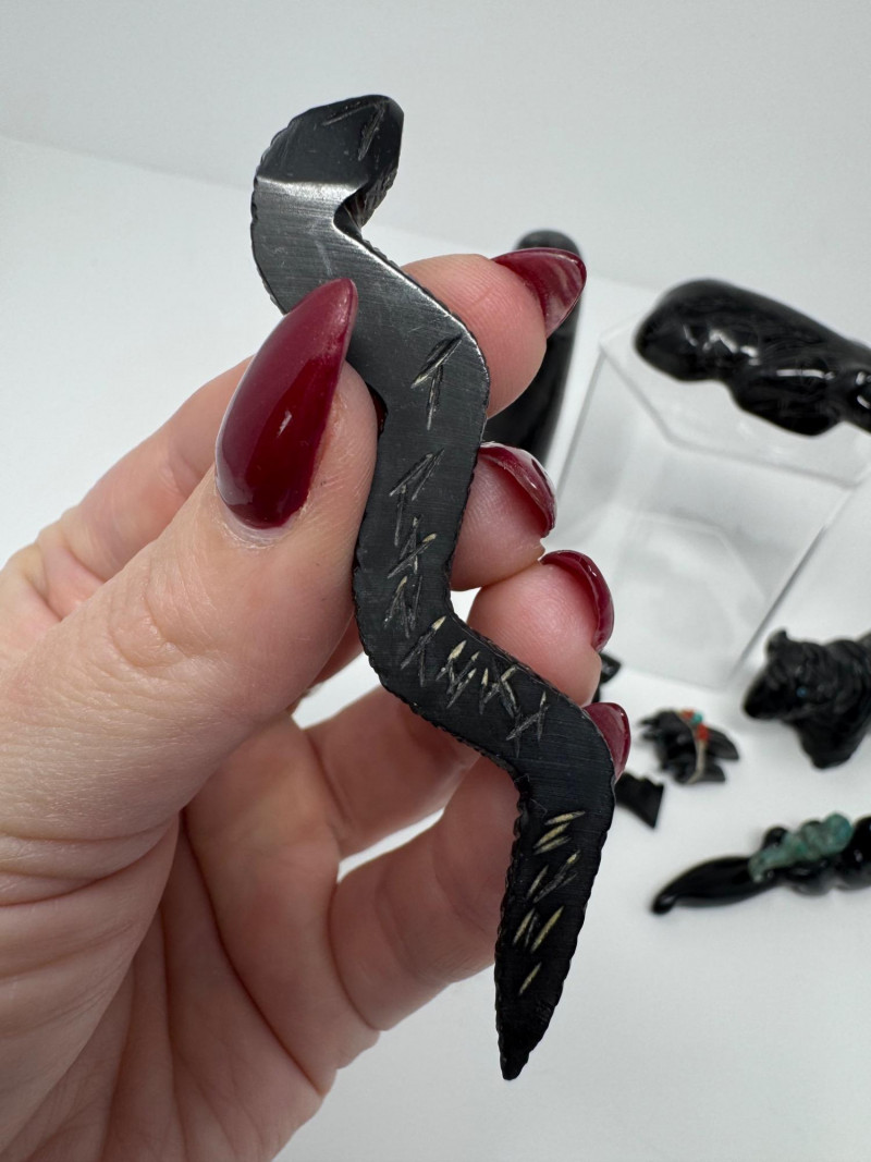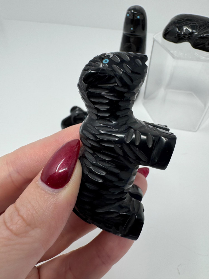 Set of 9 Carved Zuni Stone Fetishes – Signed Artists. Includes animals such as bear, wolf, snake, bat, otter, and more (see photos) Sizes range approx. 1.5” to 4” long Comes with A Guide to Zuni Fetishes and Carvings reference booklet