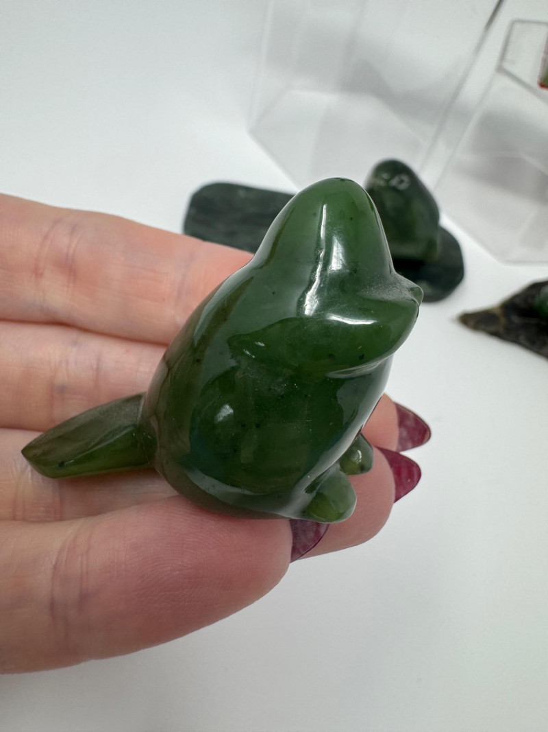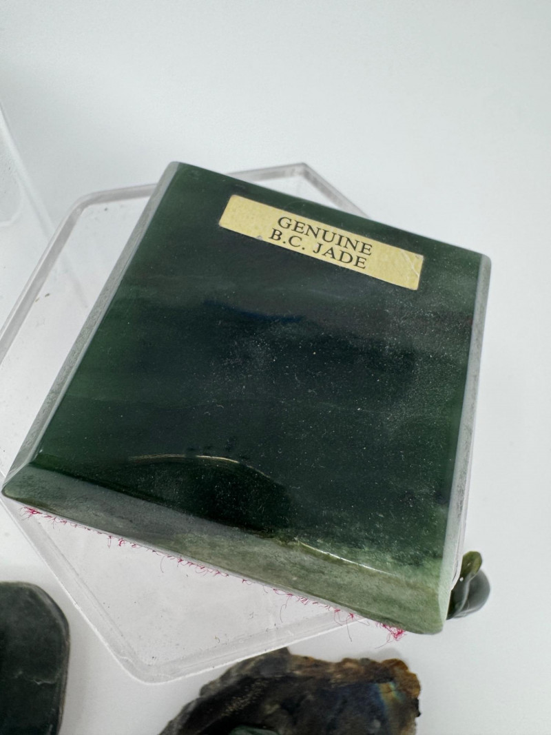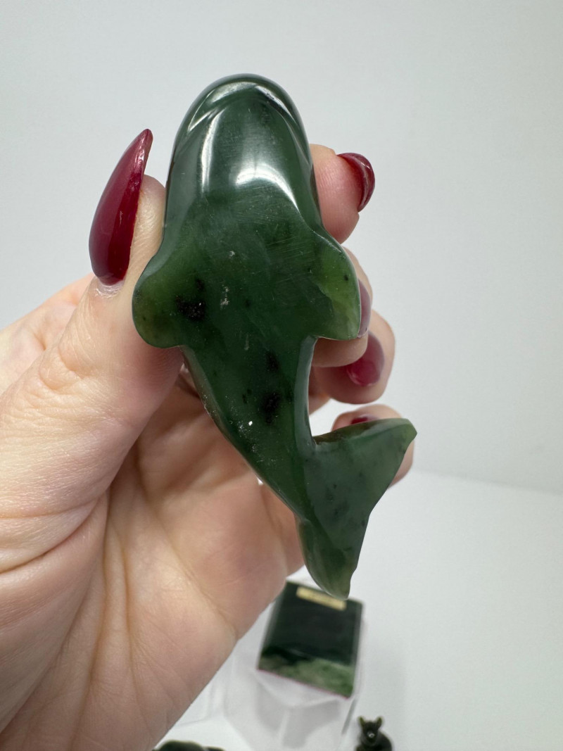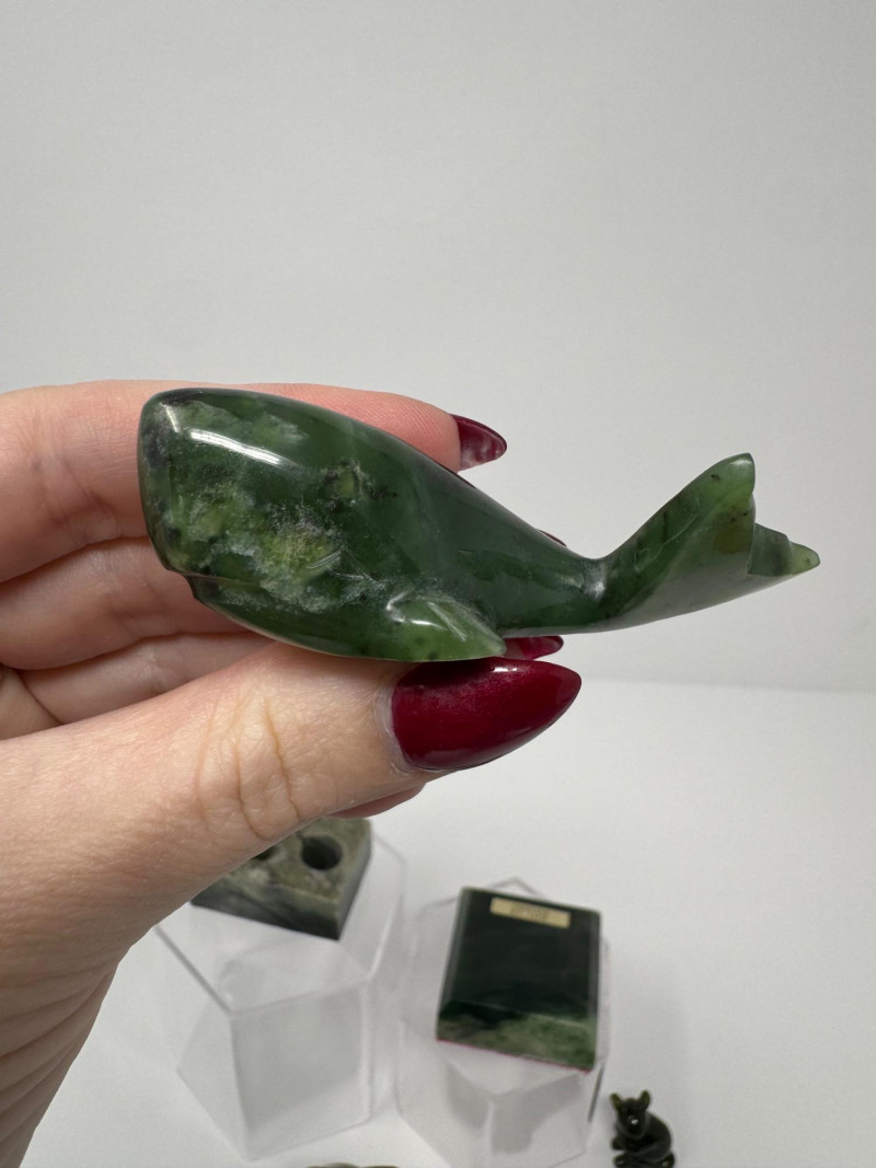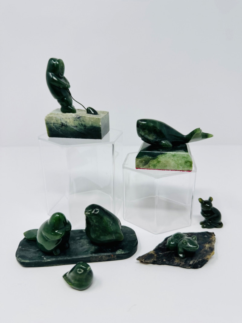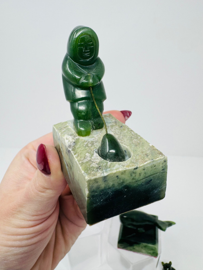 B.C. Jade Stone Carvings – Inuit & Animal Figures. Genuine British Columbia jade carvings, made in Canada. Includes: Inuit figure ice fishing (2.5” tall, on base) Whale on rectangular base Pair of jade birds on shared base Frog figure Mouse/rabbit figure Single small bird Shades of dark green jade with natural variations Inuit figure base marked “Genuine B.C. Jade” Sizes range approx. 1” to 2.5” tall