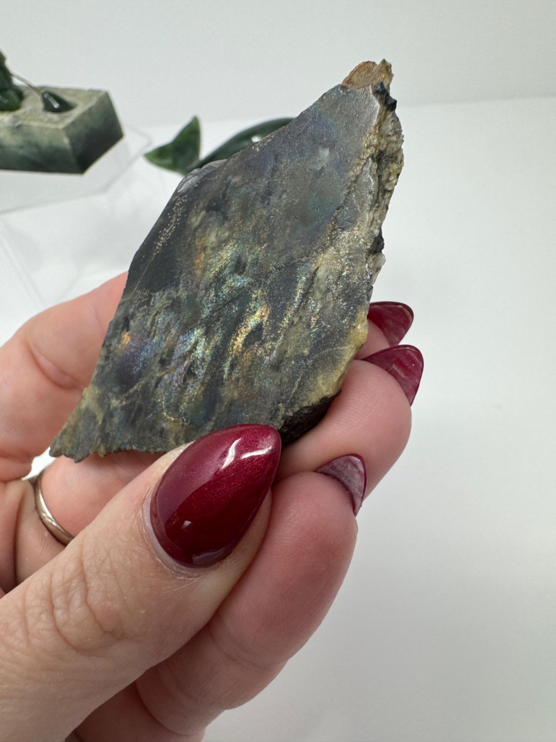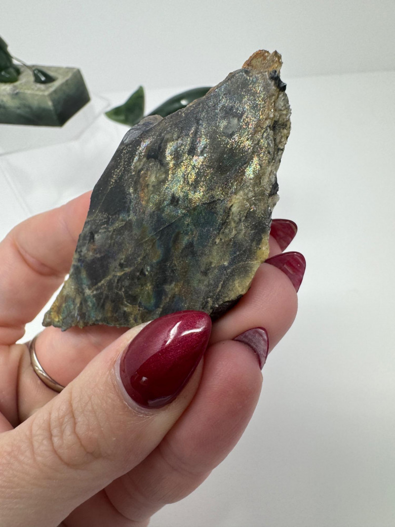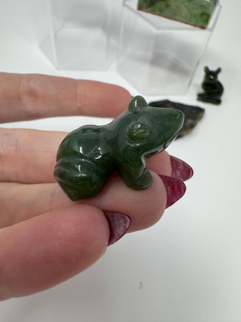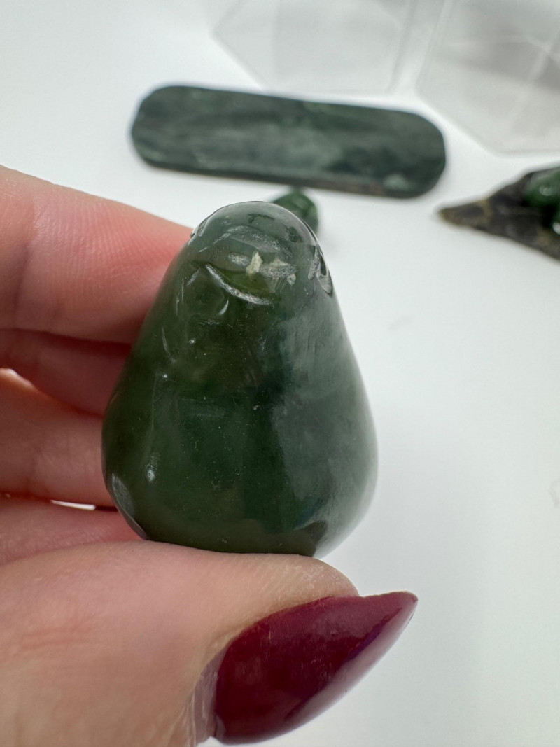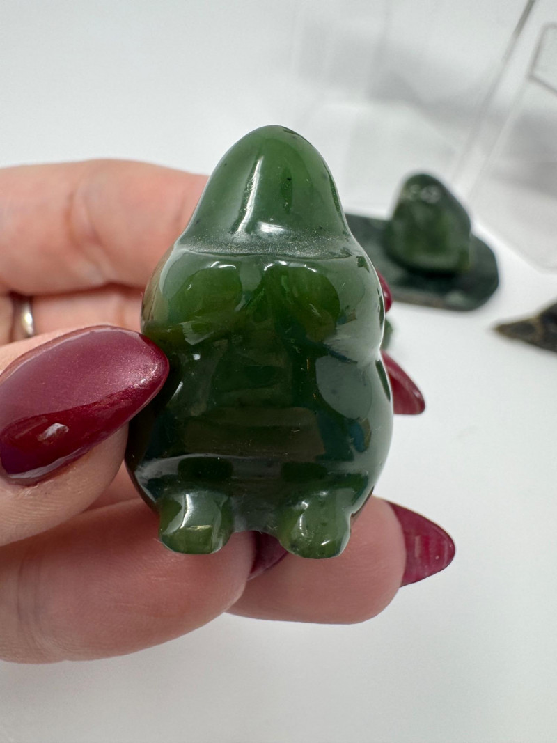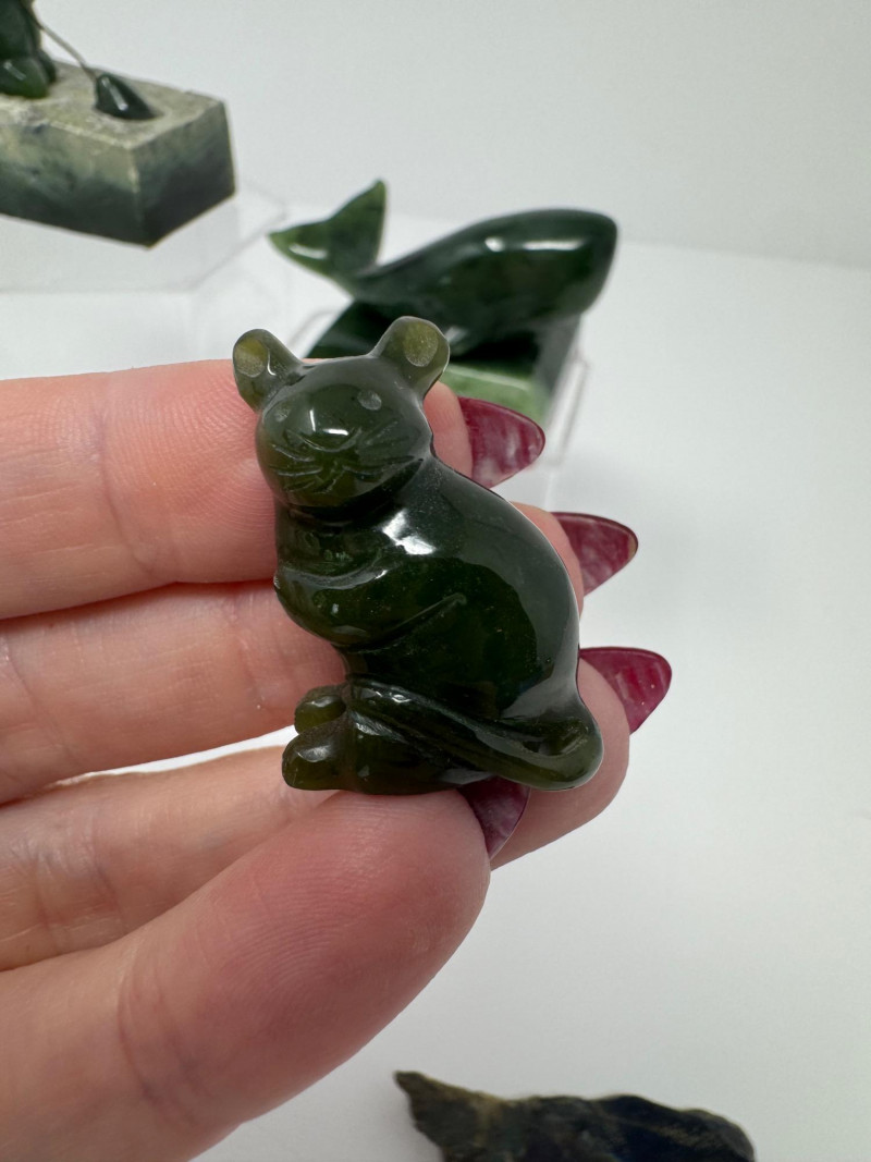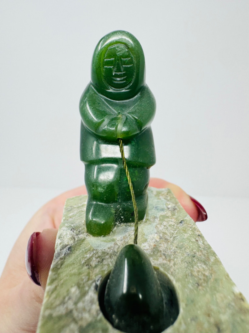 B.C. Jade Stone Carvings – Inuit & Animal Figures. Genuine British Columbia jade carvings, made in Canada. Includes: Inuit figure ice fishing (2.5” tall, on base) Whale on rectangular base Pair of jade birds on shared base Frog figure Mouse/rabbit figure Single small bird Shades of dark green jade with natural variations Inuit figure base marked “Genuine B.C. Jade” Sizes range approx. 1” to 2.5” tall