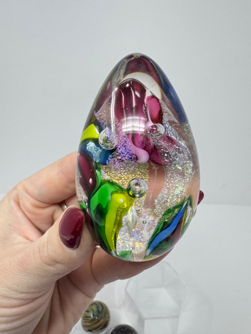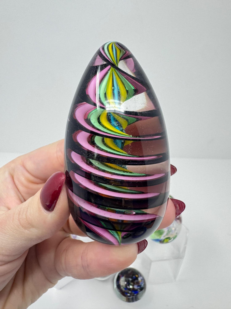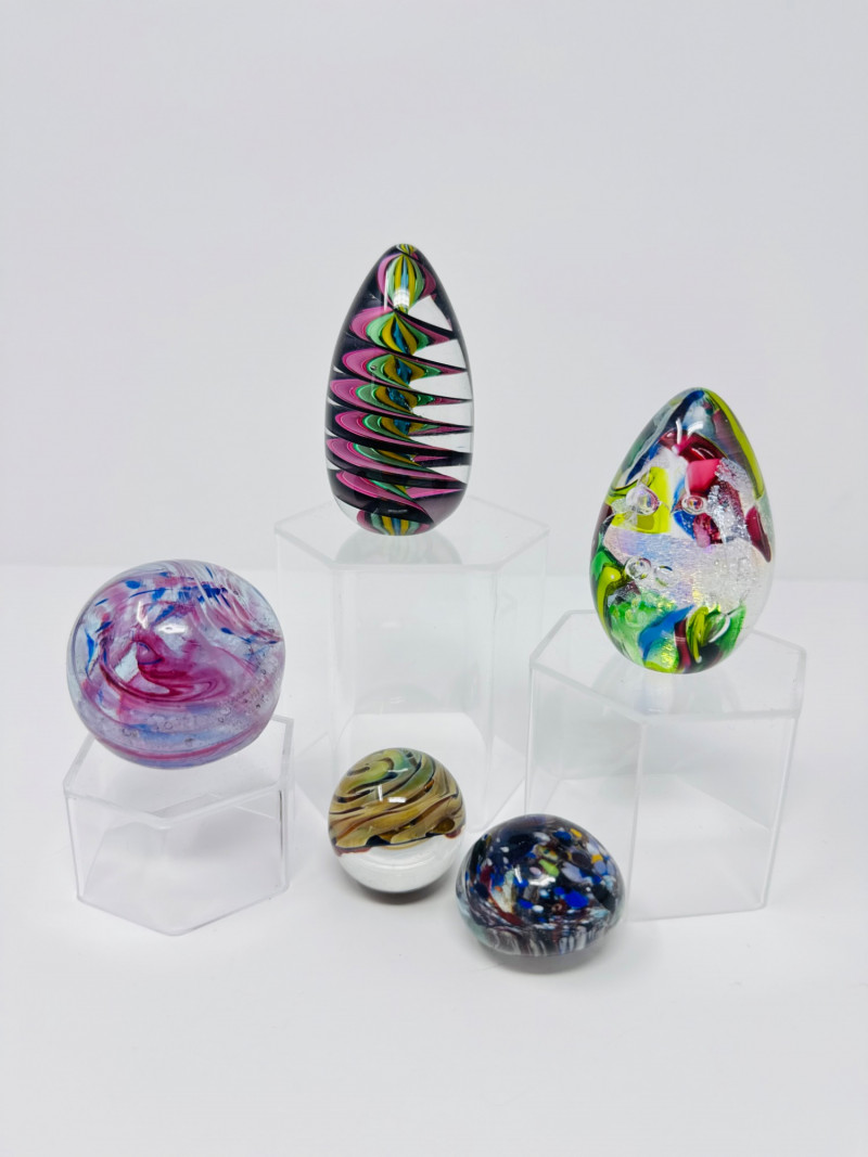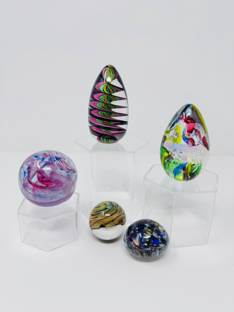 Blown Glass Paperweights & Sculptures – Some Signed. Includes vibrant abstract, swirl, and millefiori-style designs