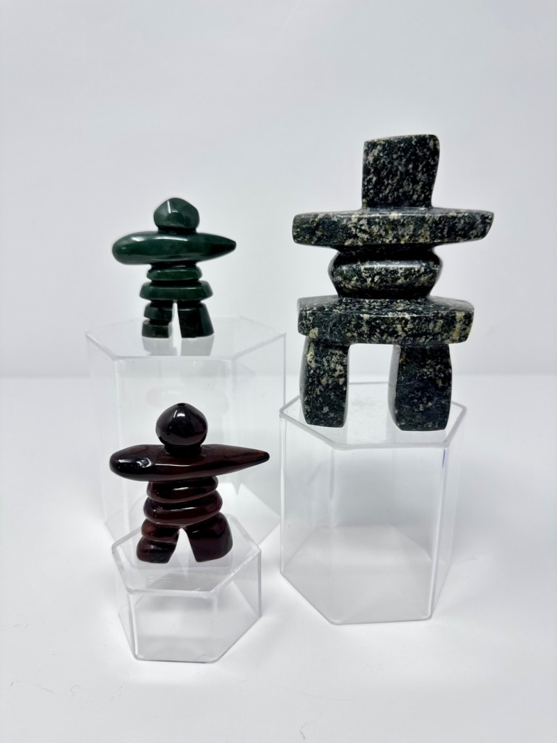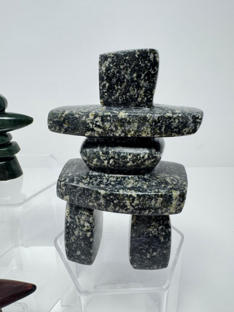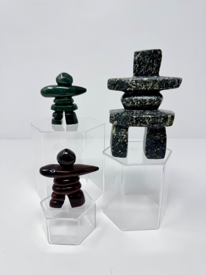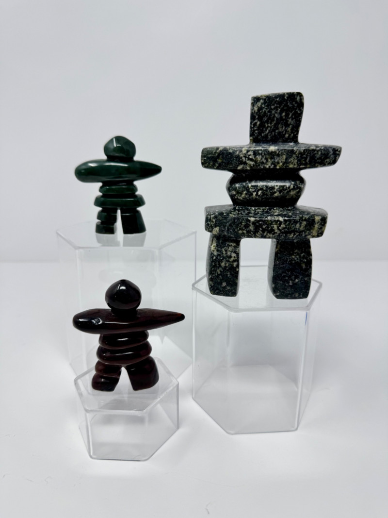 Lot # 100 - Set of 3 Stone Inukshuk Sculptures – Jade, Marble, Reddish Stone