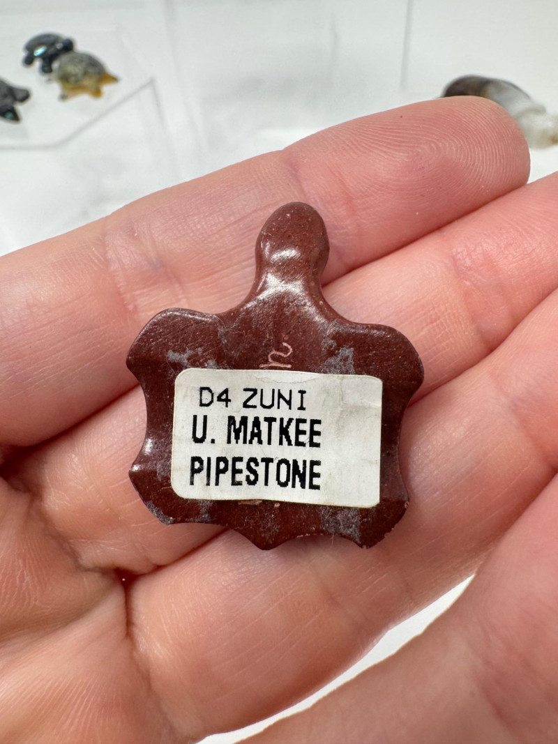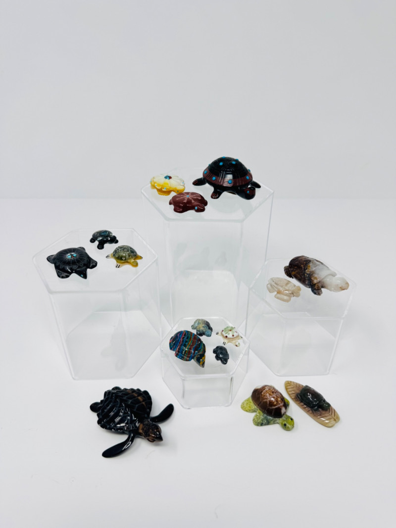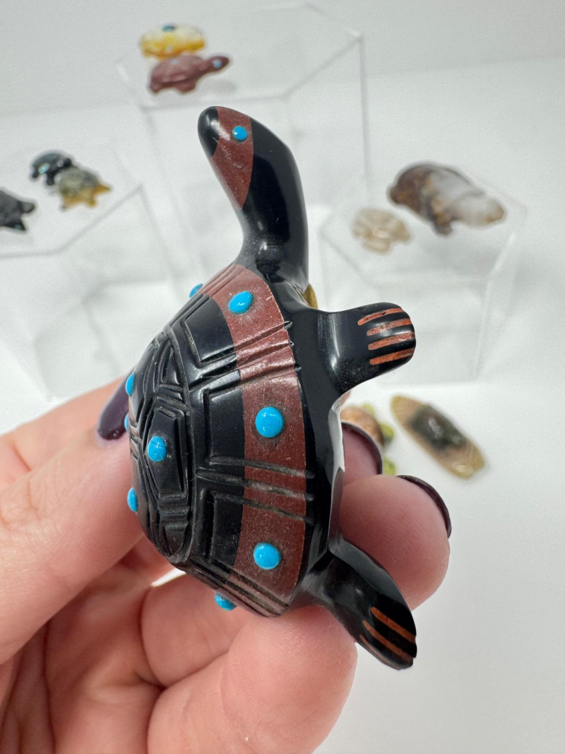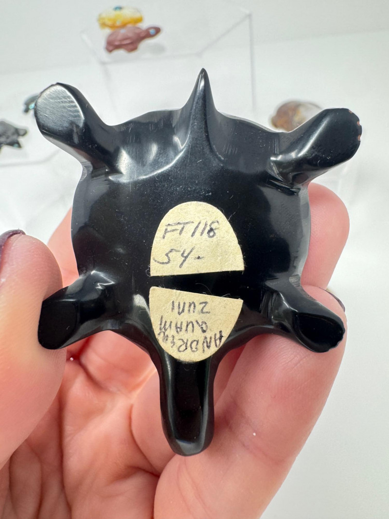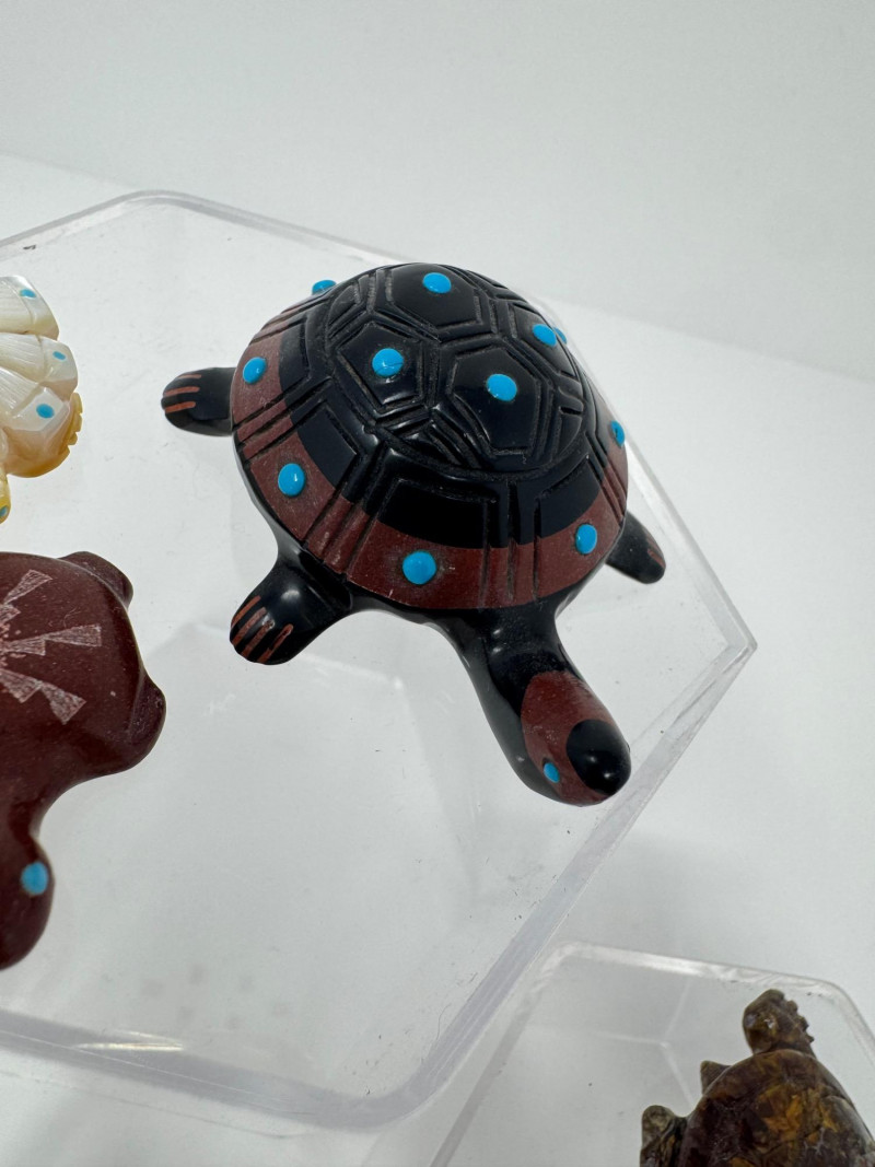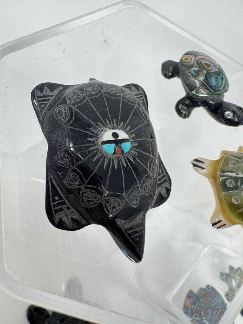 Zuni Tribe Turtle Fetishes & Other Carvings – Many Signed. Materials include marble, pipestone, jet, abalone, and mixed stone inlay Sizes range from approx. 0.75” to 2.5” long Many signed by Zuni artists, including: Dilbert Gasper – Black marble etched turtle, Zuni 2010 Andrew Quam – Jet turtle w/ turquoise inlay Fabian Homer – Green stone turtle U. Matkee – Pipestone turtle