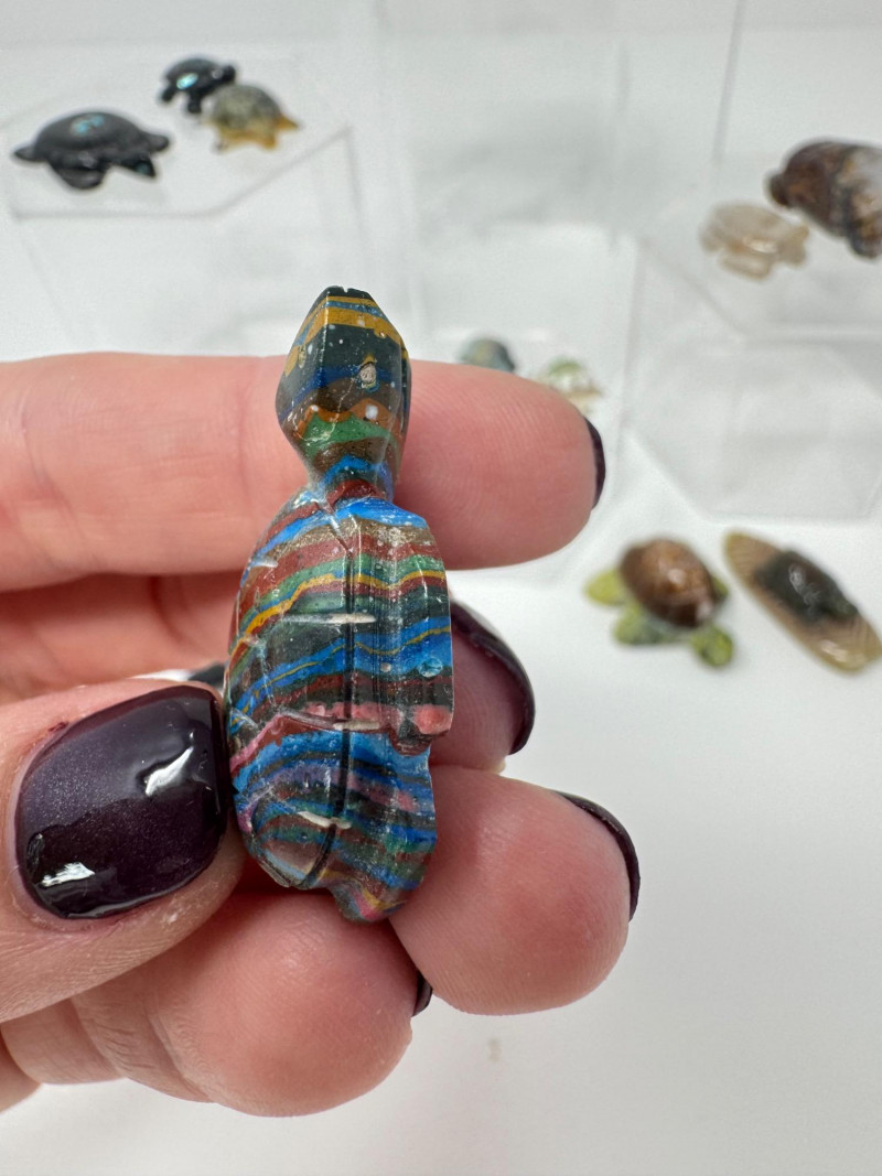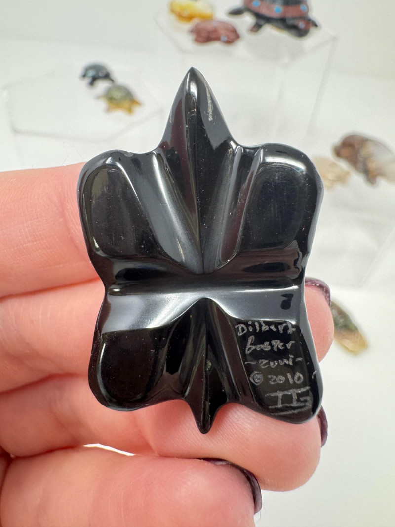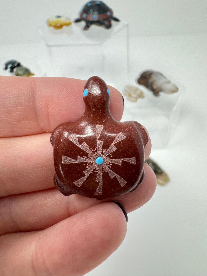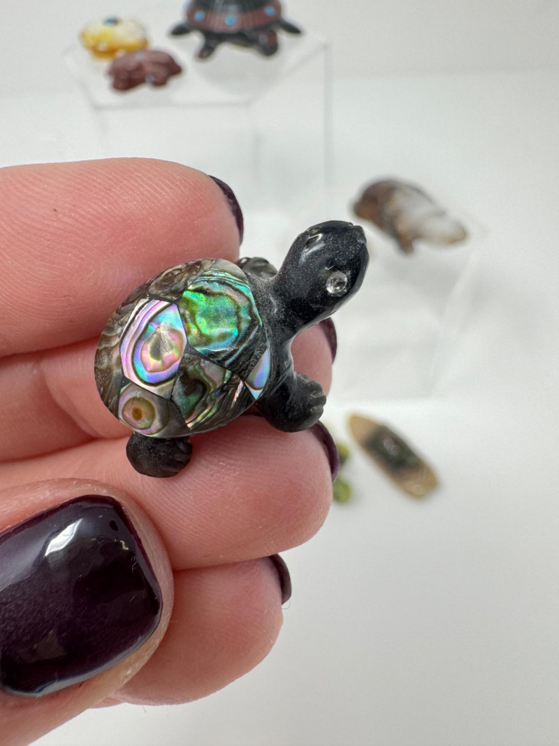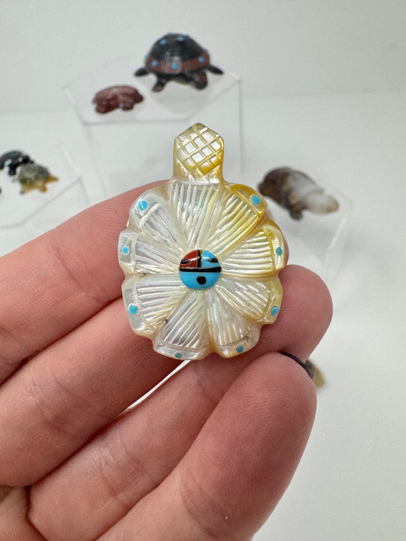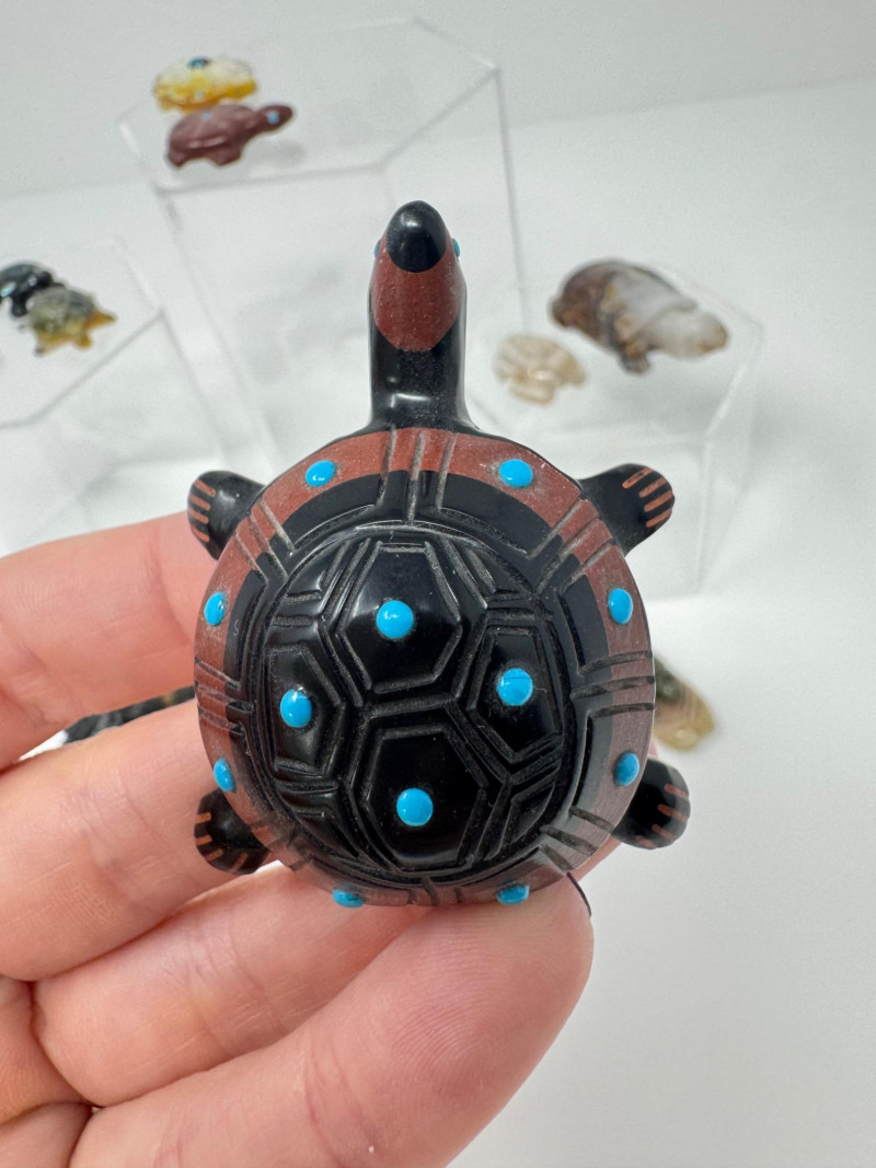 Zuni Tribe Turtle Fetishes & Other Carvings – Many Signed. Materials include marble, pipestone, jet, abalone, and mixed stone inlay Sizes range from approx. 0.75” to 2.5” long Many signed by Zuni artists, including: Dilbert Gasper – Black marble etched turtle, Zuni 2010 Andrew Quam – Jet turtle w/ turquoise inlay Fabian Homer – Green stone turtle U. Matkee – Pipestone turtle