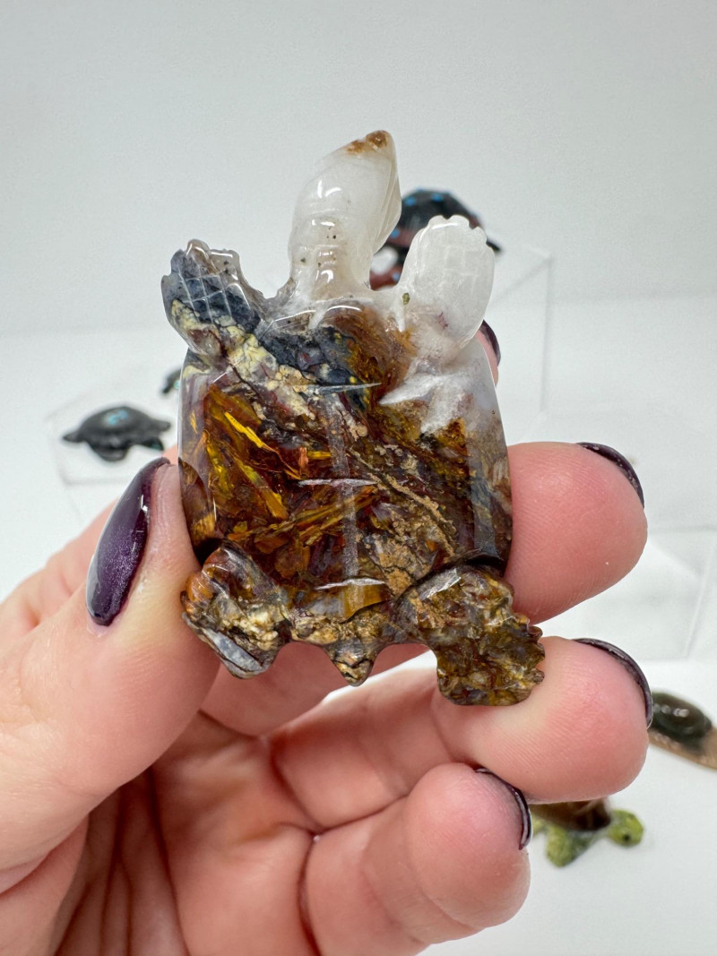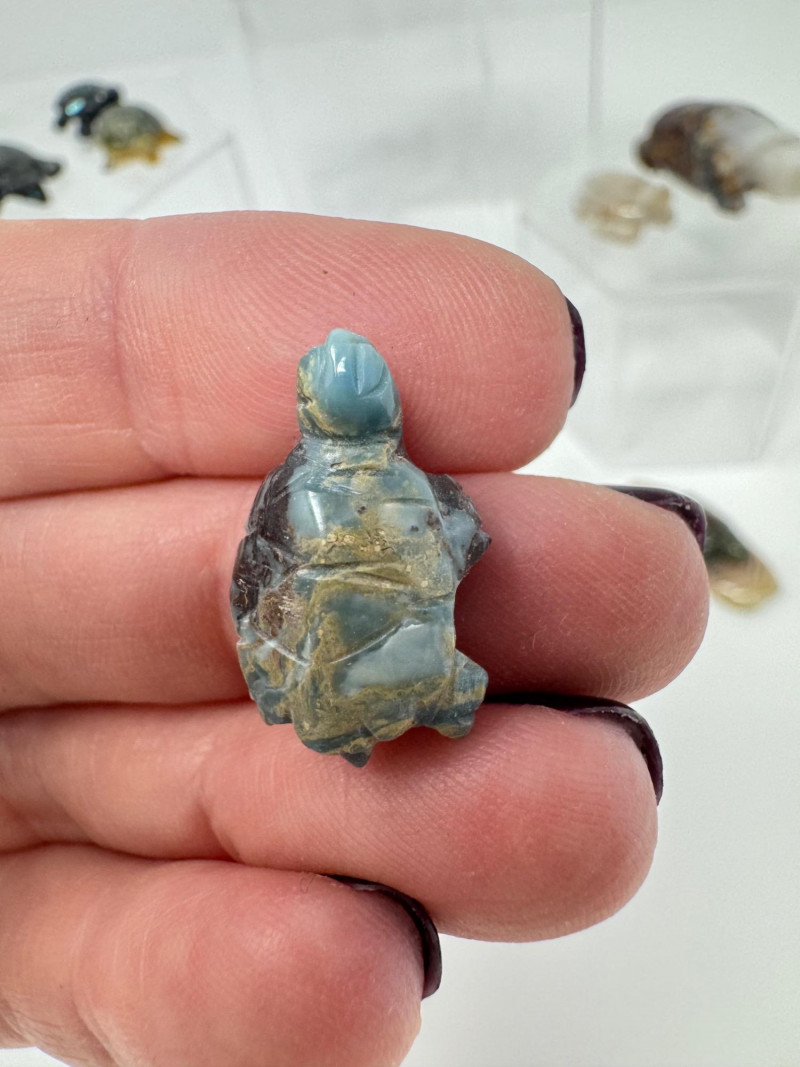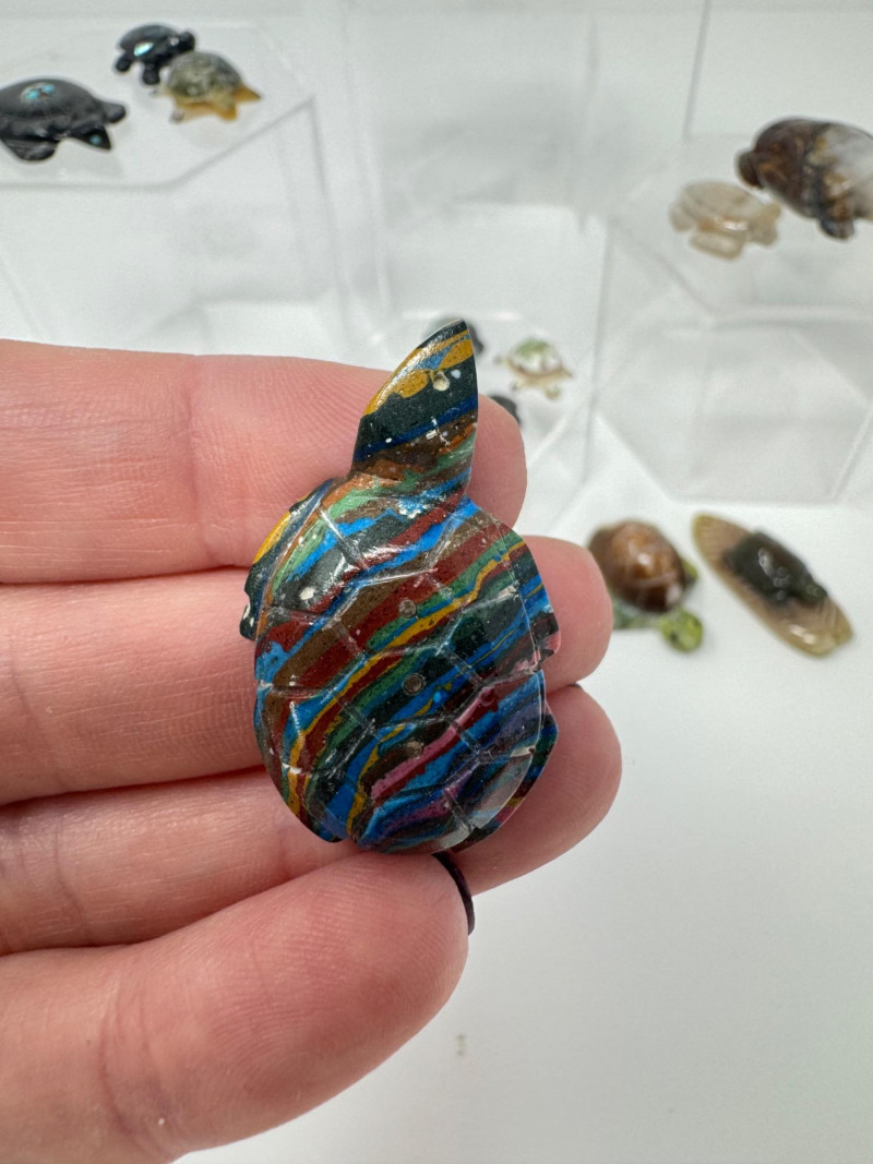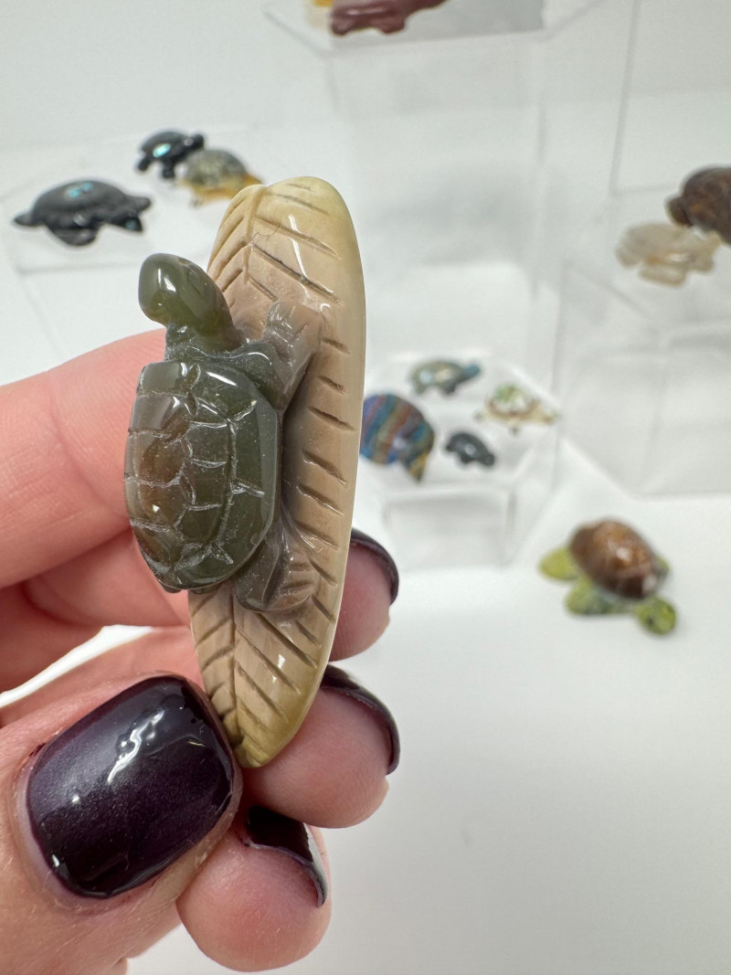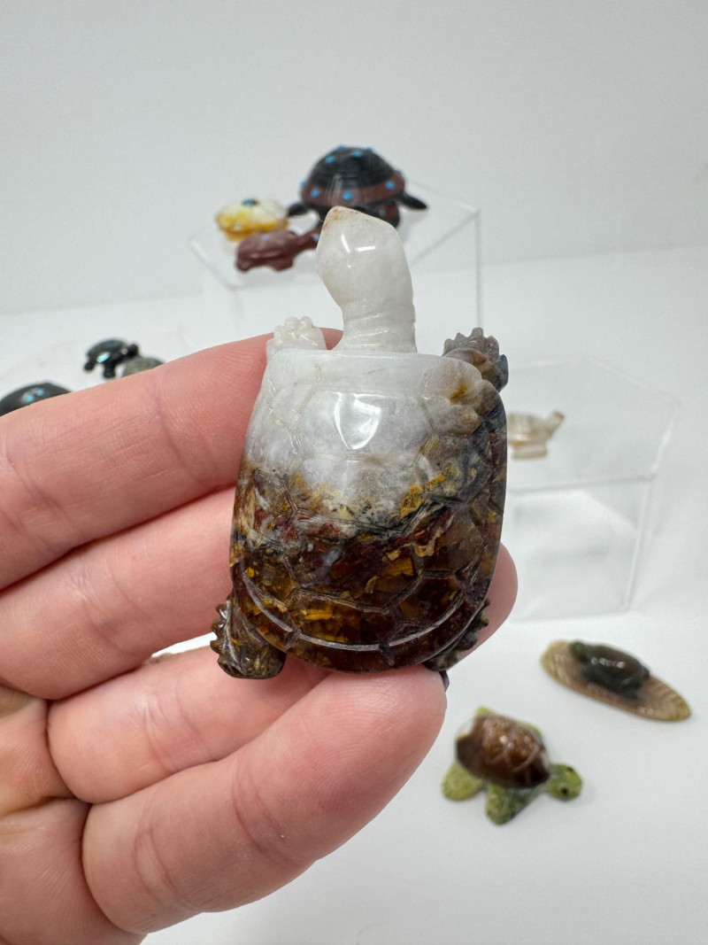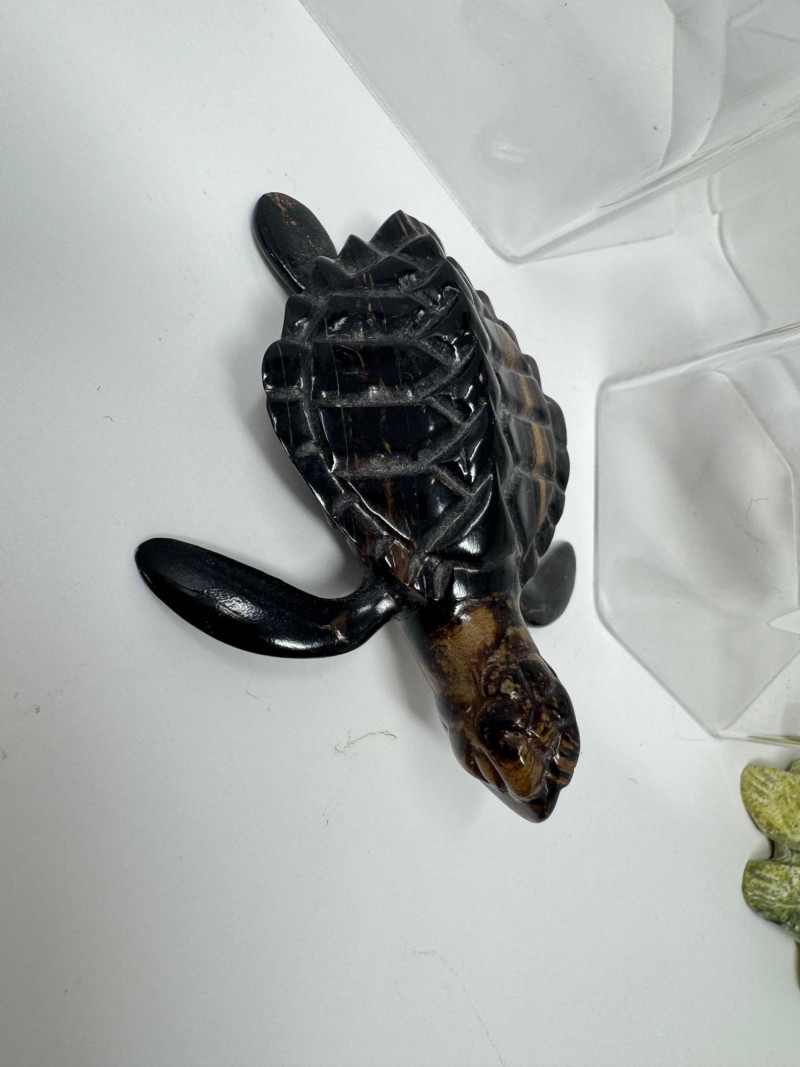 Zuni Tribe Turtle Fetishes & Other Carvings – Many Signed. Materials include marble, pipestone, jet, abalone, and mixed stone inlay Sizes range from approx. 0.75” to 2.5” long Many signed by Zuni artists, including: Dilbert Gasper – Black marble etched turtle, Zuni 2010 Andrew Quam – Jet turtle w/ turquoise inlay Fabian Homer – Green stone turtle U. Matkee – Pipestone turtle