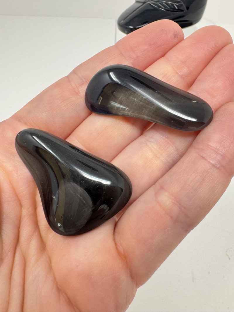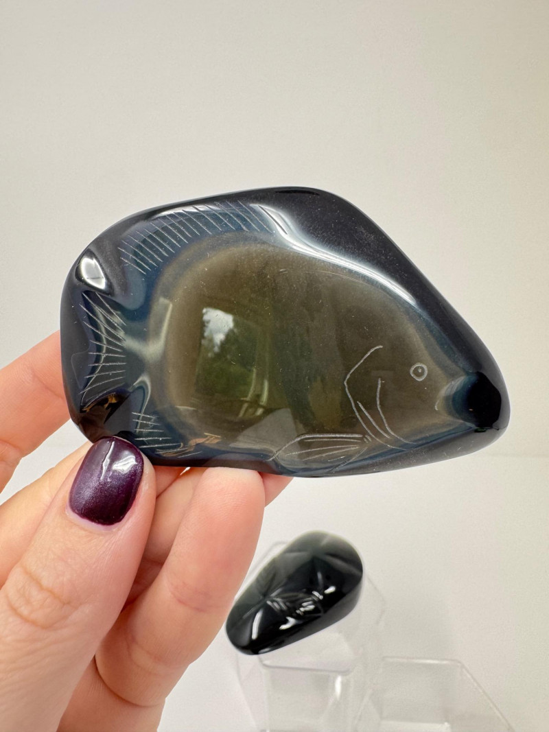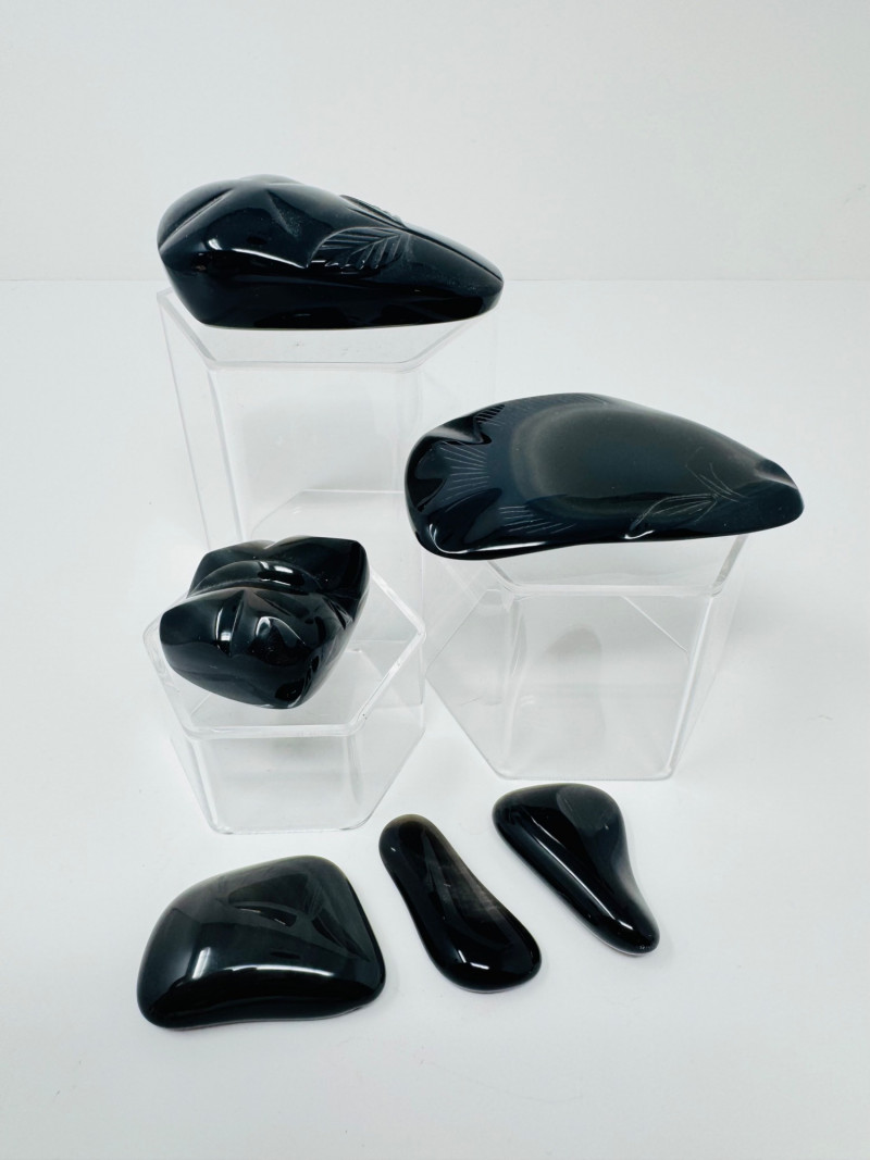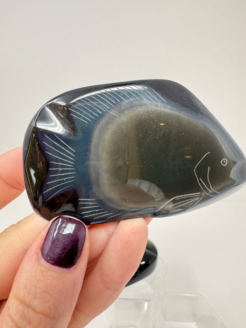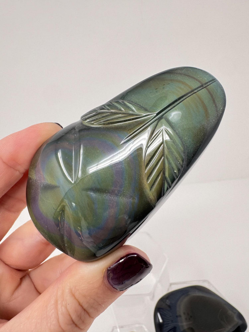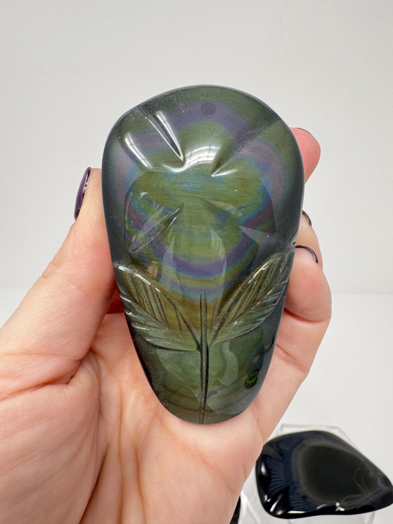Rainbow Obsidian Carvings – Fish, Flower & Abstract Forms. Disclaimer: Stones and minerals are not tested for authenticity, origin, or treatment. Offered as-is from visual assessment only. No refunds based on identification or quality.