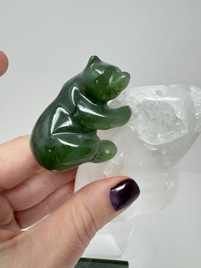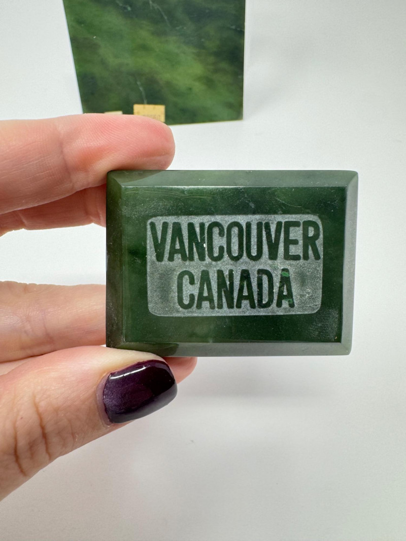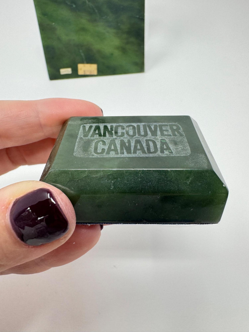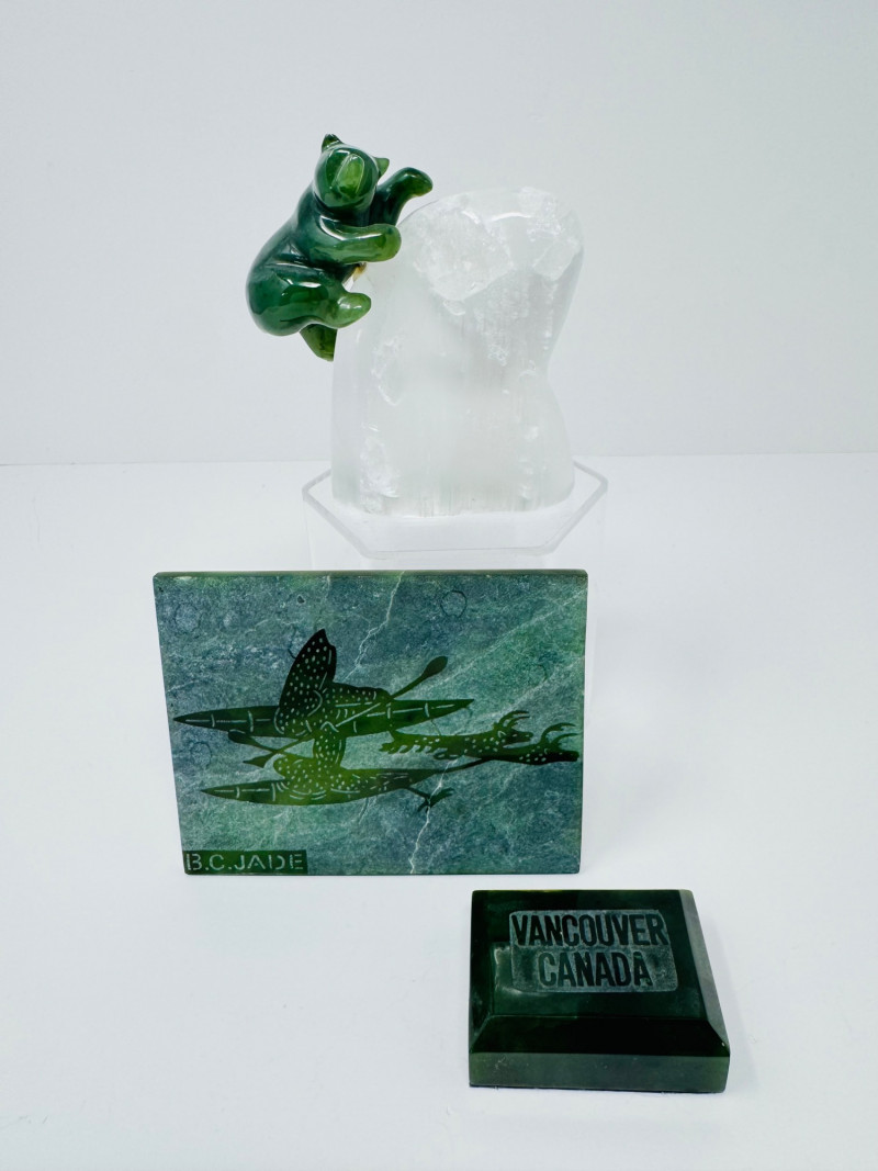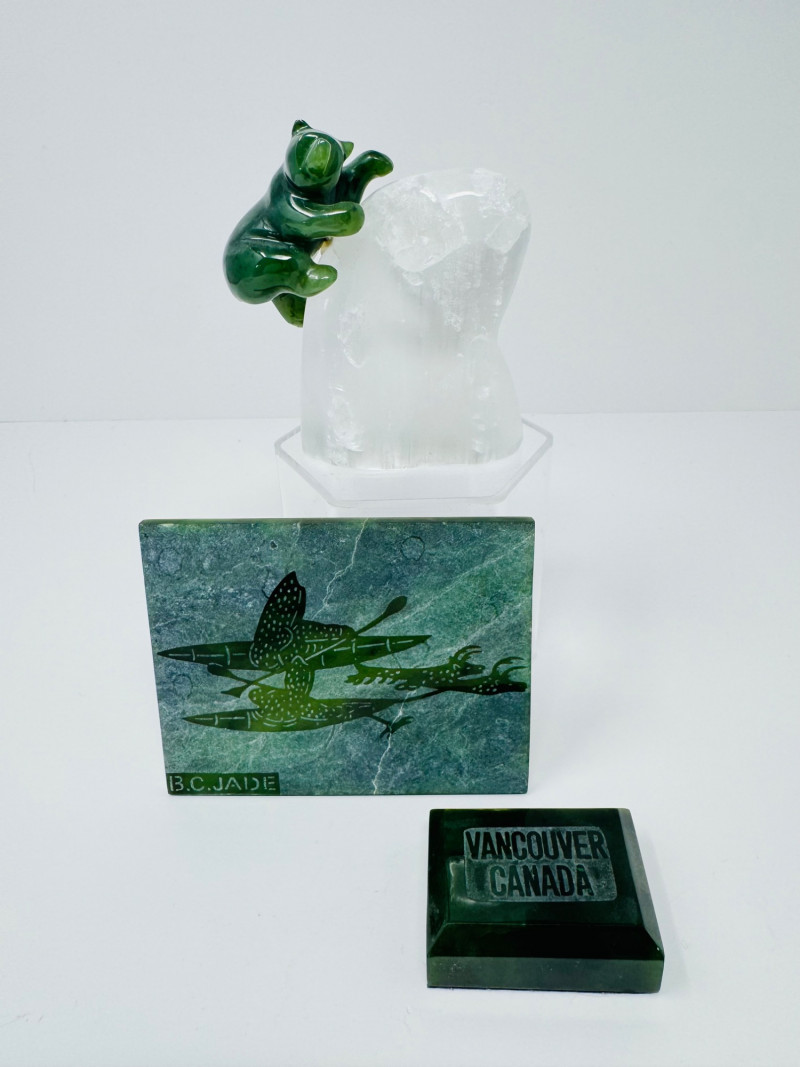 Alaskan Jade Sculptures – Bear on Crystal, Vancouver & B.C. Plaques.