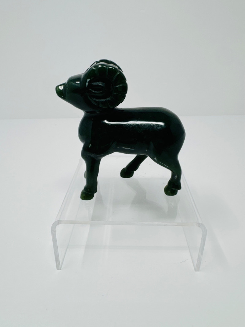 Lot # 121 - Hand-Carved Jade Ram – Deep Green Stone, Smooth Polish, 3”