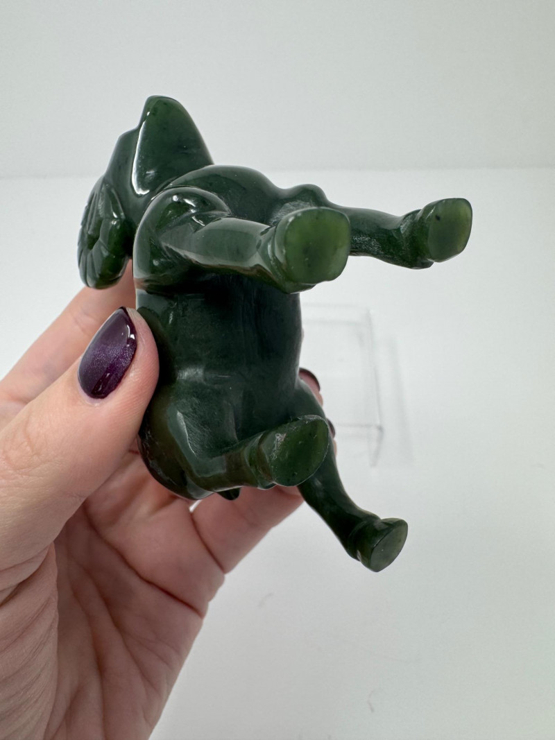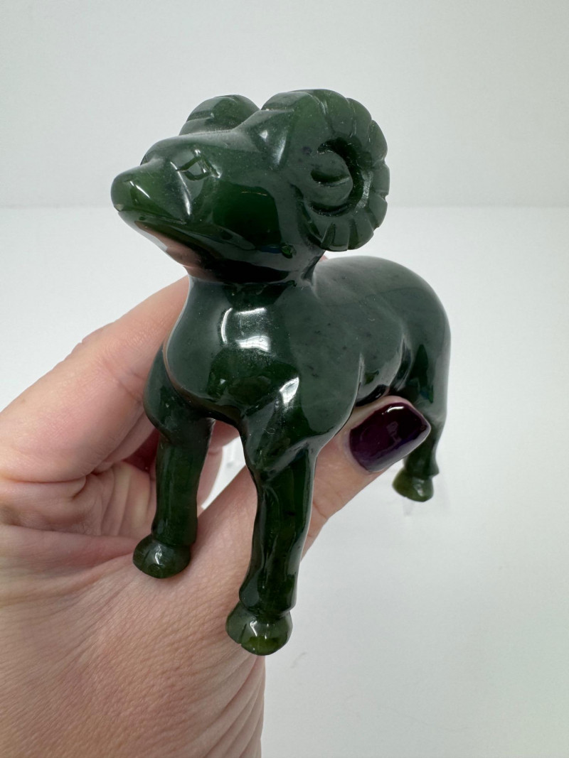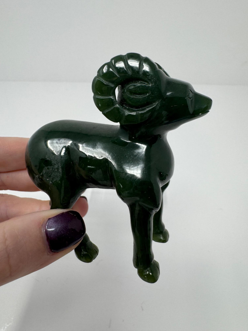Hand-Carved Jade Ram – Deep Green Stone, Smooth Polish, 3”.