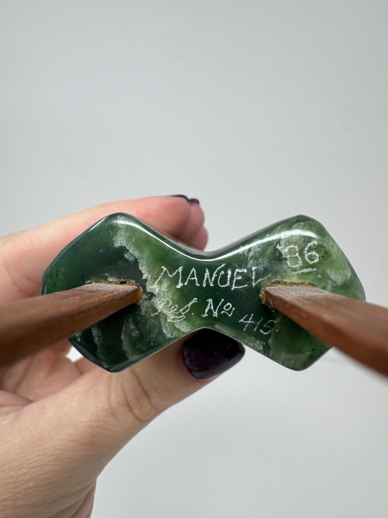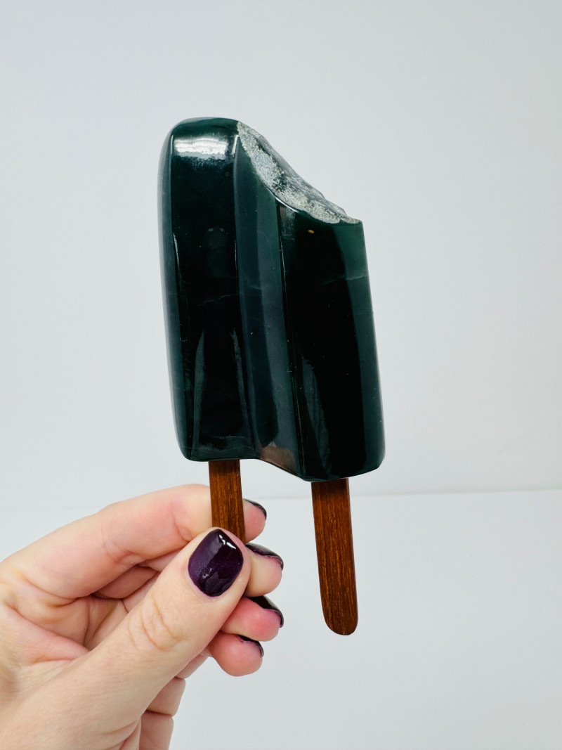 Hand-Carved Jade Twin Popsicle Sculpture – Signed Manuel ’86. Disclaimer: Stones and minerals are not tested for authenticity, origin, or treatment. Offered as-is from visual assessment only. No refunds based on identification or quality.