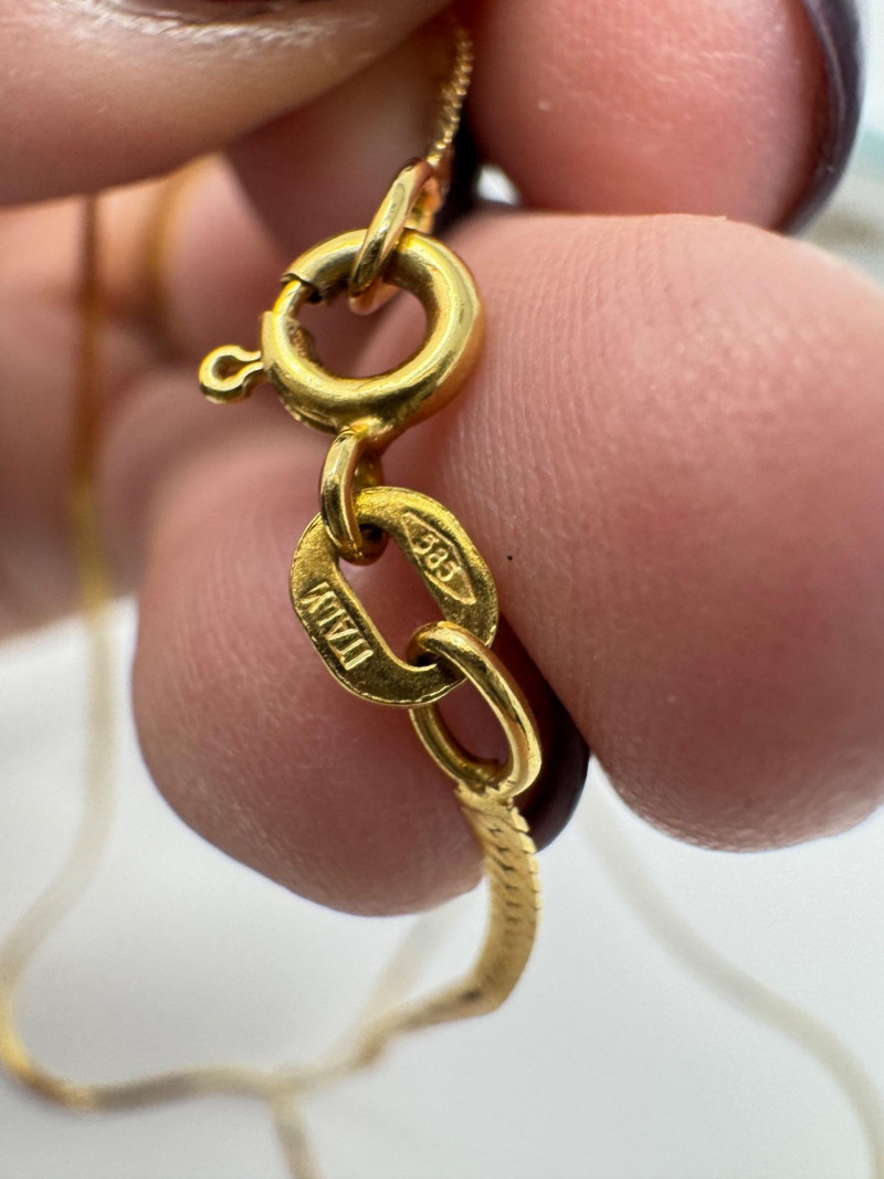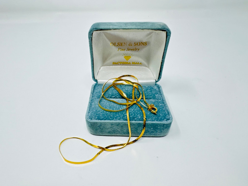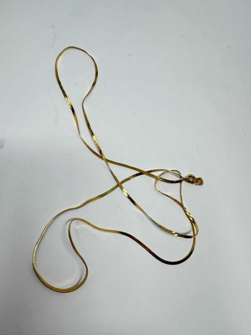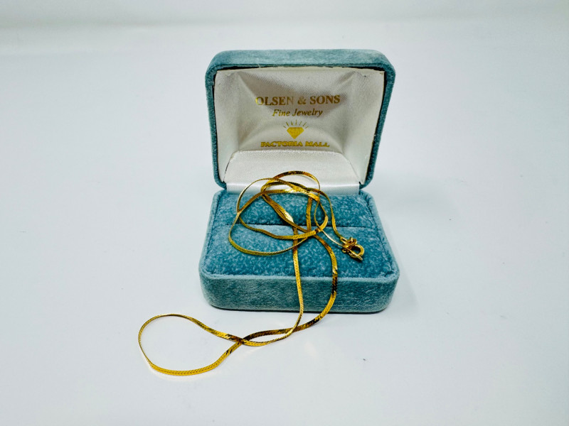 14K Gold Herringbone Chain Necklace – 23” Long, 2.96g. Important Disclaimer: Jewelry in this lot has not been tested. By bidding, you agree to purchase as is, with no guarantees on metal purity, gemstone authenticity, or content. No refunds issued on these factors.
