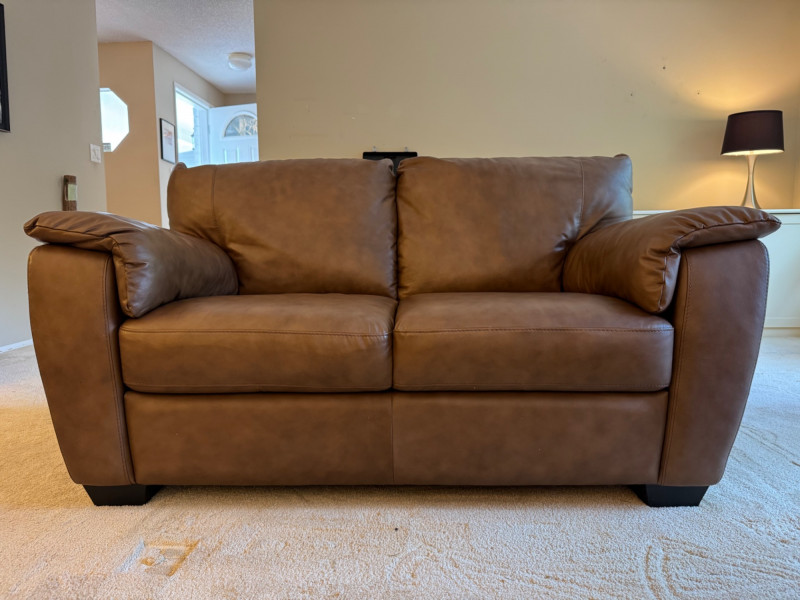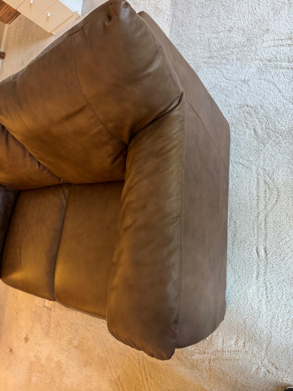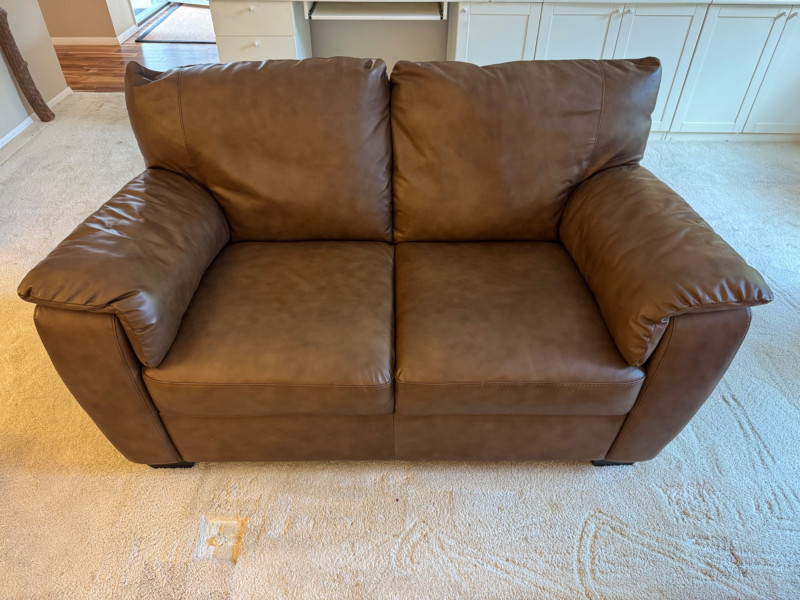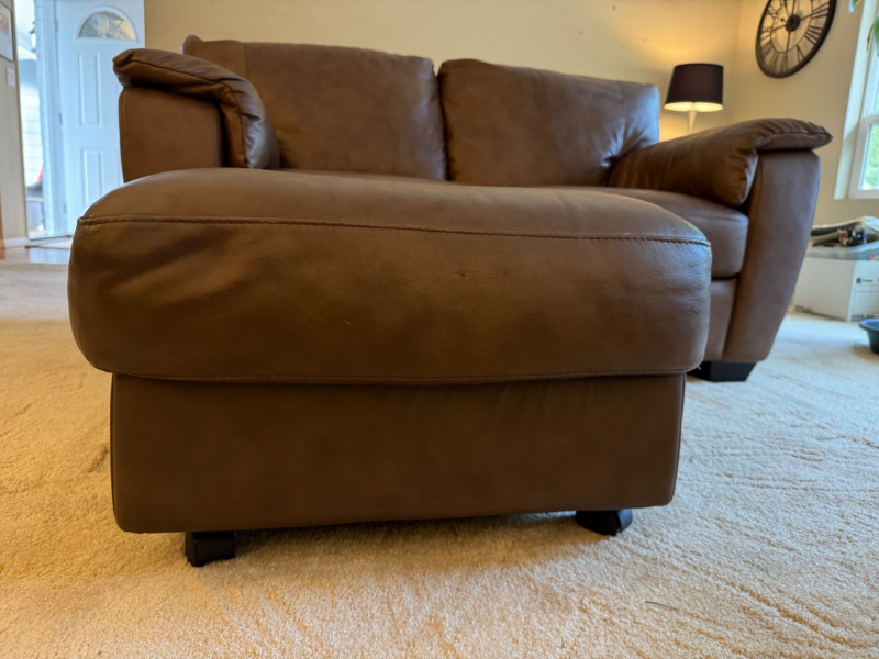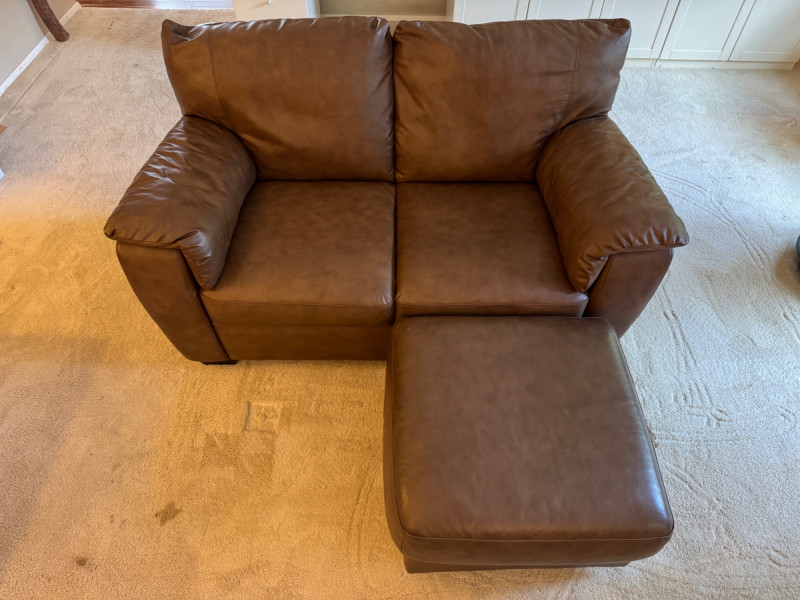 Italsofa Dark Brown Leather Loveseat & Ottoman. Bidding on this lot is an agreement that: (1.) You will have at least 2 capable, able bodied persons to lift and load at a minimum. (2.) You will bring a hand truck and/or any other tools needed to remove this item. If these steps are not followed your item will be forfeit and no refund given.