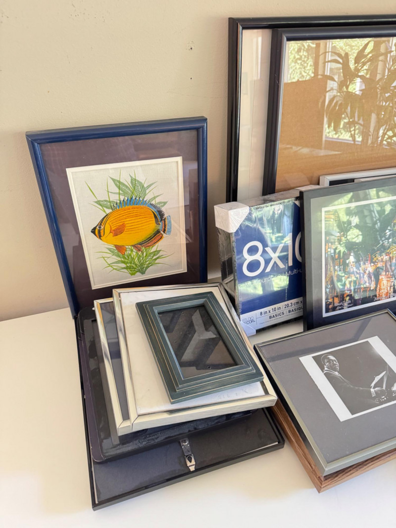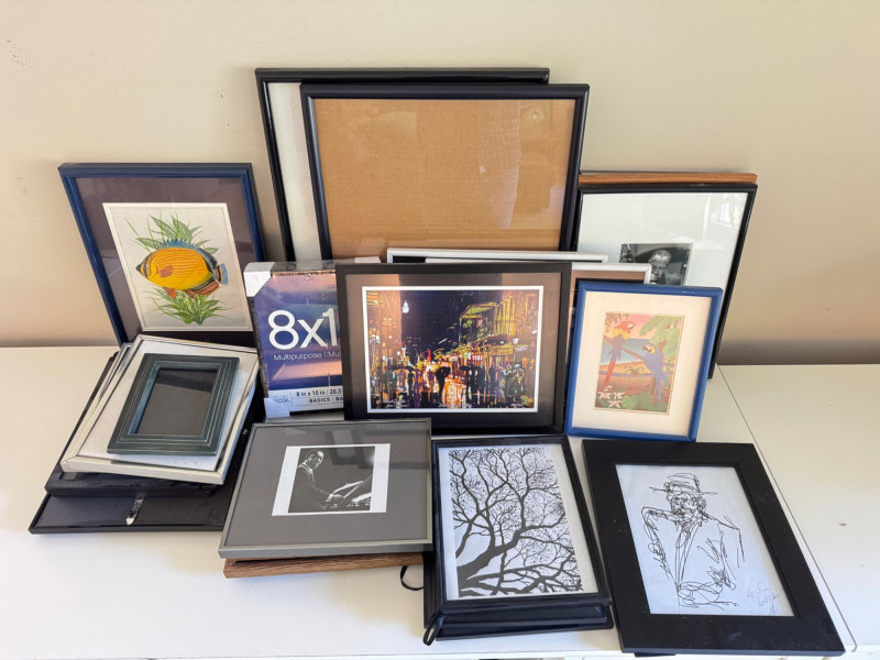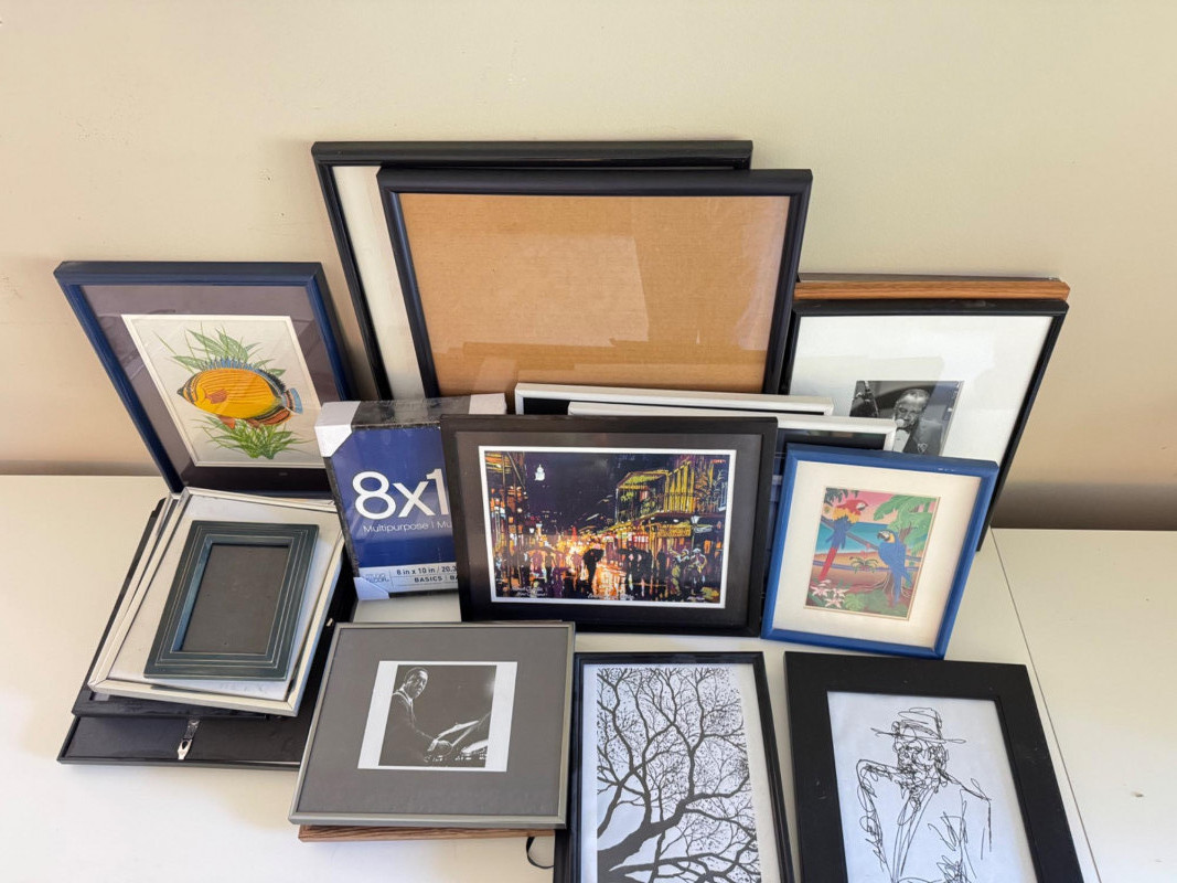 Assorted Picture Frames – Mixed Sizes & Styles, Some w/ Artwork.