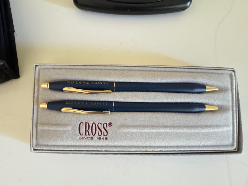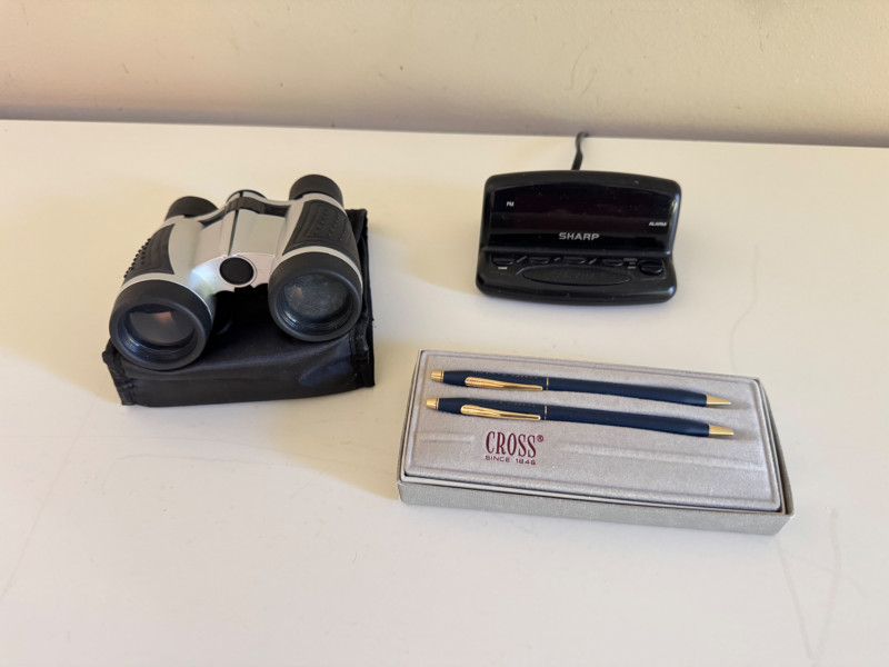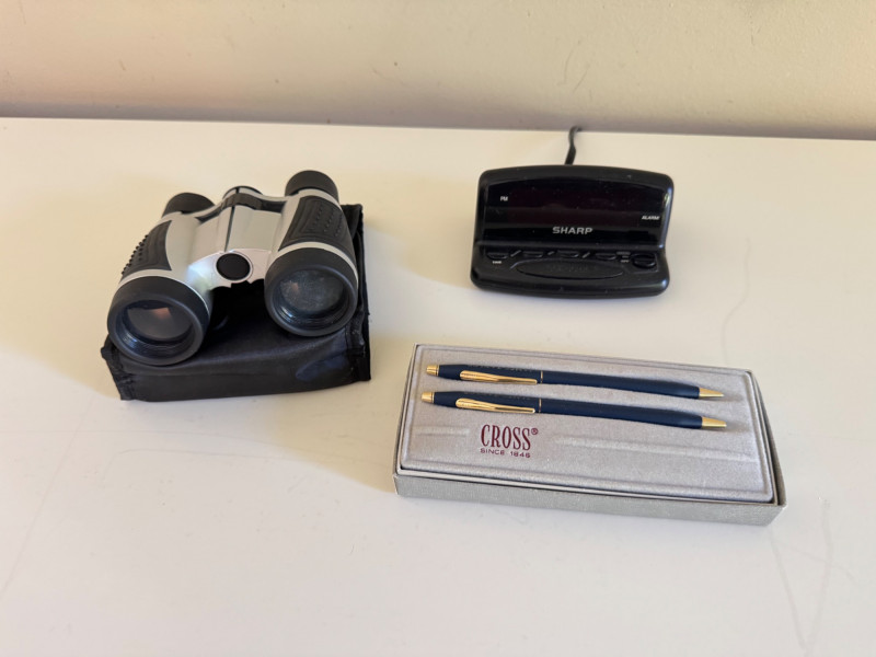 Binoculars, Sharp Table Alarm Clock & Set of 2 Cross Fine Pens.