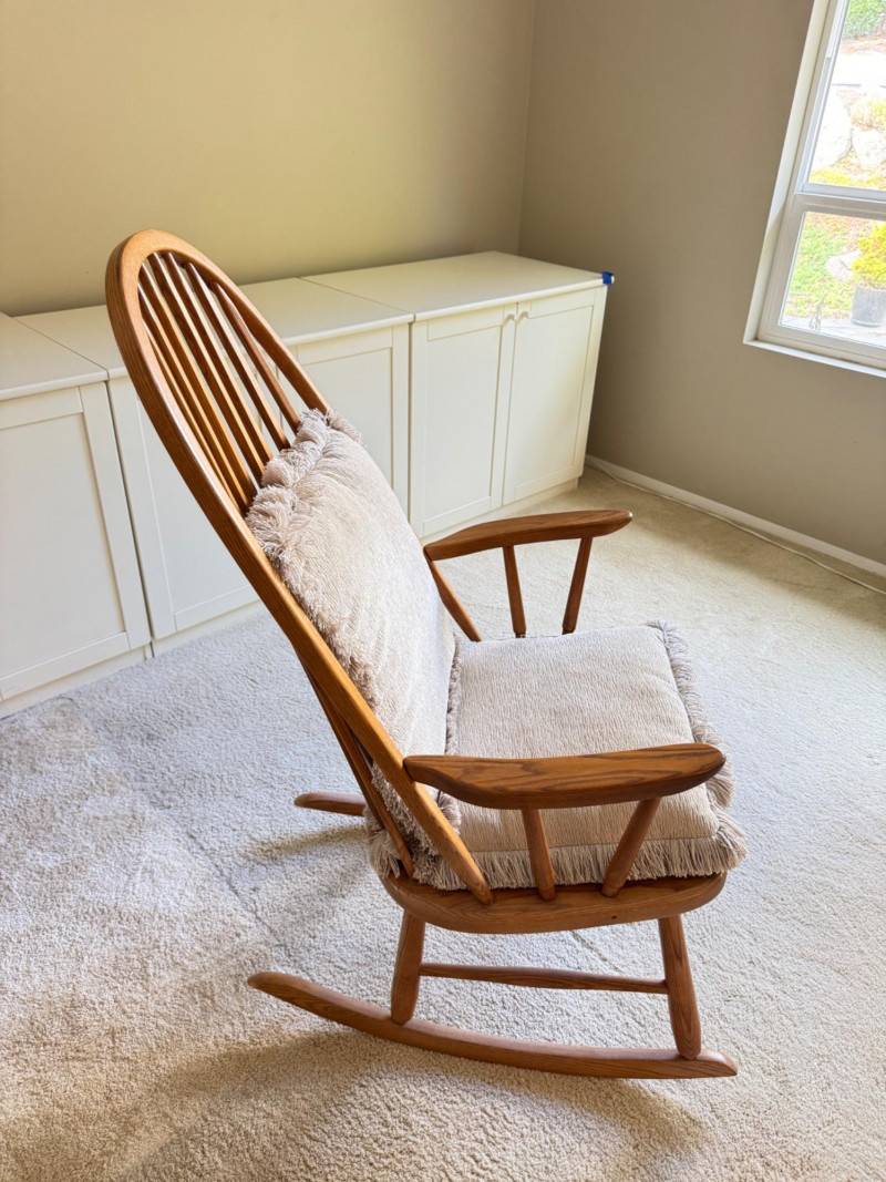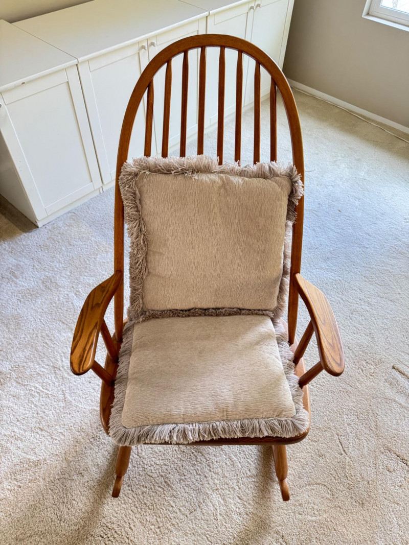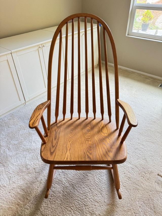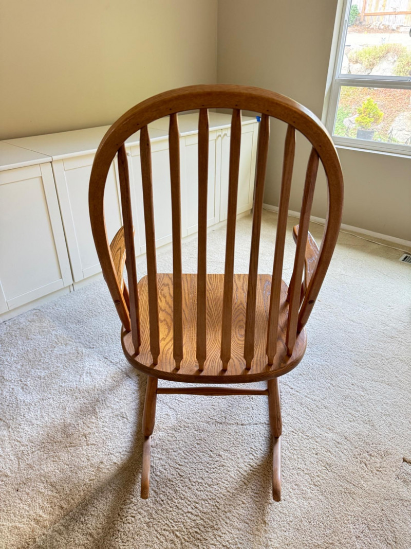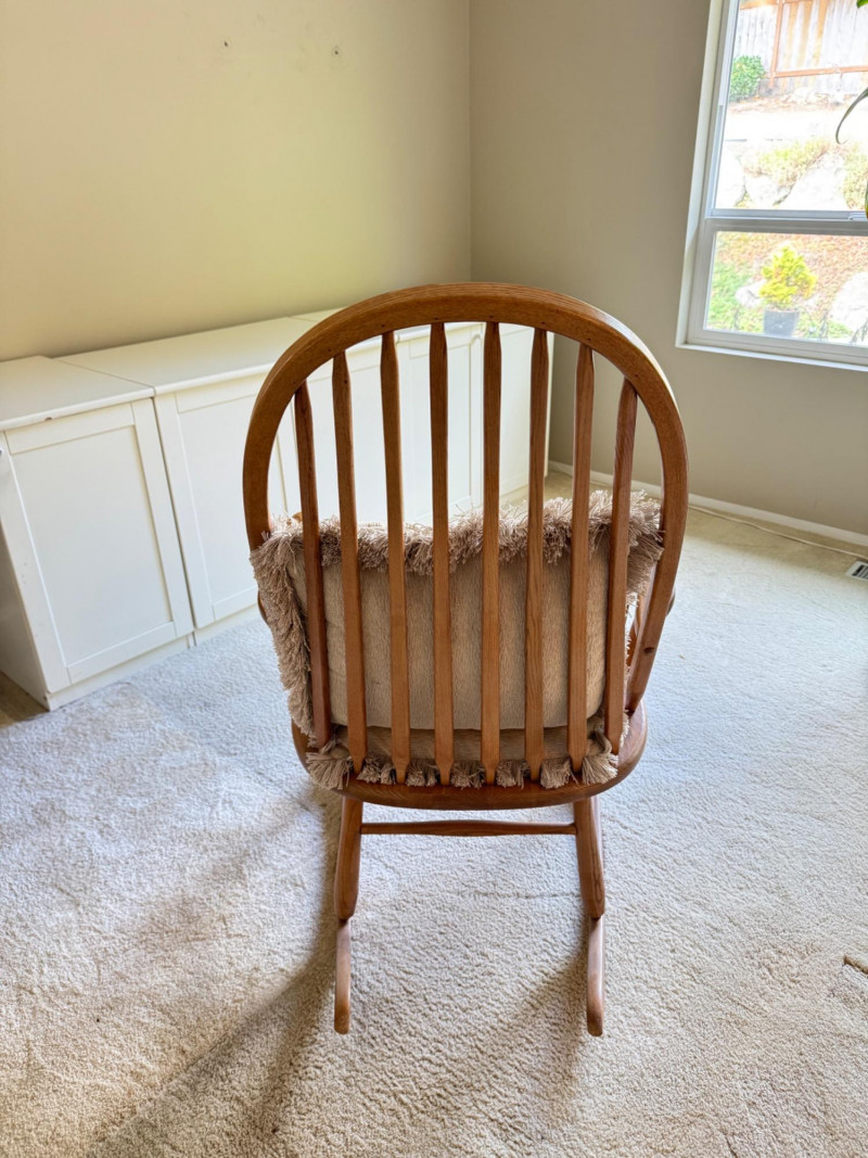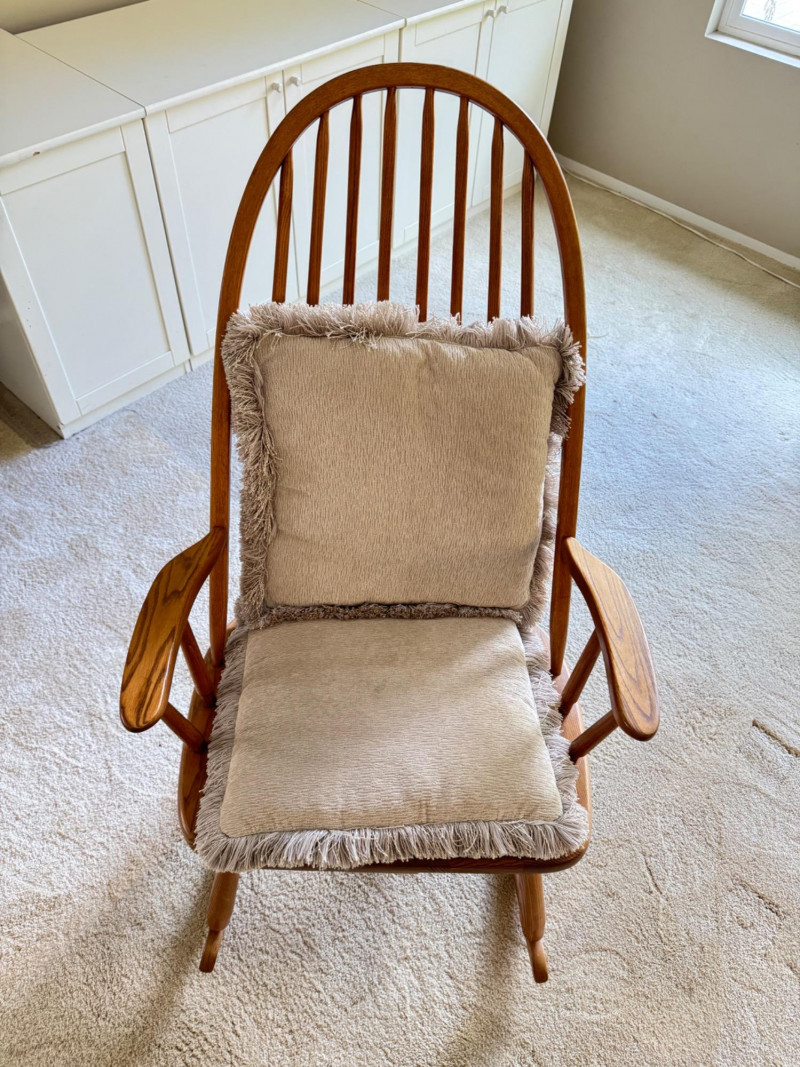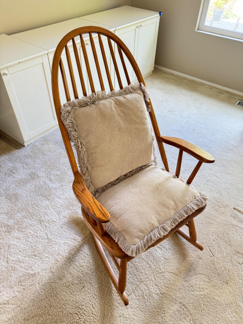 Wooden Rocking Chair w/ Tall Slat Back & Cushions.
