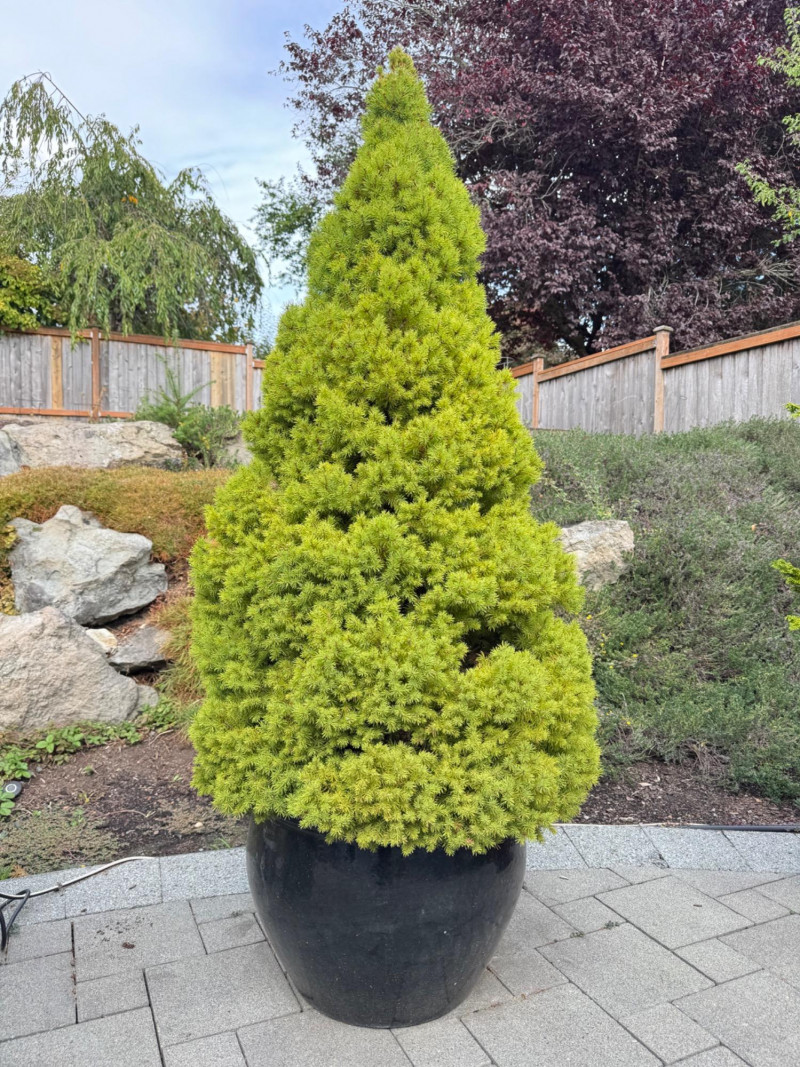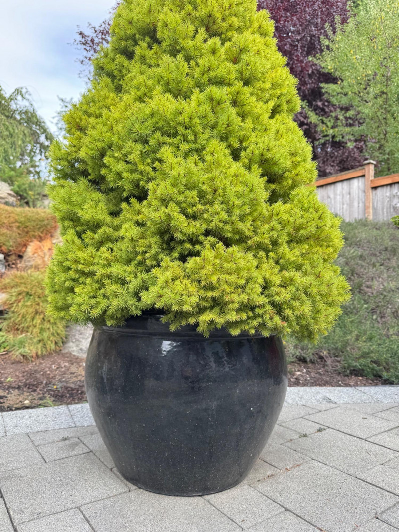 Outdoor Lush Evergreen Tree in Black Glazed Pot – 65" Tall.