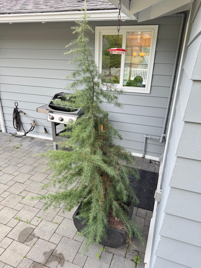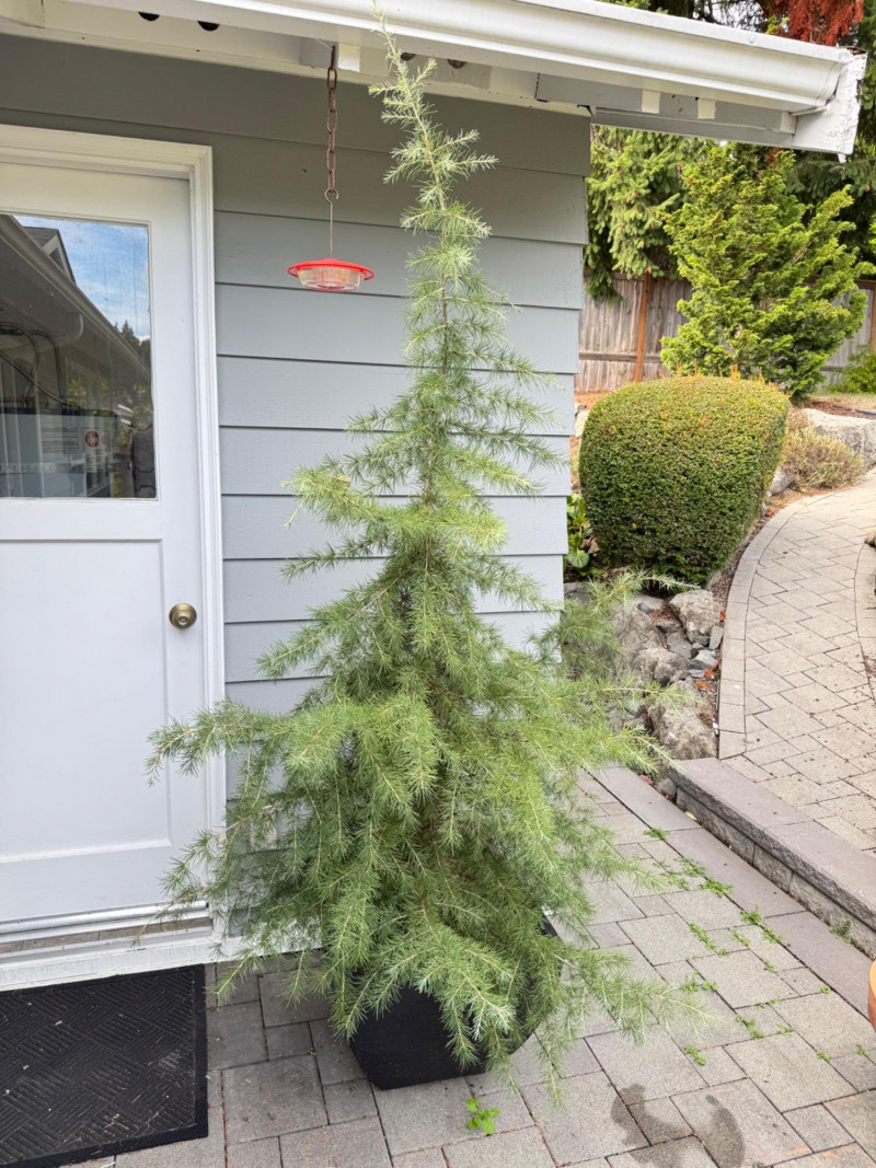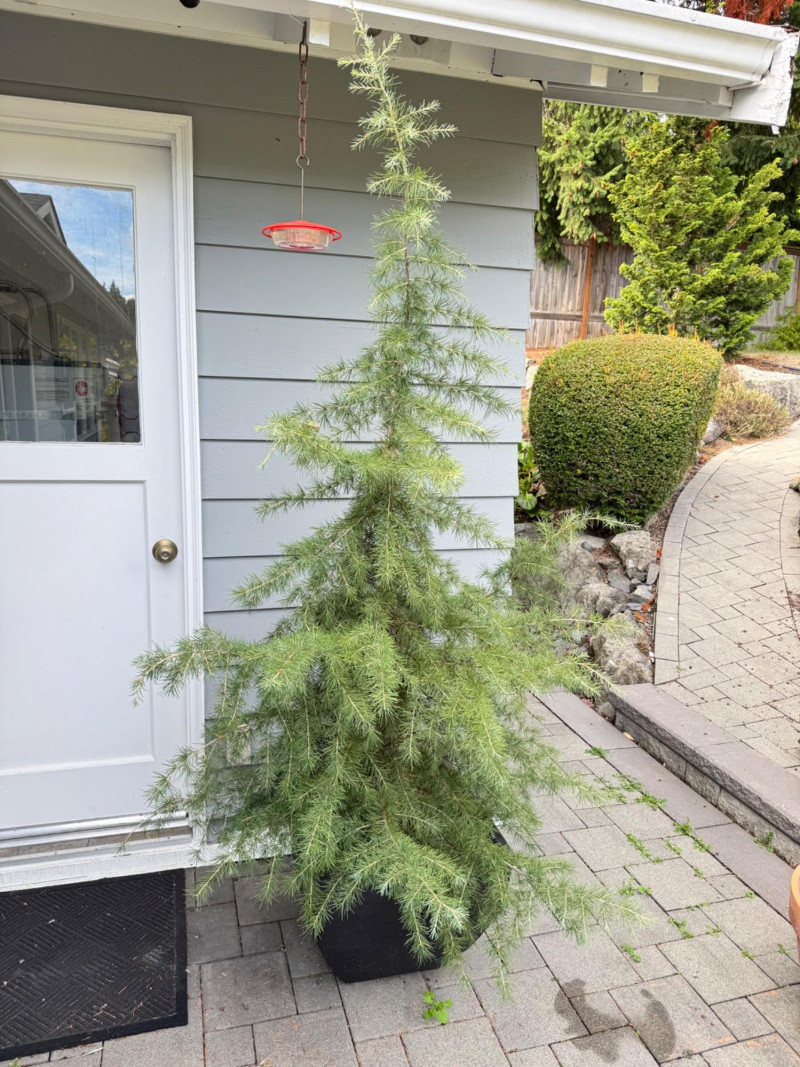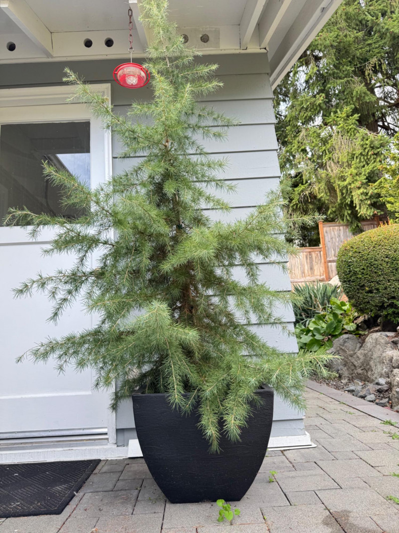 Tall Evergreen Outdoor Plant in Rectangular Black Pot – 89" Height. Note: This is a heavy item and will require at least two people or a dolly for transport.