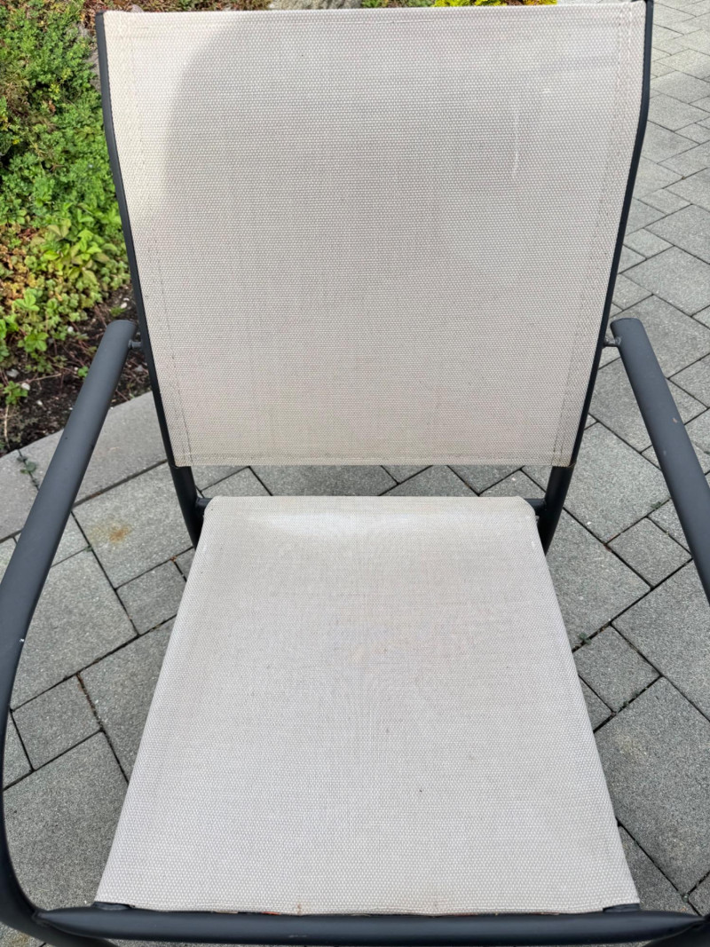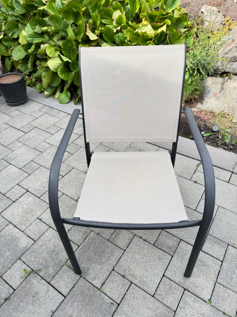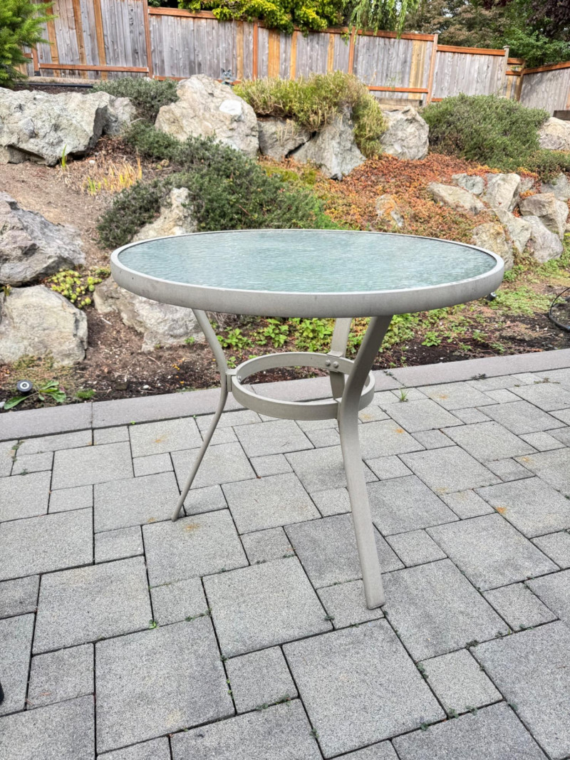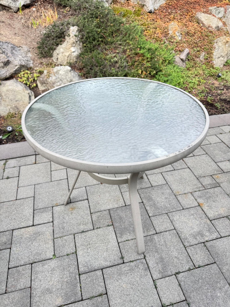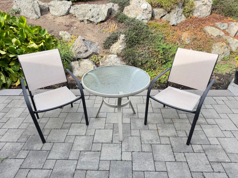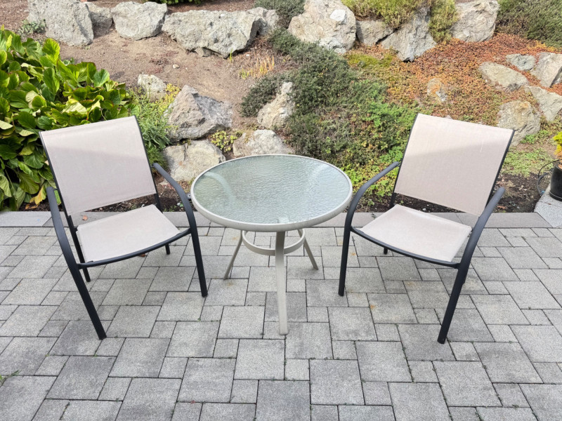 Outdoor Patio Set – Round Glass Table & 2 Sling Chairs.