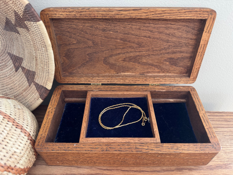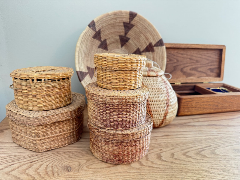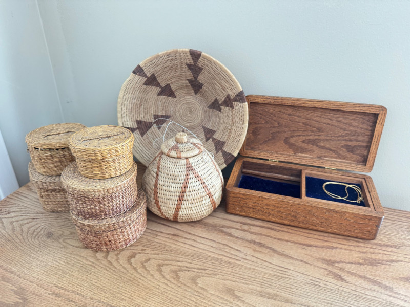 Woven Basket & Wood Box Lot: Lidded Baskets, Dome Basket & Jewelry Box.