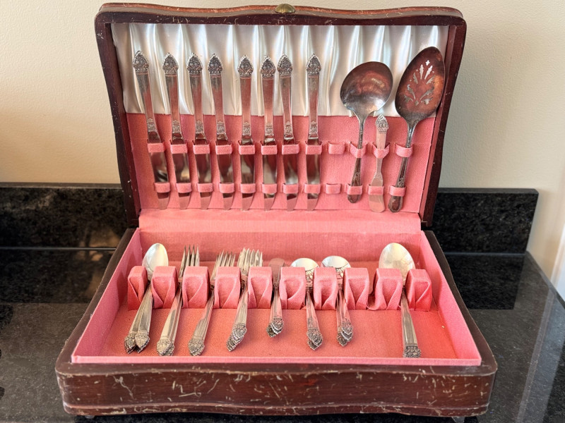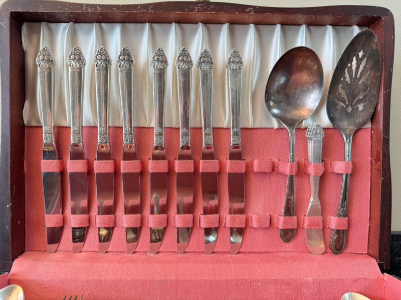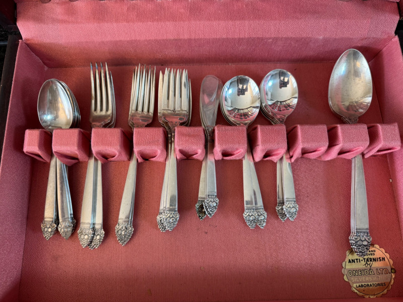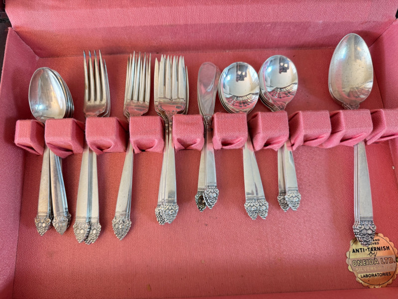 Oneida Sterling “King Cedric” Silverware Set – 53 Pcs in Wooden Chest. Quantity: