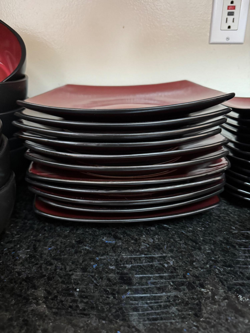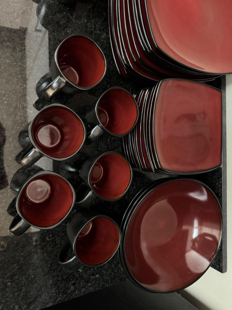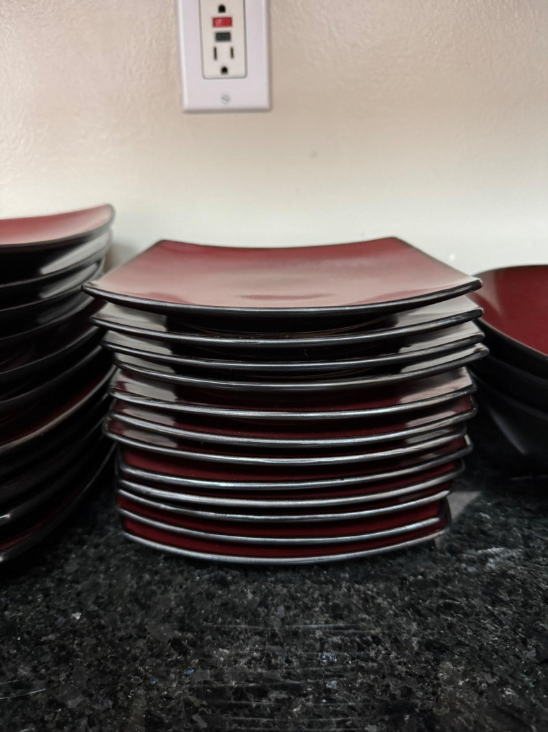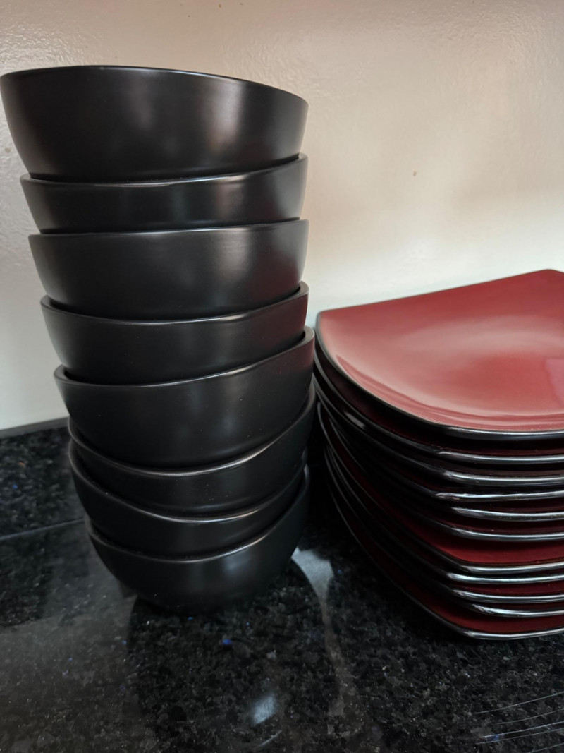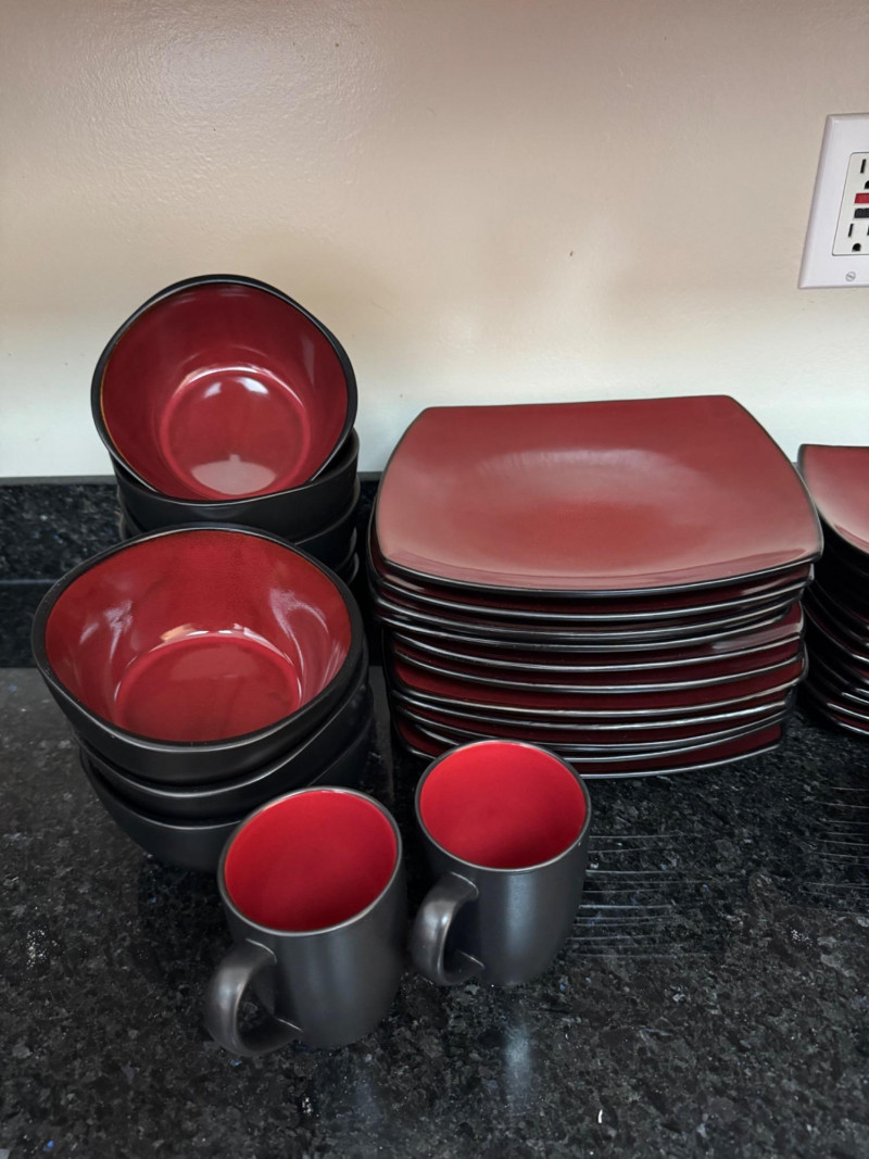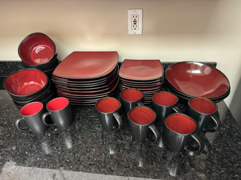 Large Red & Black Square Dinnerware Collection w/ Mugs & Bowls.