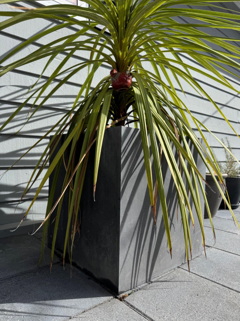 Tall Dracaena Marginata in Rectangular Pot – Outdoor Ready. Pot: 19.5” W x 19.5” D x 19.5” H Overall height (including plant): 65”