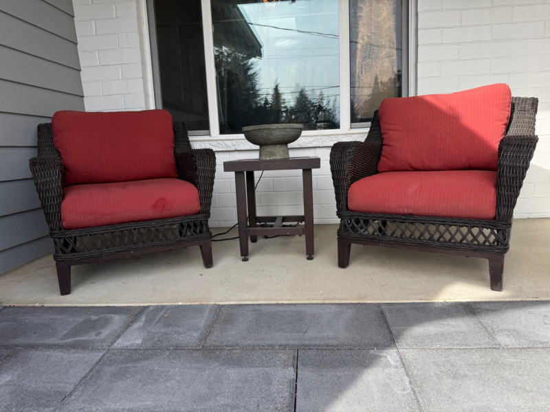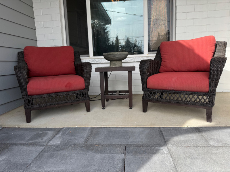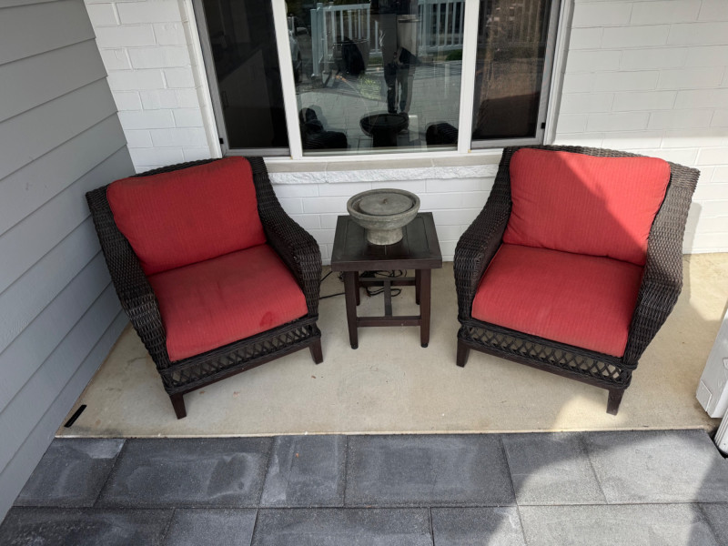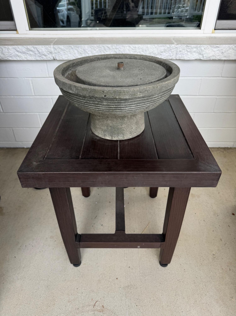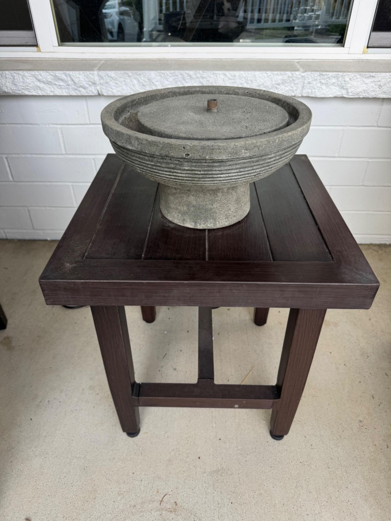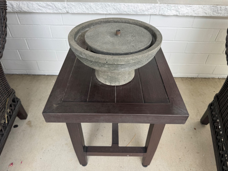2 Wicker Patio Chairs, Wood Table & Small Concrete Fountain. Table: 19” W x 19” D x 21” H Chairs: 32” W x 31” D x 30” H Seat area: 23” W x 19” D x 17” H Fountain: 13” diameter