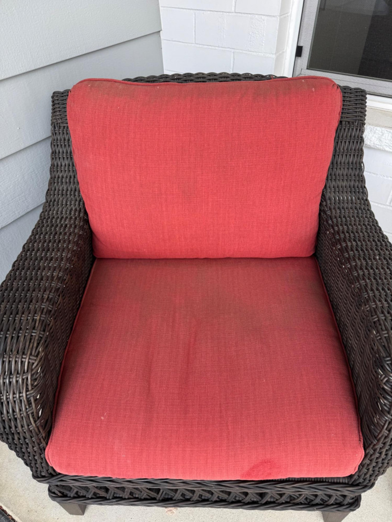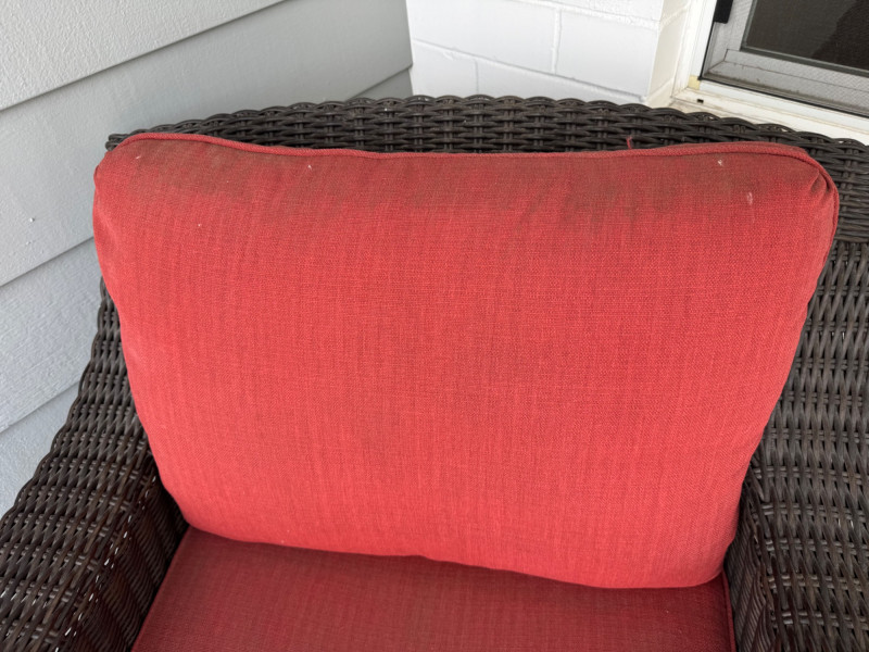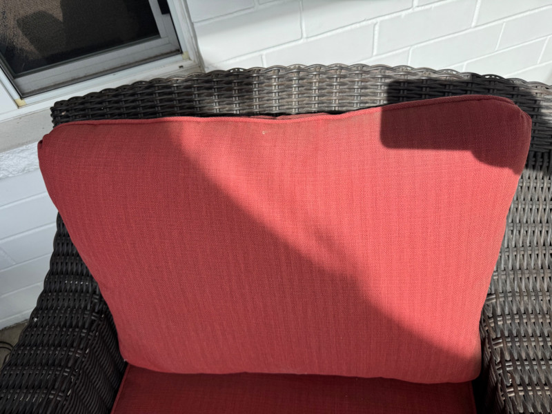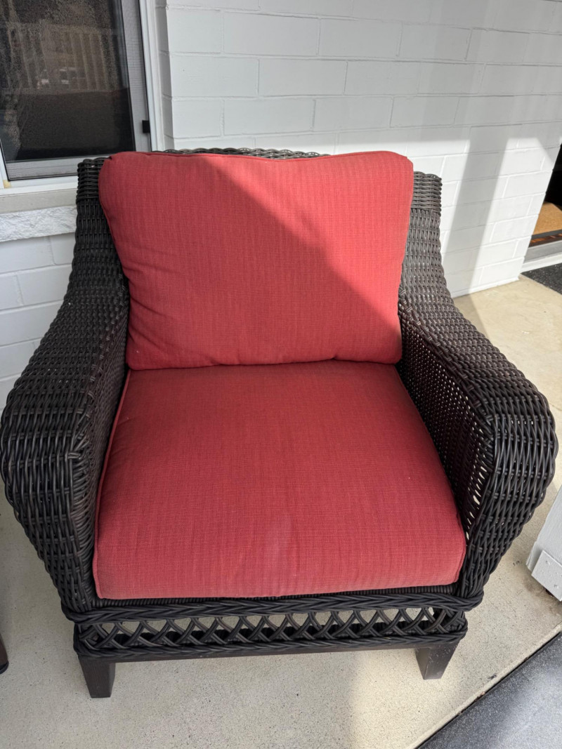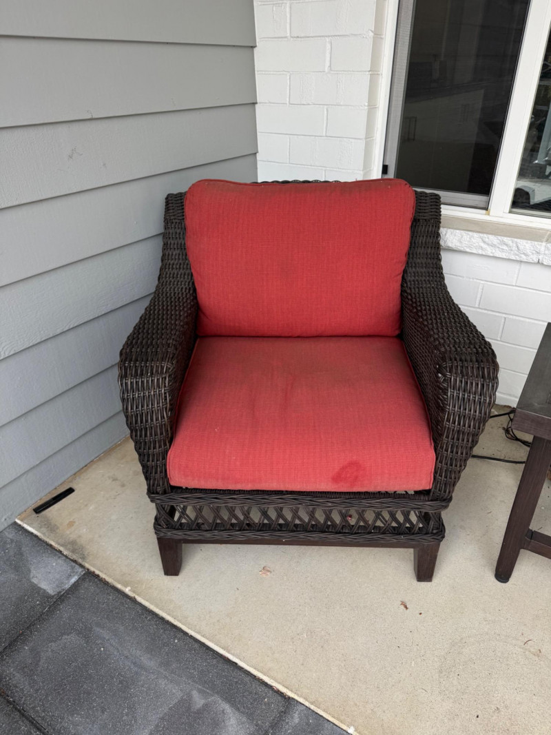 2 Wicker Patio Chairs, Wood Table & Small Concrete Fountain. Table: 19” W x 19” D x 21” H Chairs: 32” W x 31” D x 30” H Seat area: 23” W x 19” D x 17” H Fountain: 13” diameter