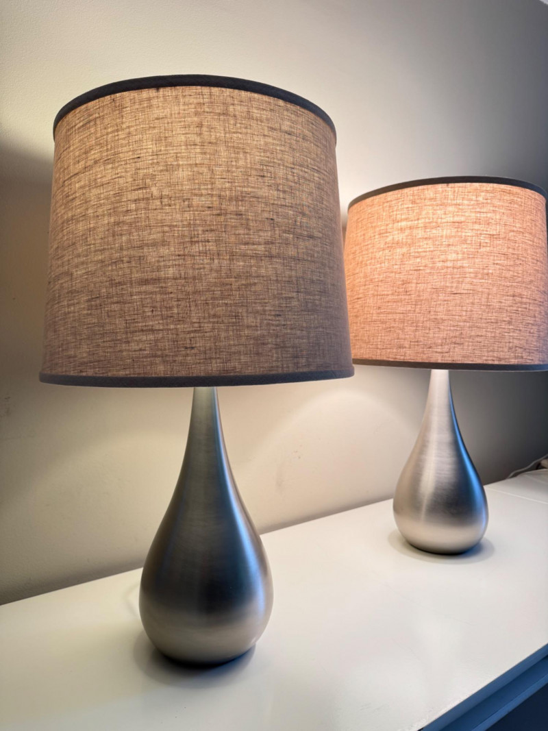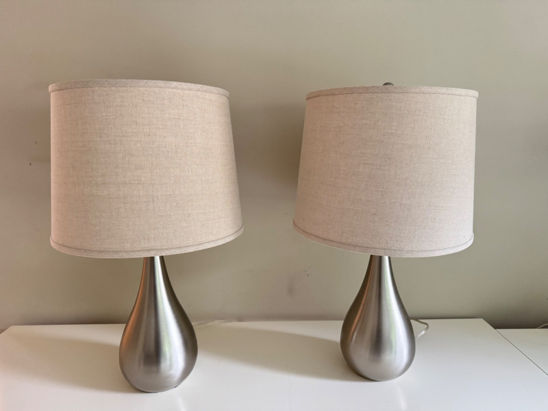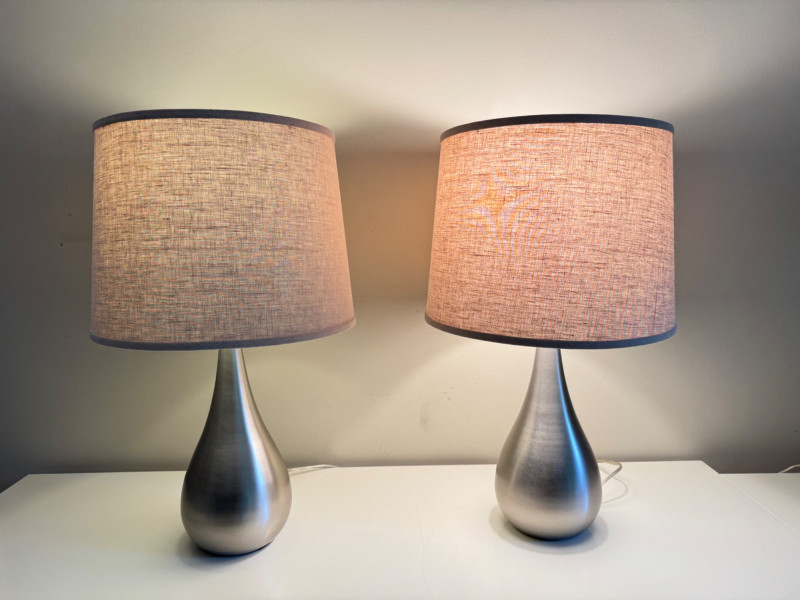 Set of 2 Brushed Steel Lamps – Teardrop Base & Fabric Drum Shade. Lamp height: 28.5” Shade: 17” W x 13” H