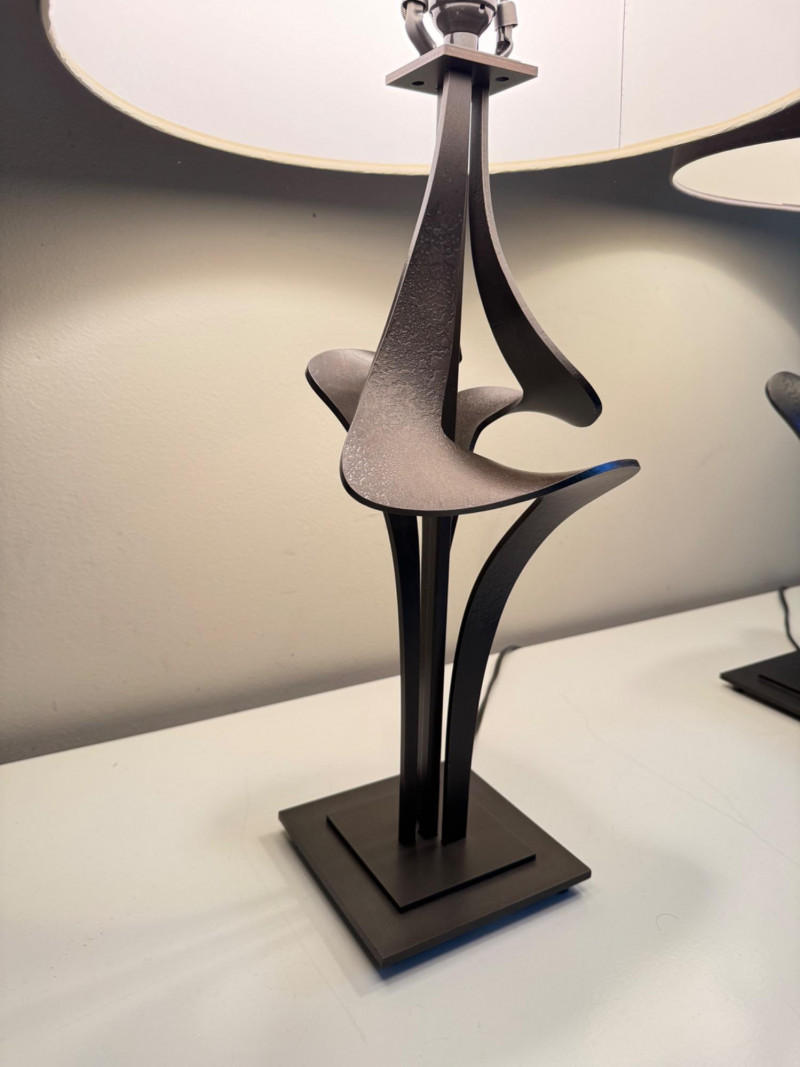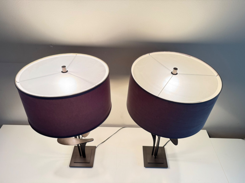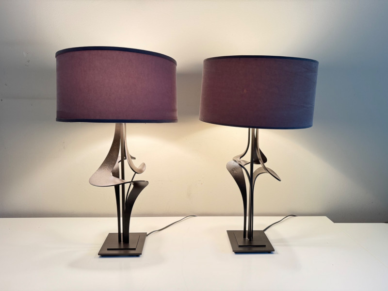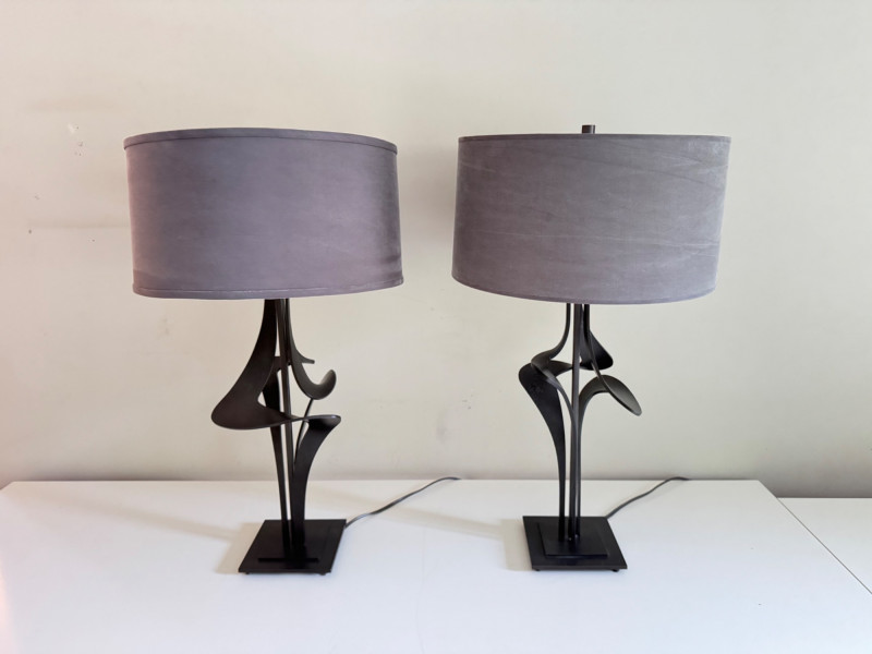Hubbardton Forge–Style Table Lamps – Antasia Design Est. $1,000+ Each. Lamp height: 26.5” Shade: 15” W x 8” H Material: heavy metal base