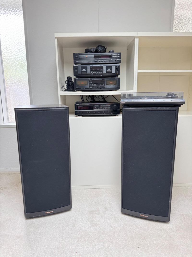 Complete Vintage Audio System – Denon, Technics & Klipsch. Speakers: 14.5” W x 14” D x 34” H Note: Buyer is responsible for disconnecting and removing all equipment; cords and cables are attached.