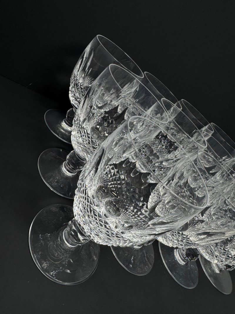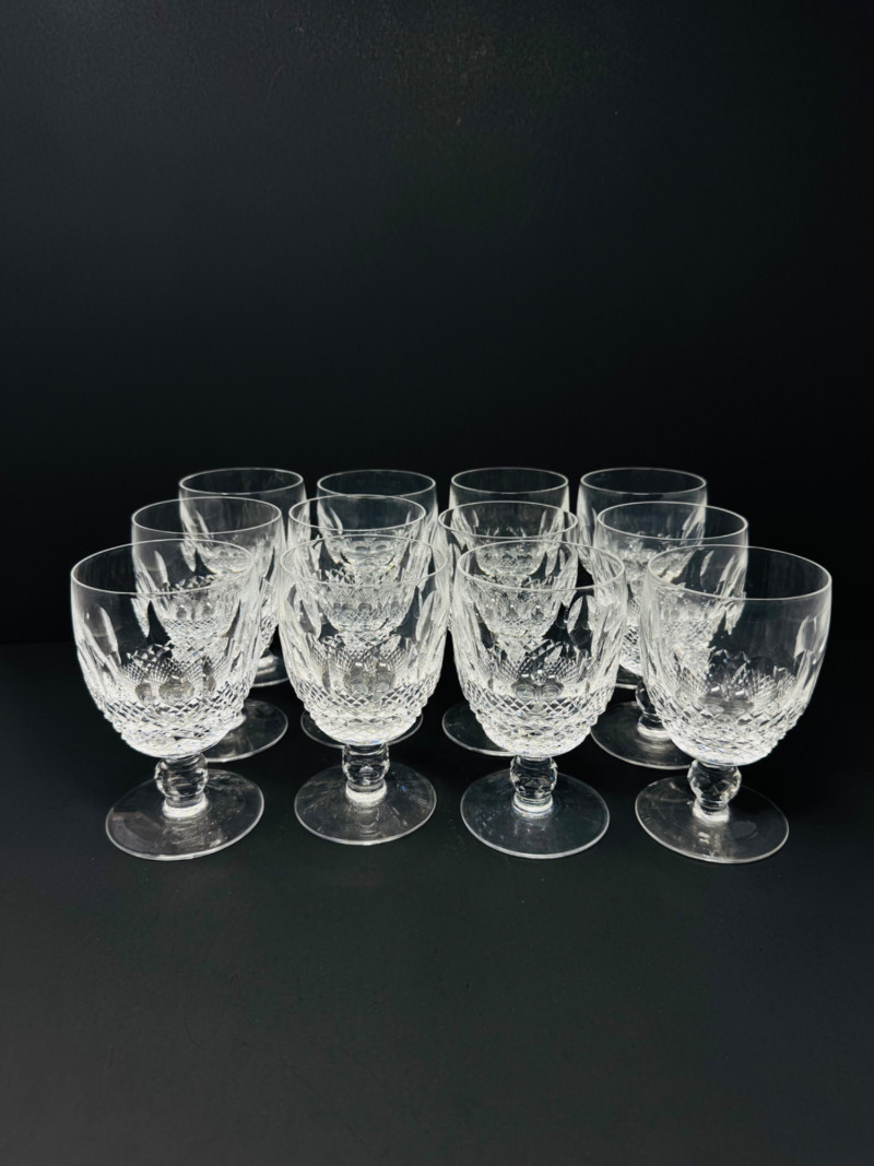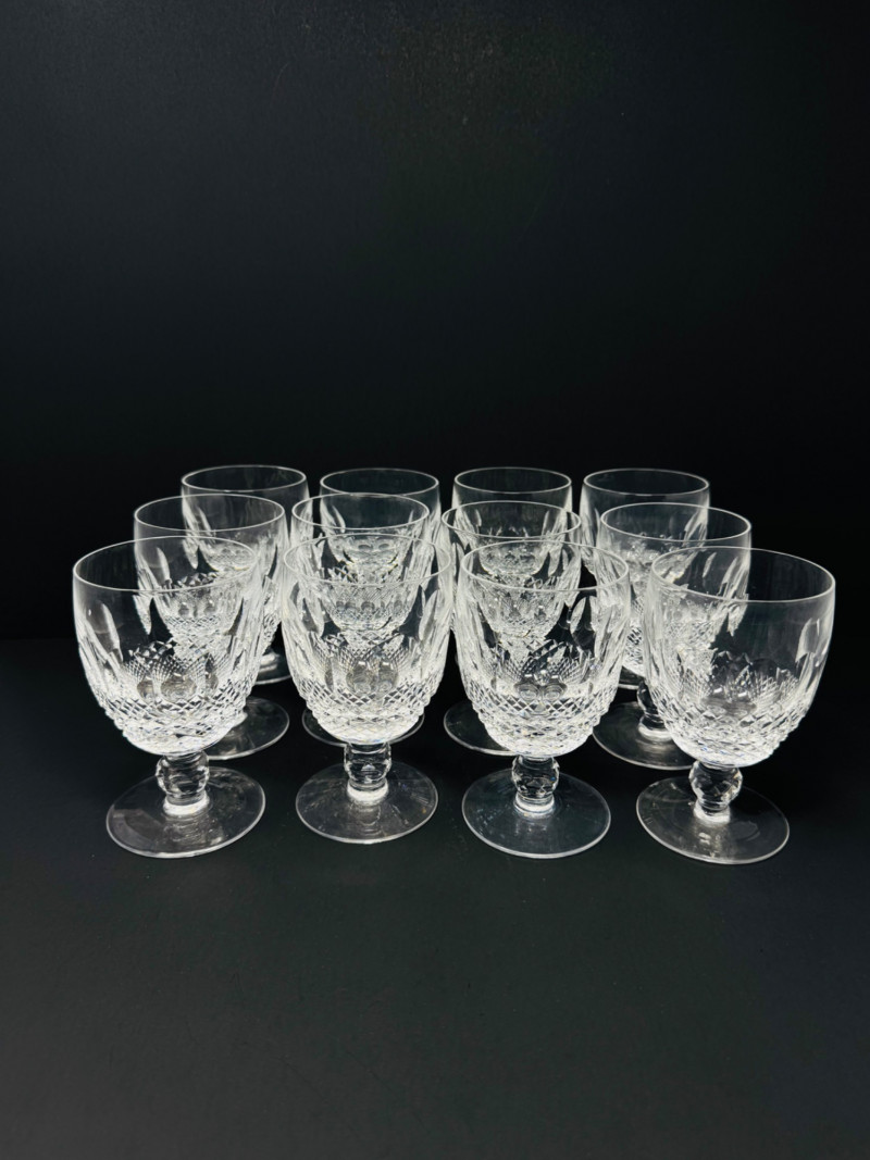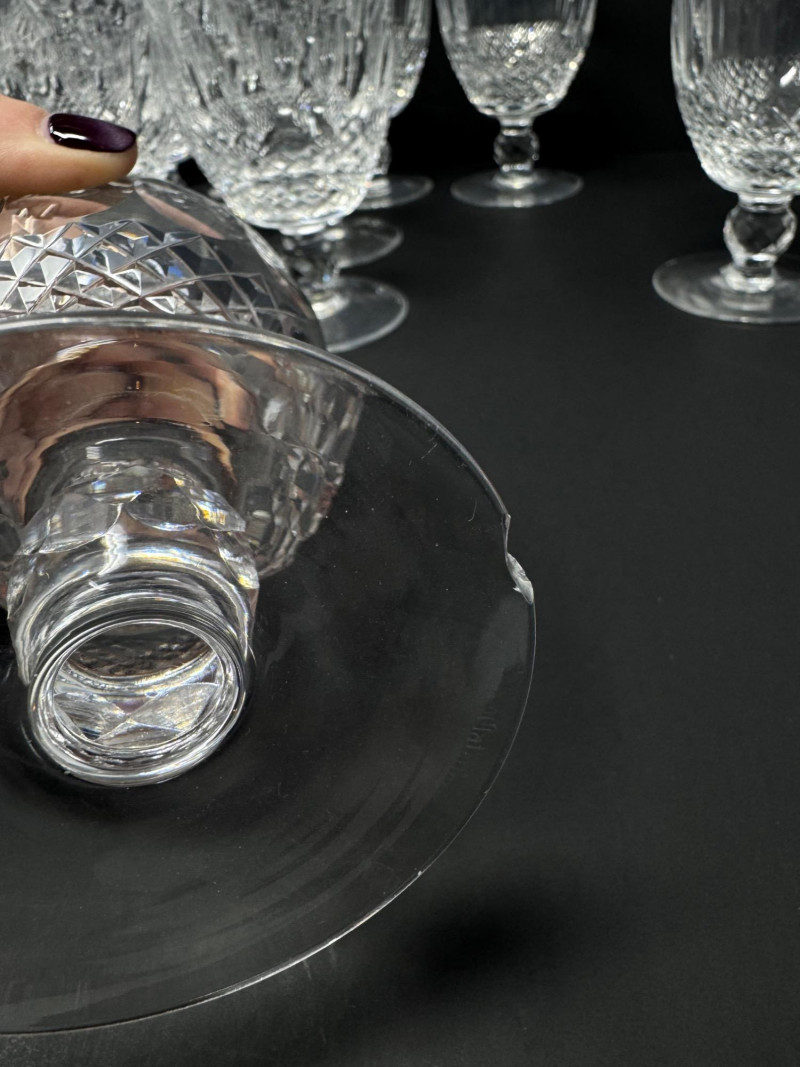 Set of 12 Waterford Colleen Crystal Short Stem Water Goblets – 5.25”. Approx. 5.25” tall Condition: one glass has a small chip on the base.