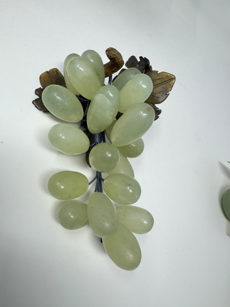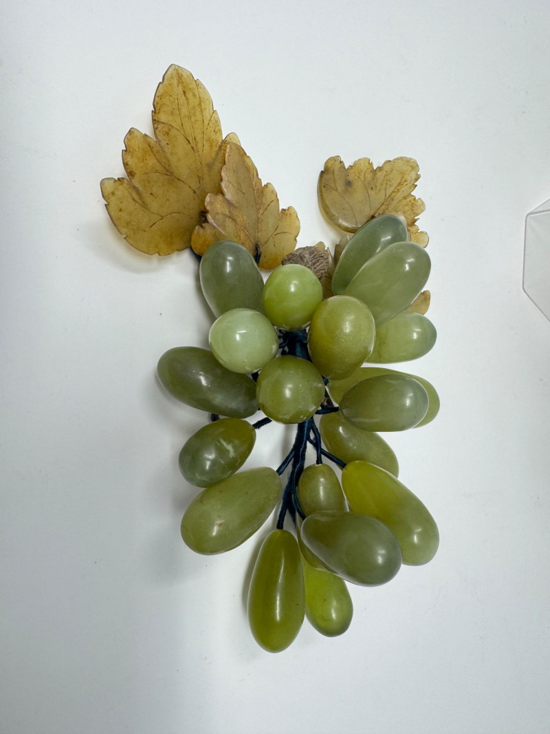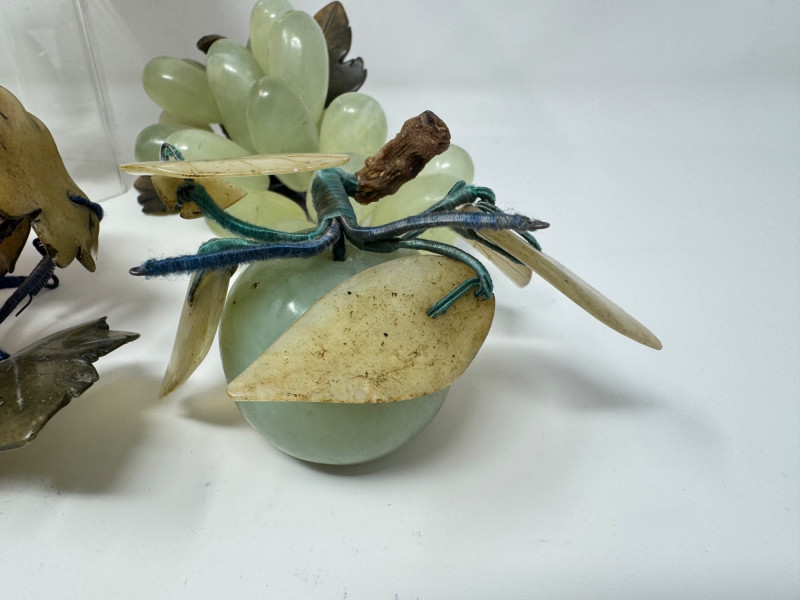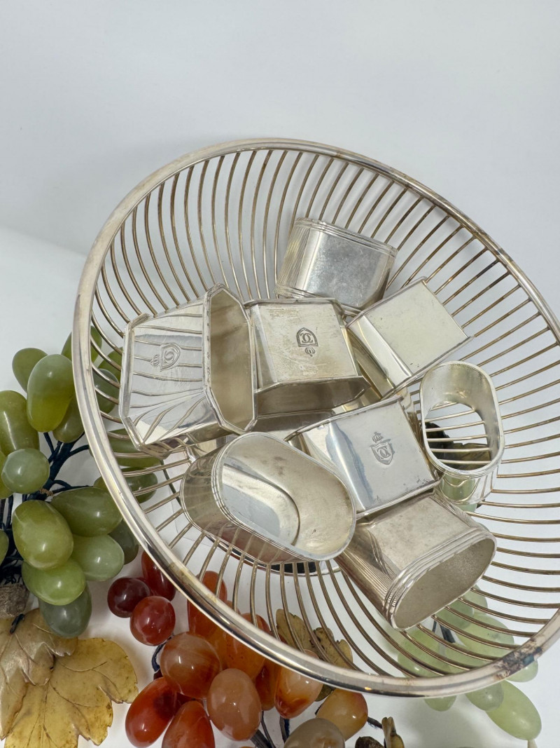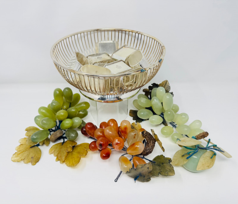 Jade Grapes & Apple Lot w/ Silver Plate Bowl & Napkin Rings. Set of hand-carved jade stone fruit, including: (3) jade grape clusters, approx. 6–7” long, in shades of celadon, green, and amber (1) jade apple with carved leaves (one leaf broken) Accompanied by a silver-plated wire bowl and a group of silver-plated napkin rings.