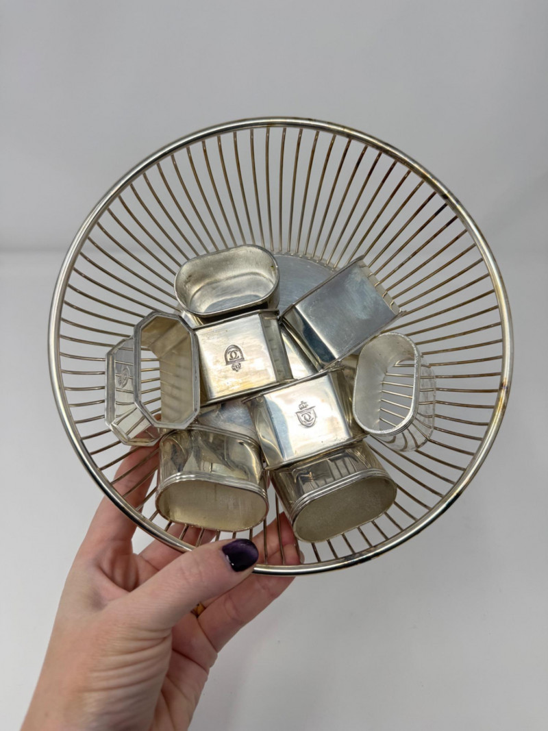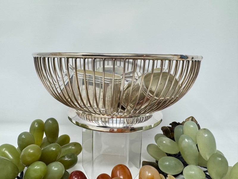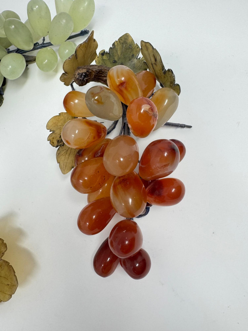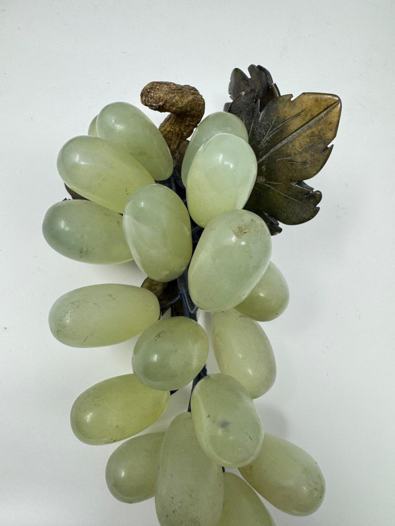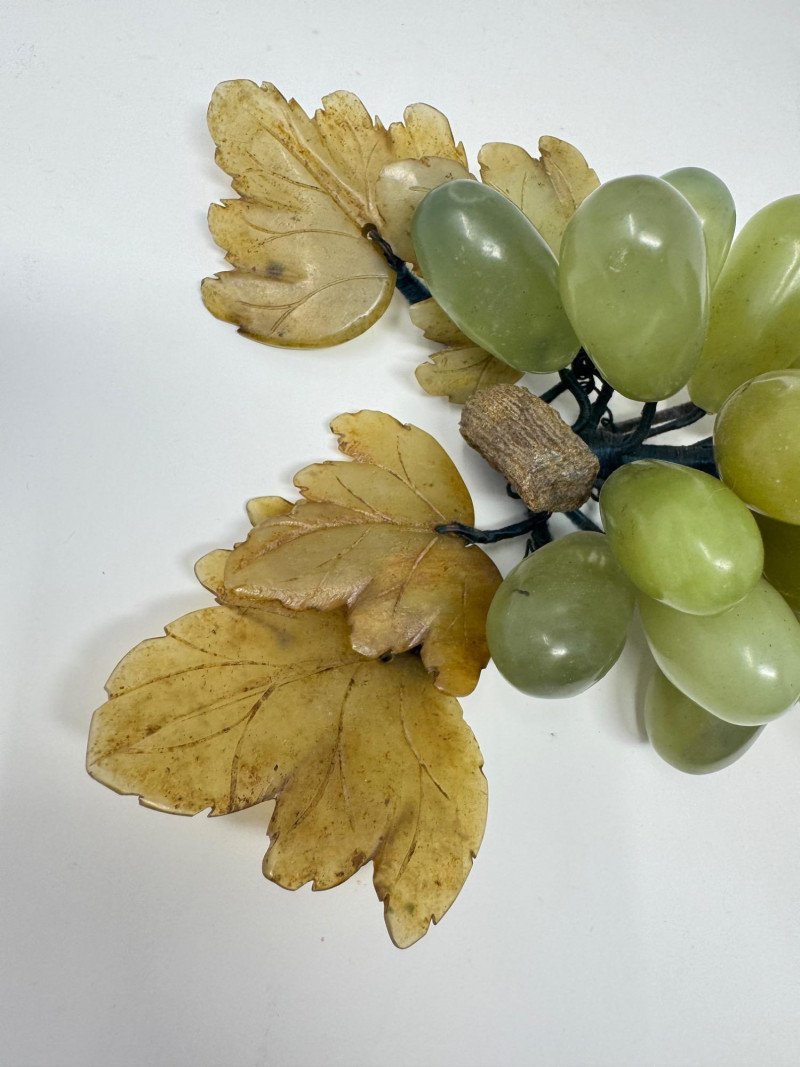 Jade Grapes & Apple Lot w/ Silver Plate Bowl & Napkin Rings. Set of hand-carved jade stone fruit, including: (3) jade grape clusters, approx. 6–7” long, in shades of celadon, green, and amber (1) jade apple with carved leaves (one leaf broken) Accompanied by a silver-plated wire bowl and a group of silver-plated napkin rings.
