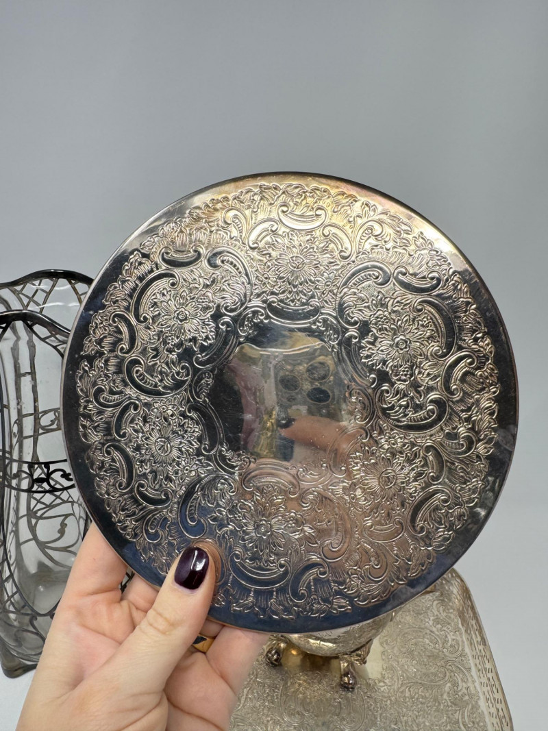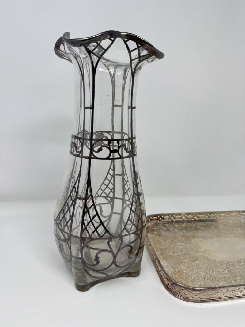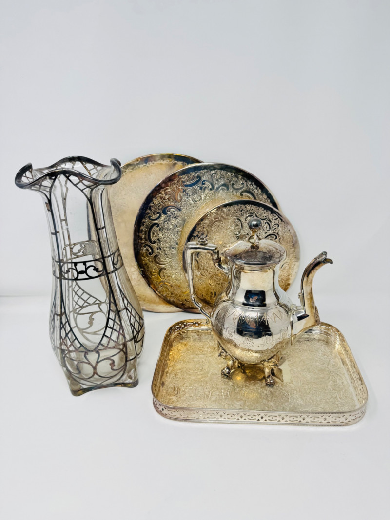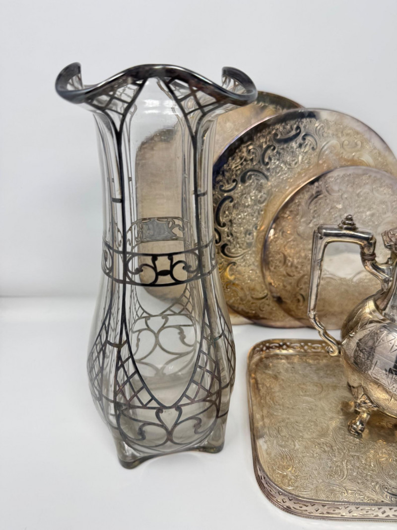 Antique Silverplate & Glass Lot – Barker Ellis, Rogers & Smith Style, Sterling Vase. Disclaimer: Metals are not tested. All items are sold as is with no guarantees on metal content or purity. No refunds based on metal quality.