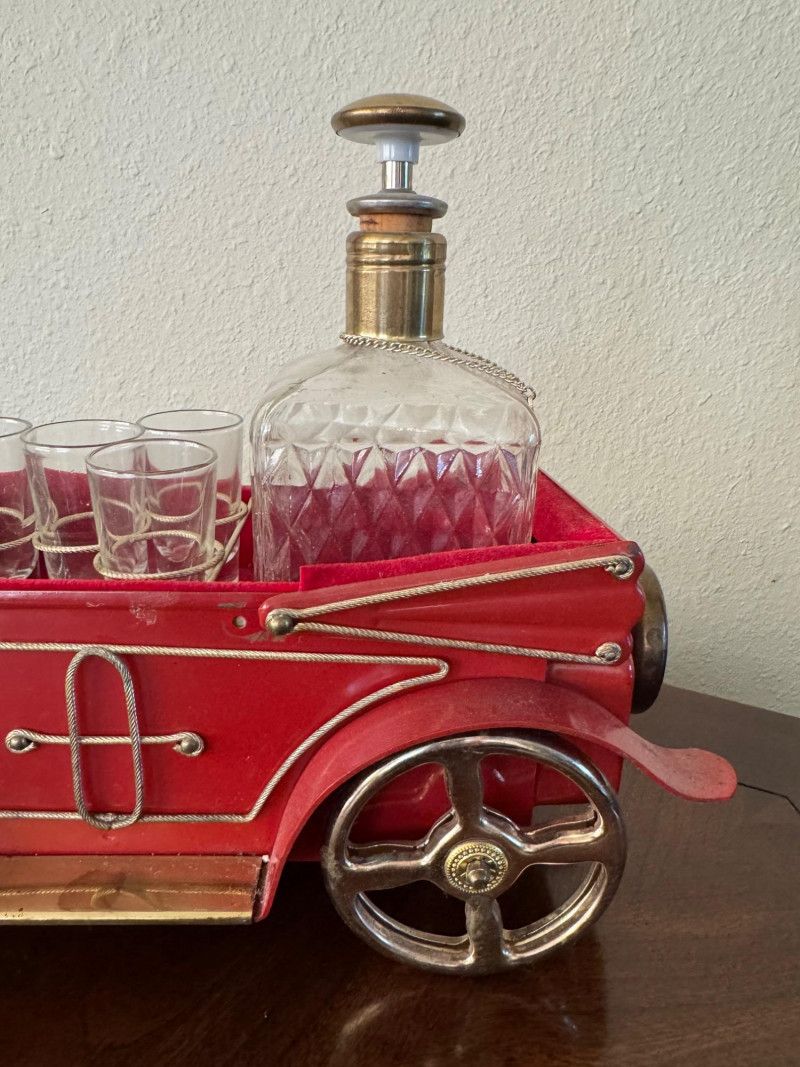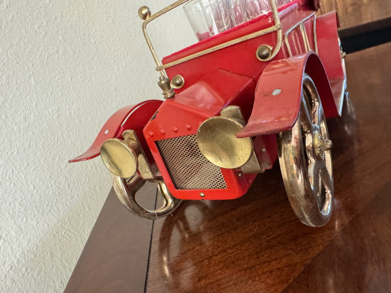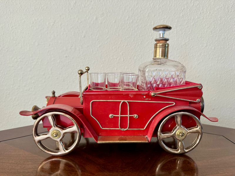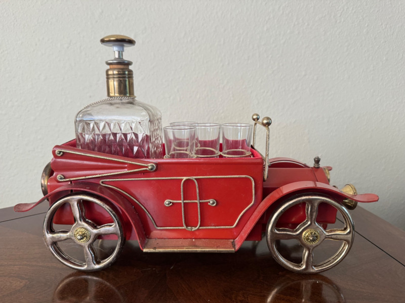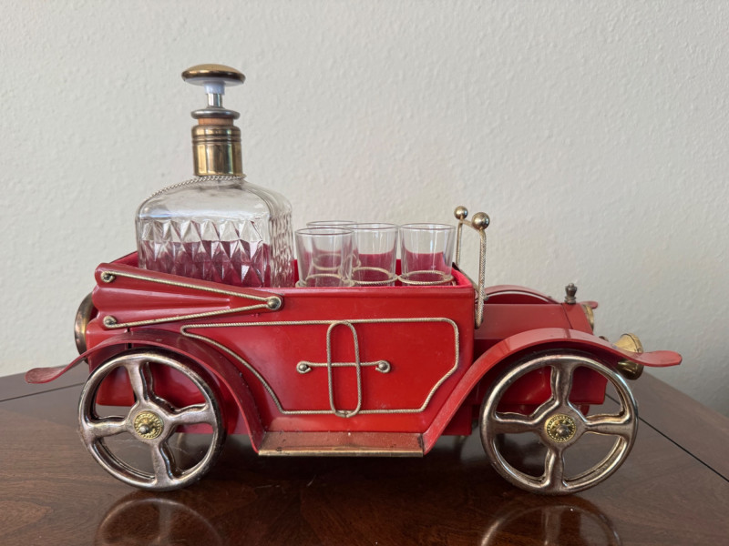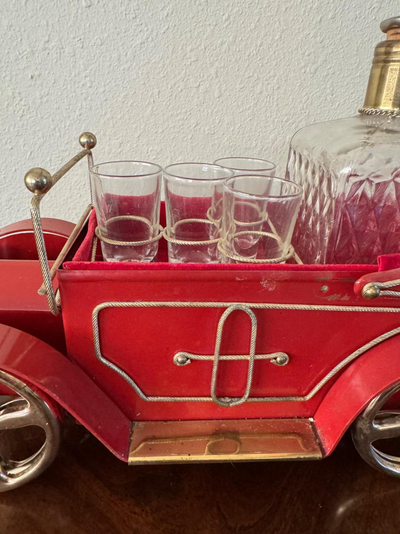 Vintage Red Car Bar Set – Decanter & 4 Shot Glasses – 13.5” Long.