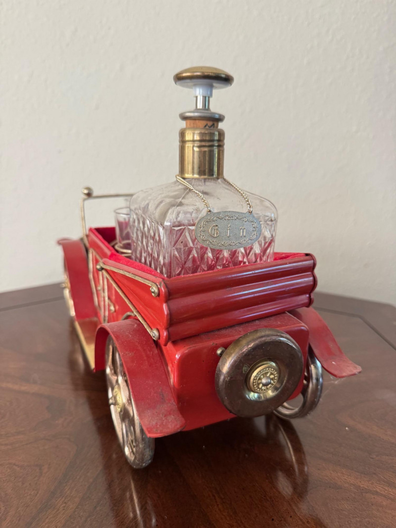 Lot # 5 - Vintage Red Car Bar Set – Decanter & 4 Shot Glasses – 13.5” Long