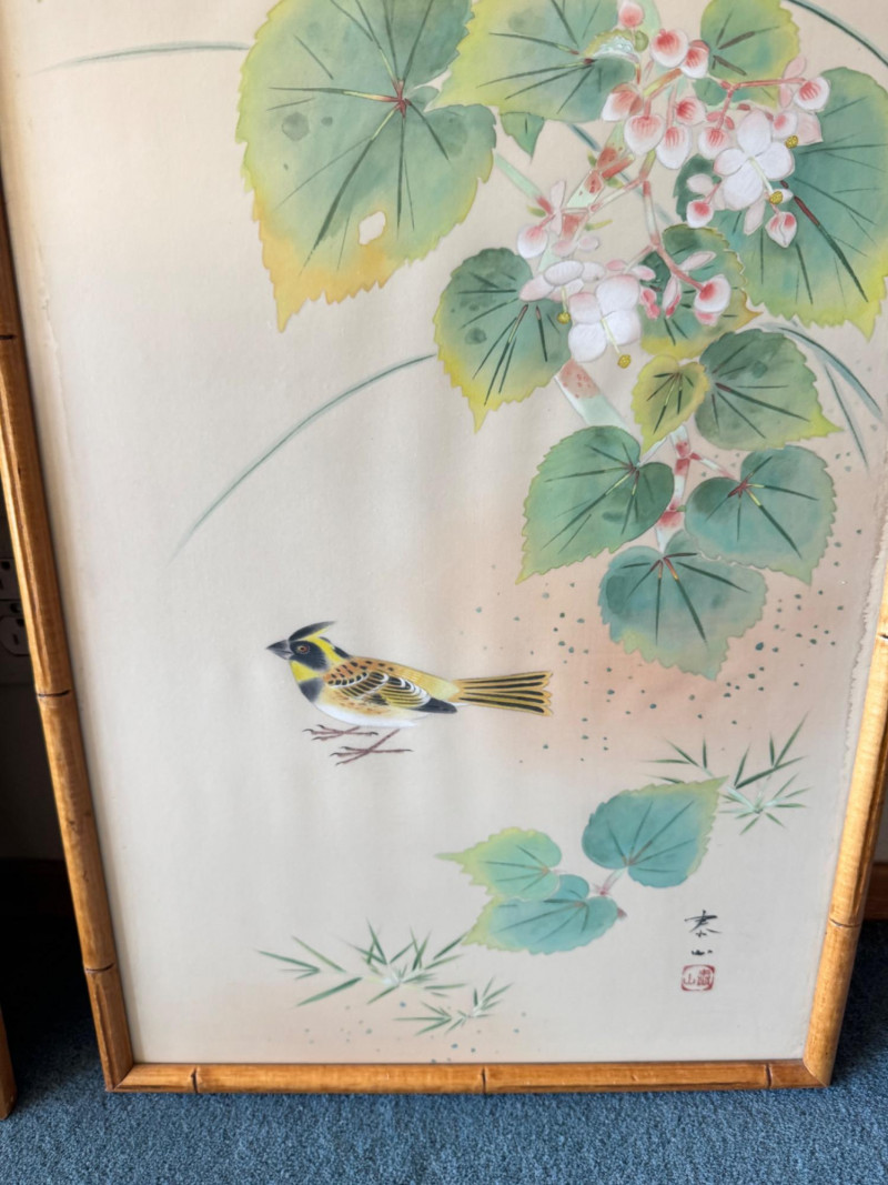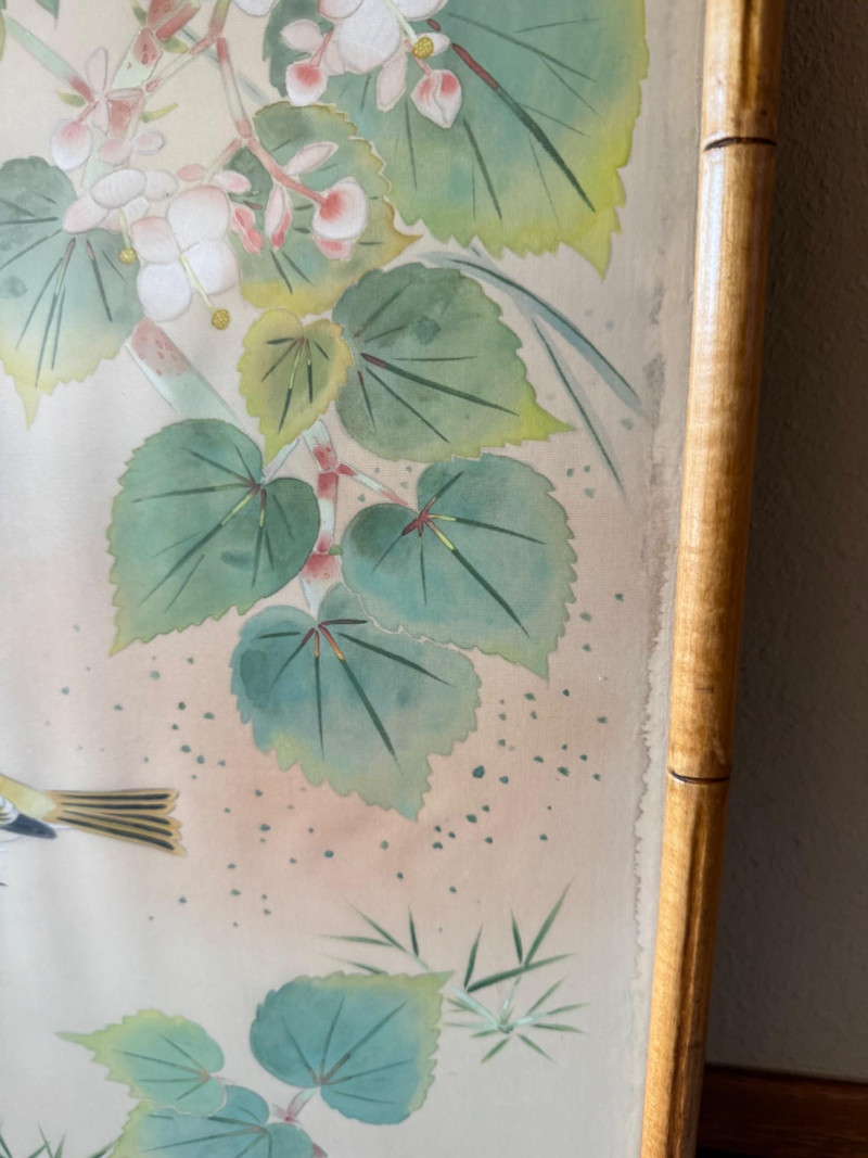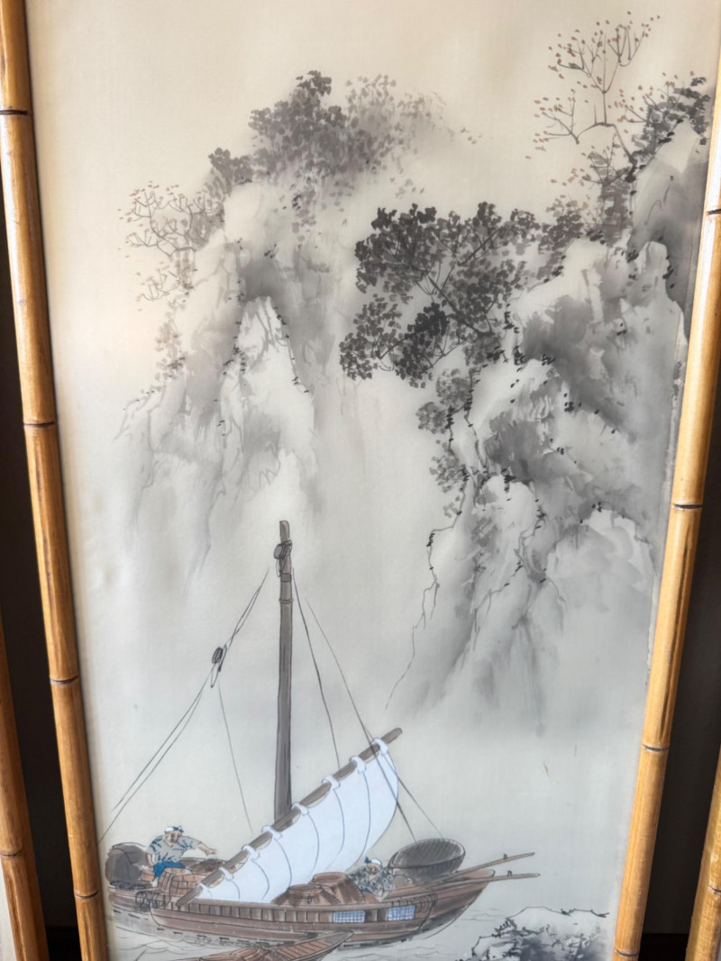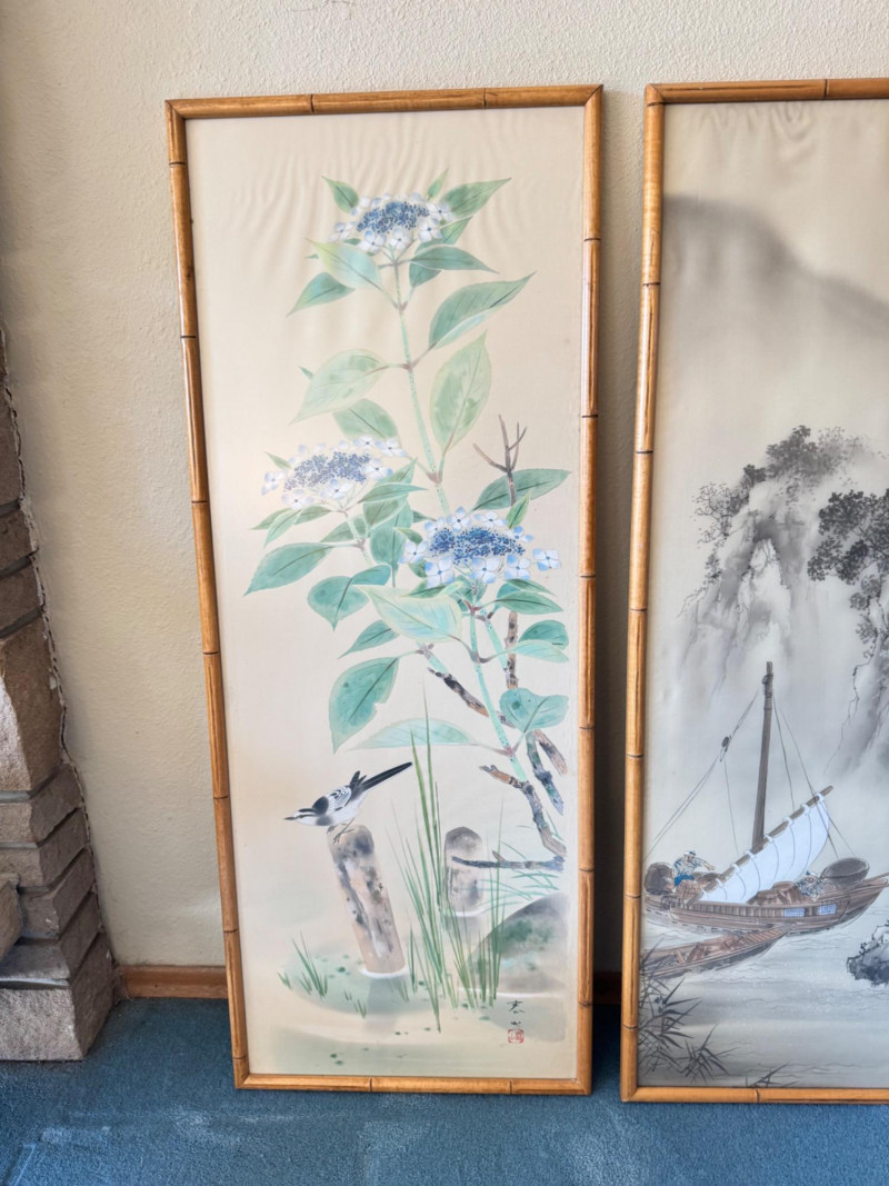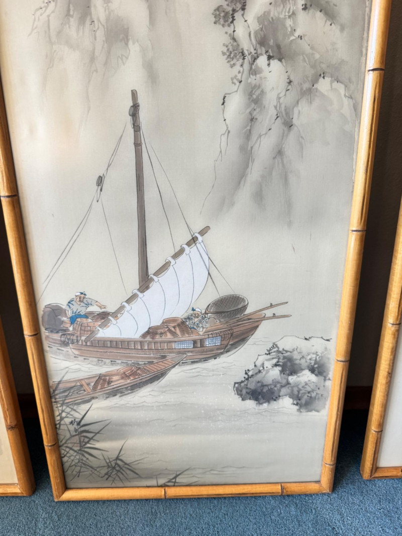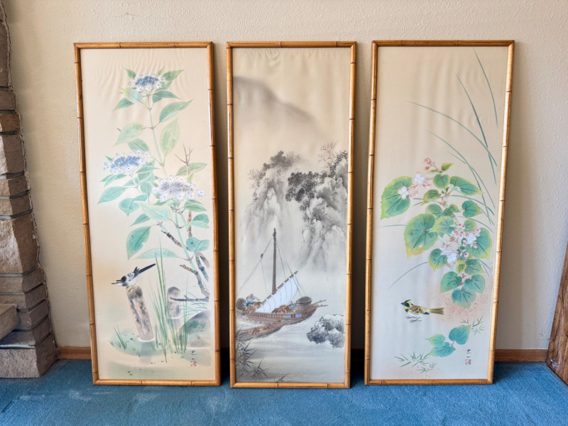 Lot # 15 - Set of 3 Framed Asian Silk Artwork – Birds, Blossoms & Boat Scene