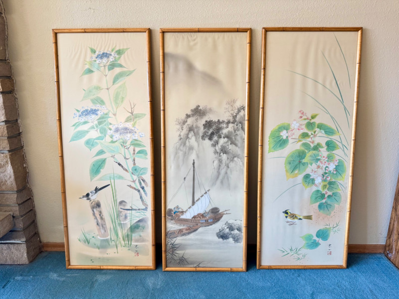 Set of 3 Framed Asian Silk Artwork – Birds, Blossoms & Boat Scene.