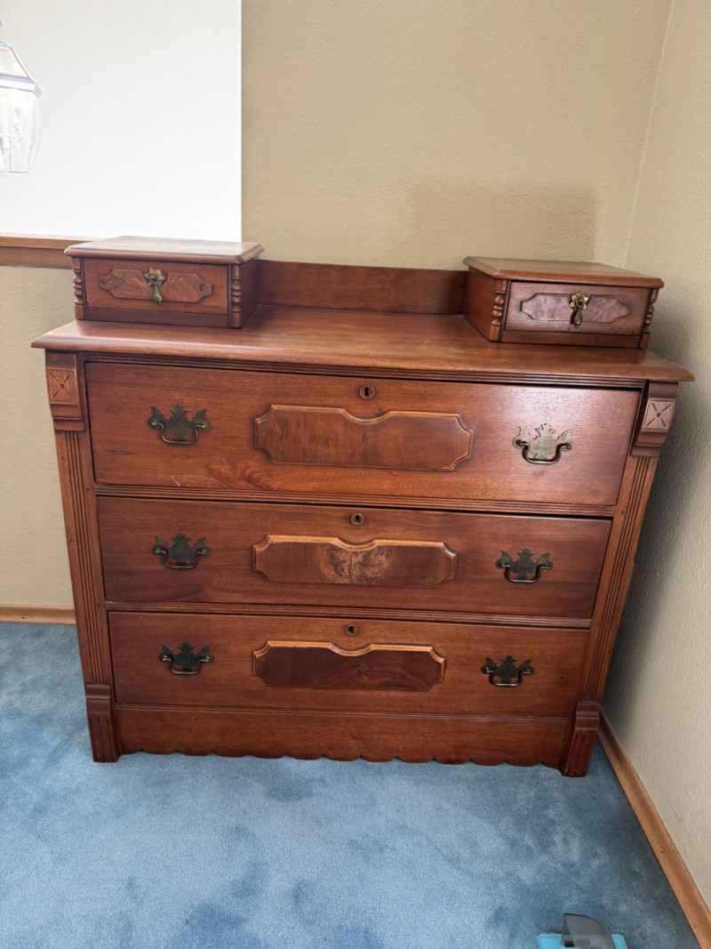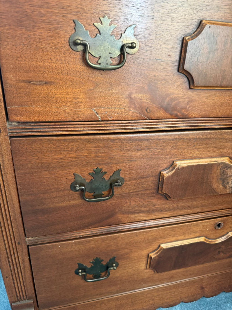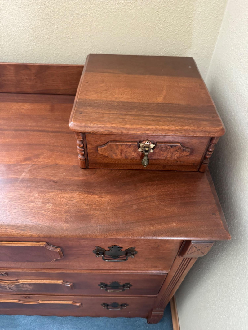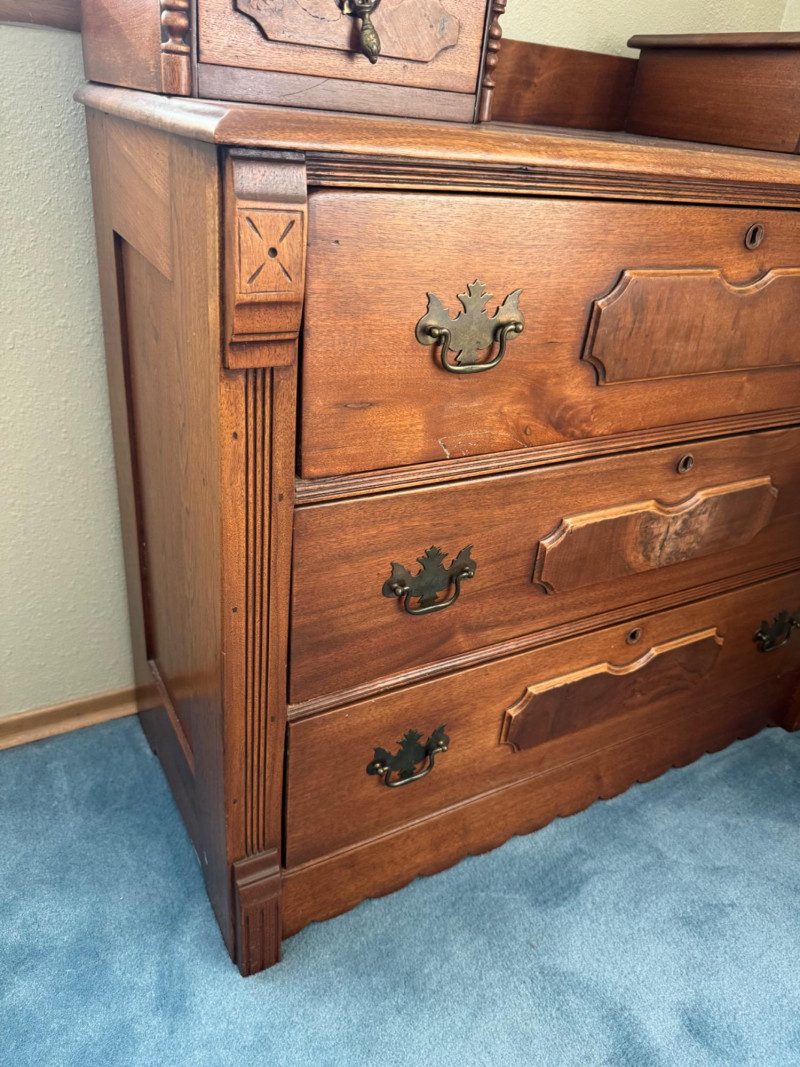 Antique Wood Dresser w/ Carved Details & Brass Pulls.