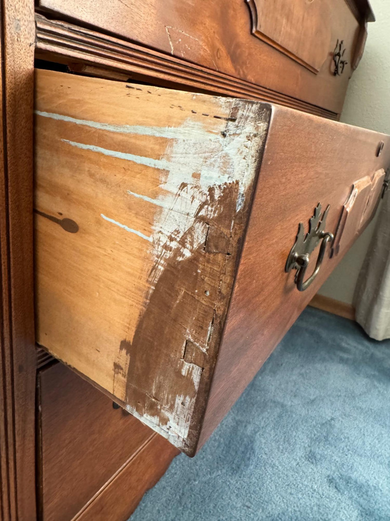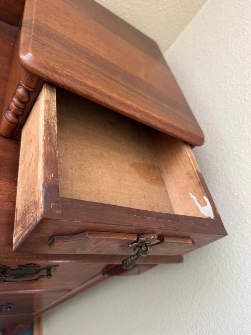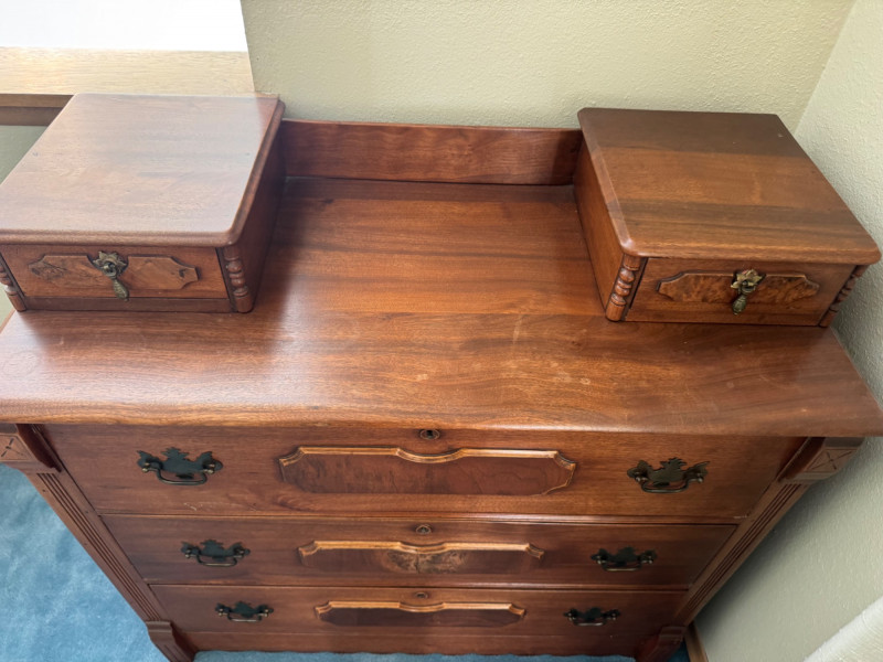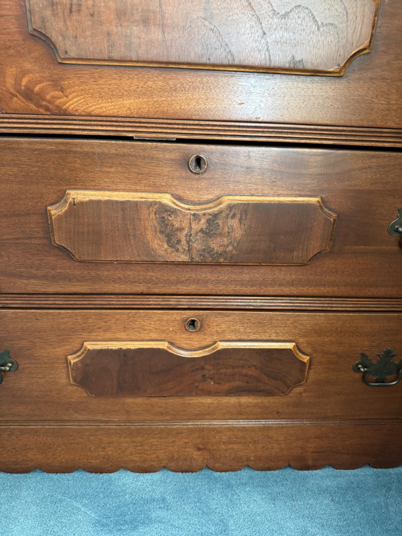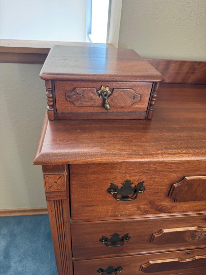 Antique Wood Dresser w/ Carved Details & Brass Pulls.