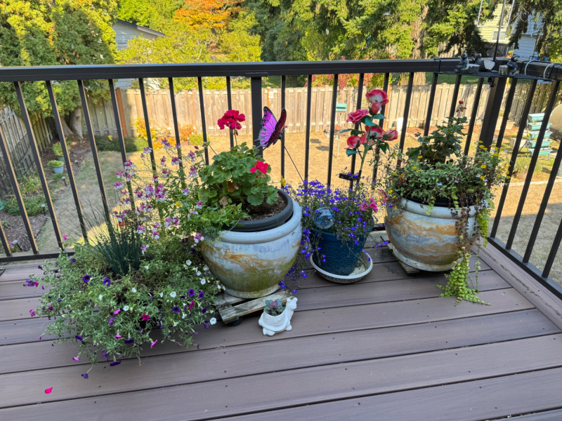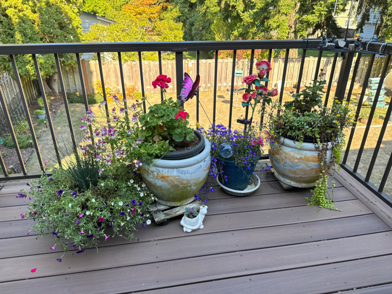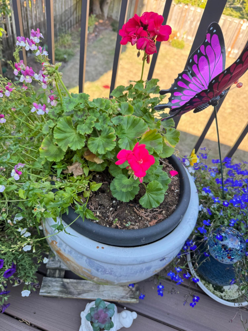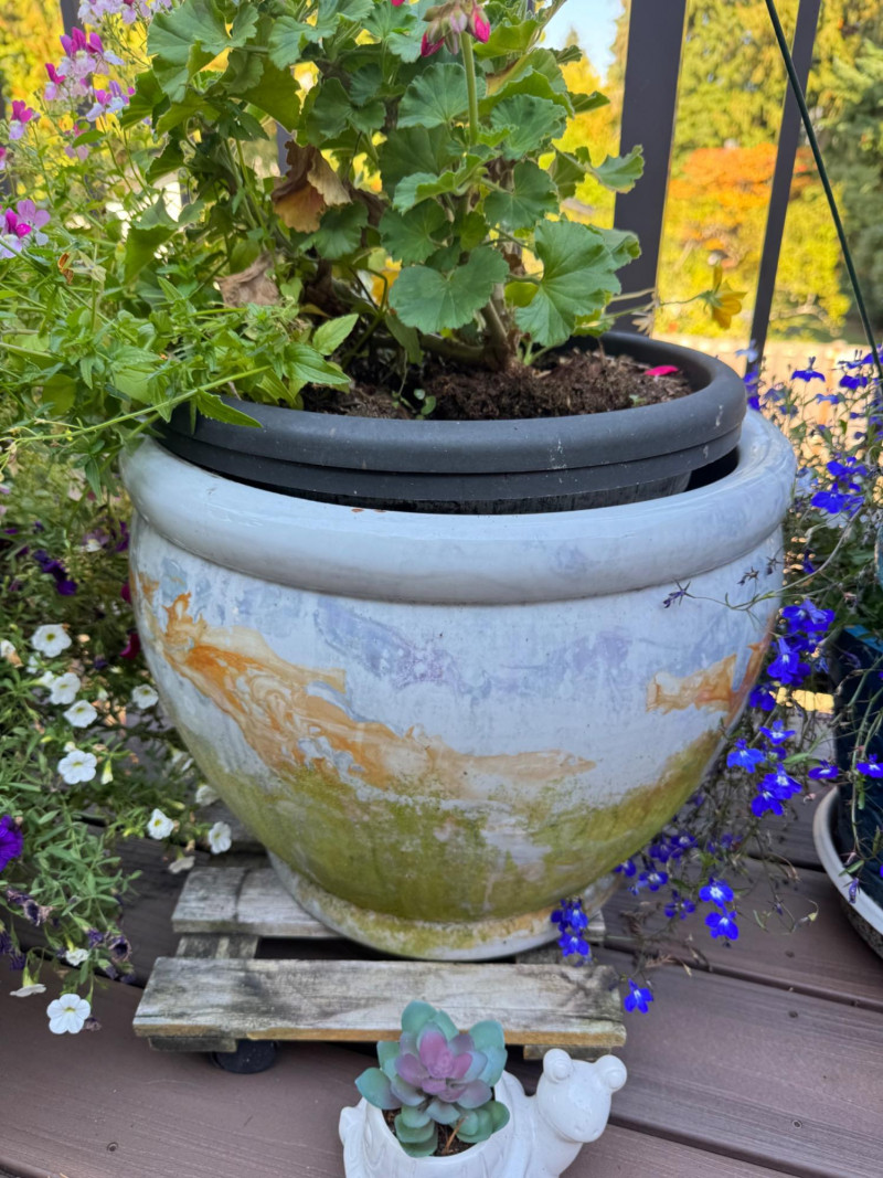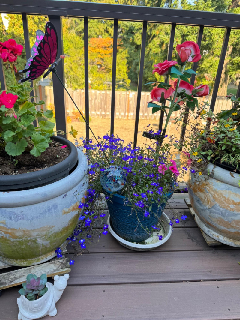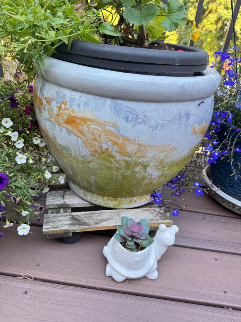 Set of Outdoor Ceramic Planters w/ Flowers & Turtle Pot Décor.