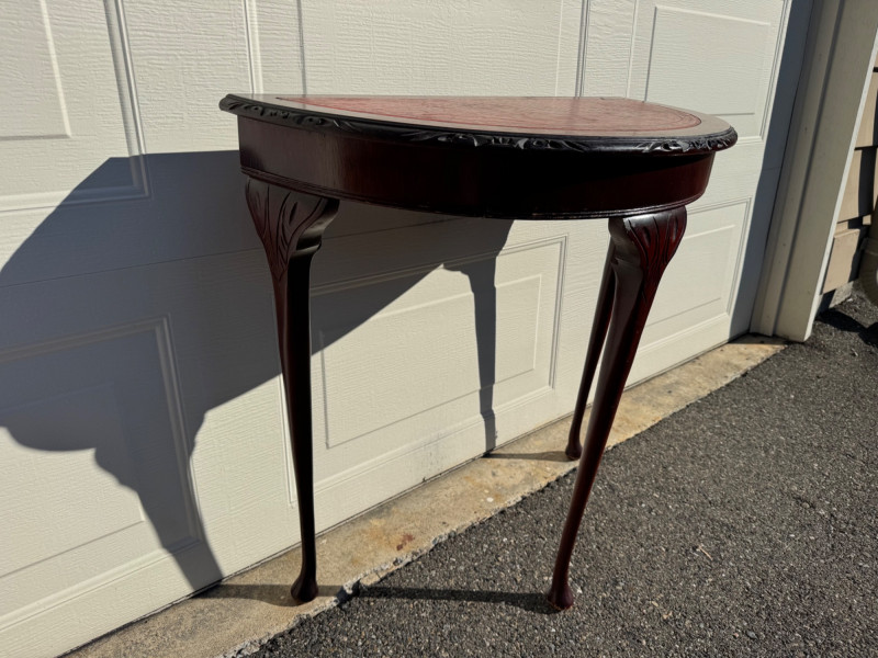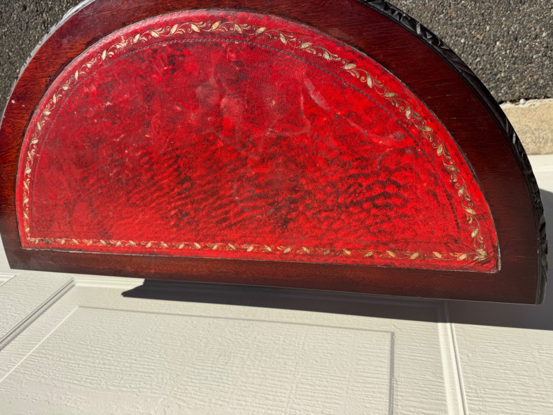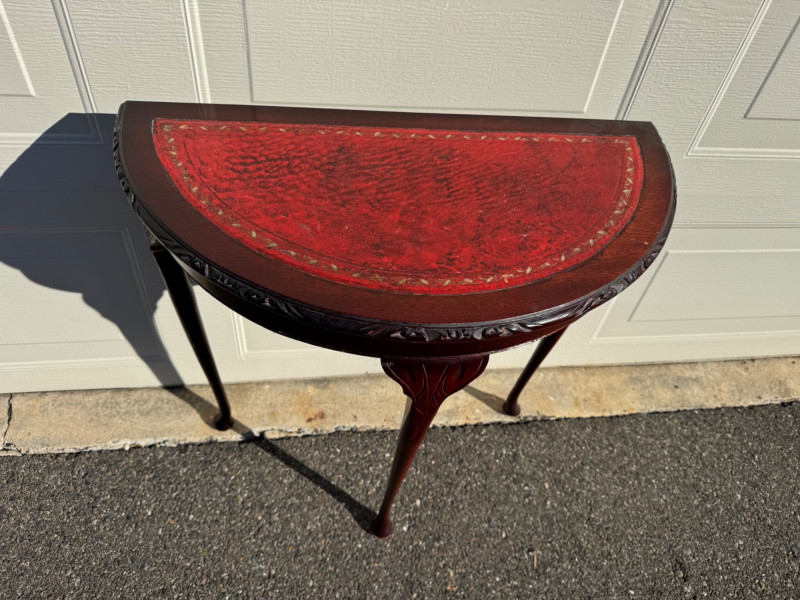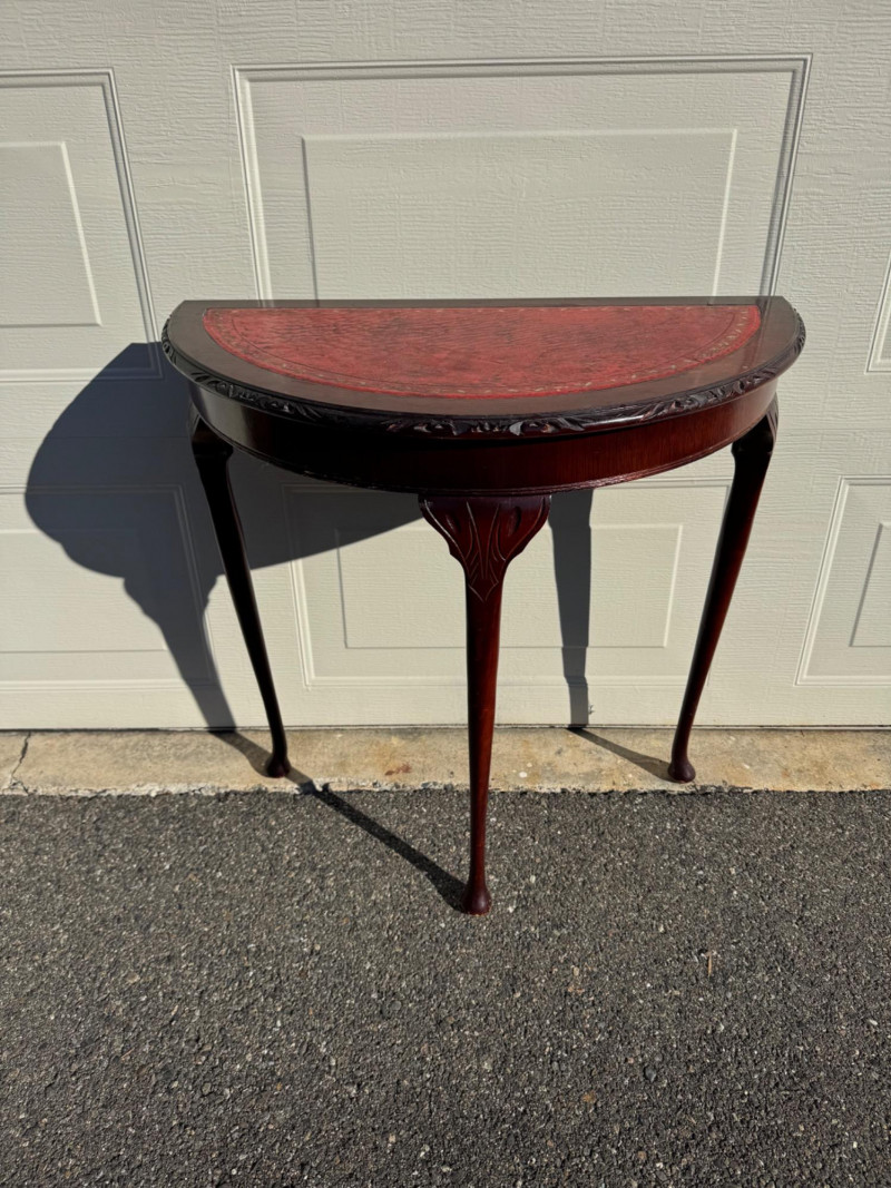 Vintage Half-Round Wood Accent Table w/ Embossed Red Top.