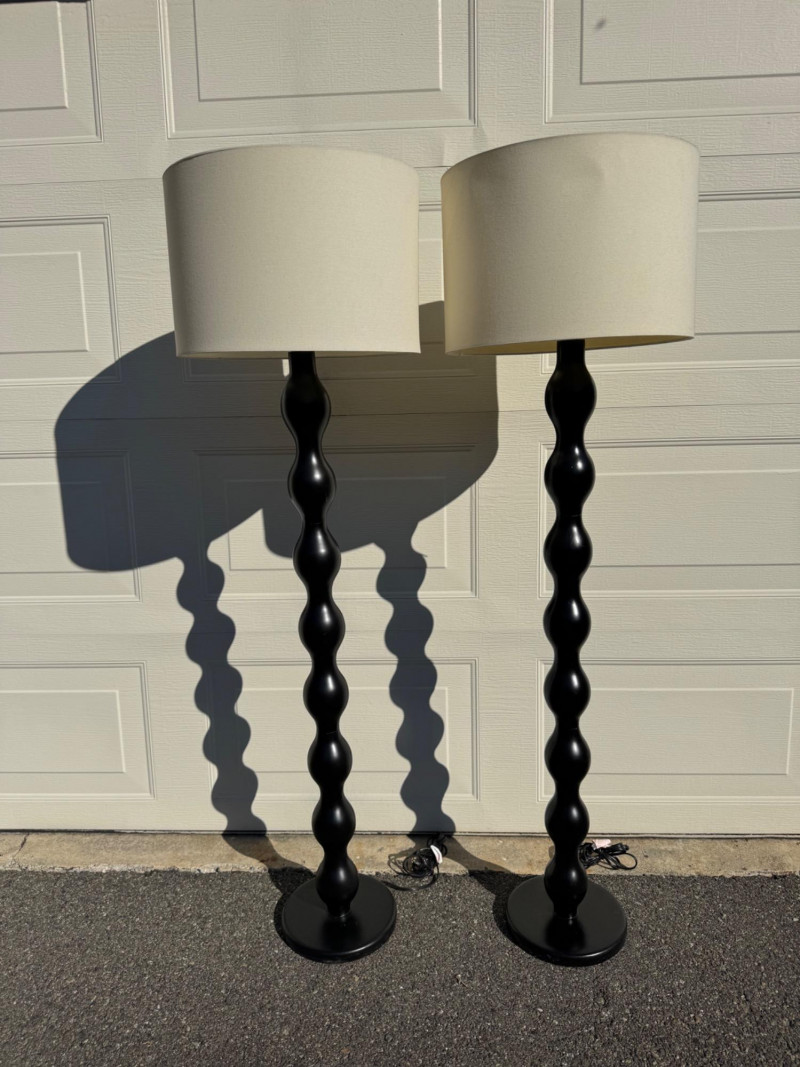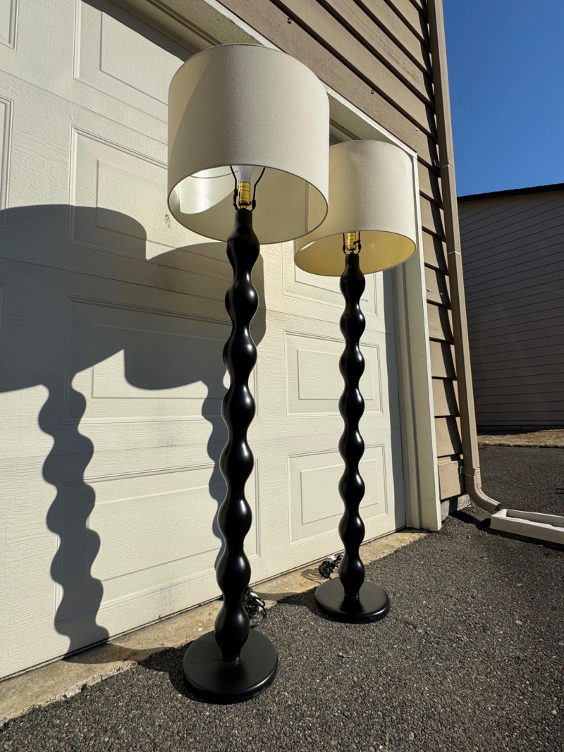 Pair of Black Floor Lamps w/ Wavy Column Base & Drum Shades.