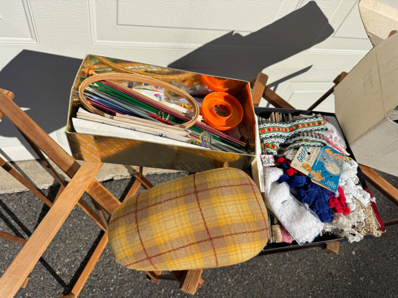 Lot # 43 - Vintage Wooden Clothes Drying Rack w/ Knitting & Sewing Supplies