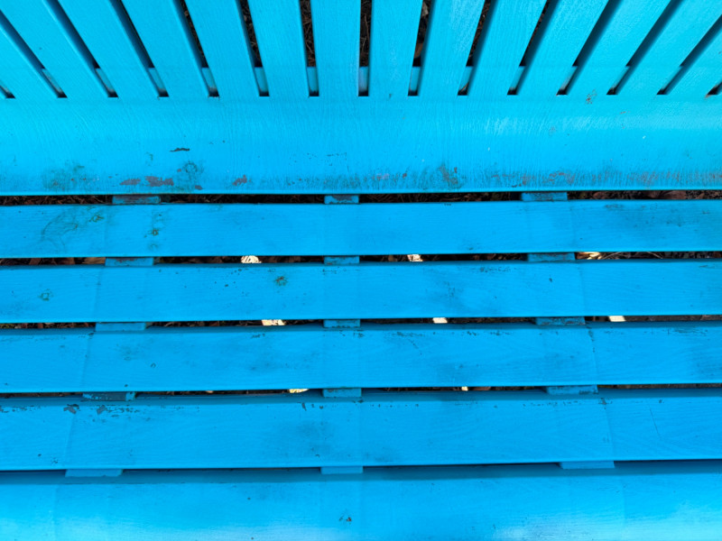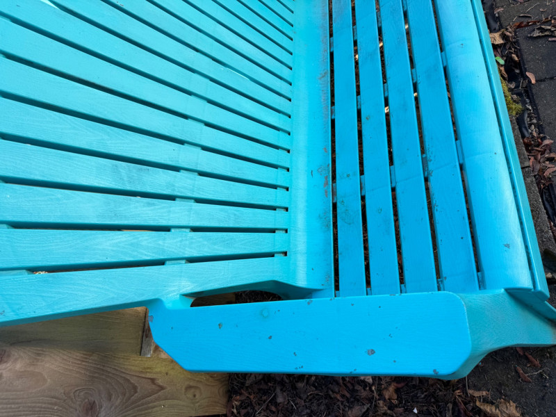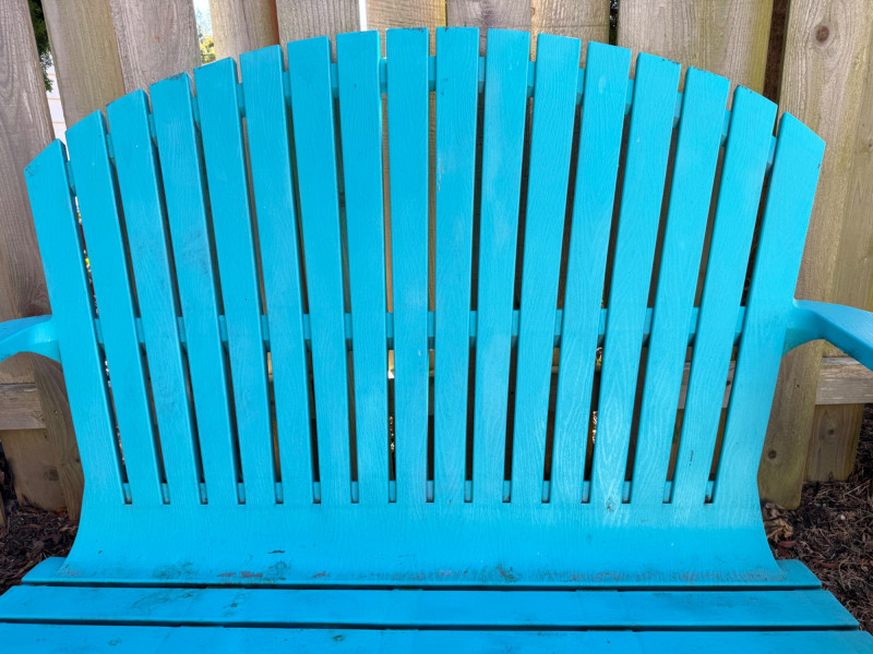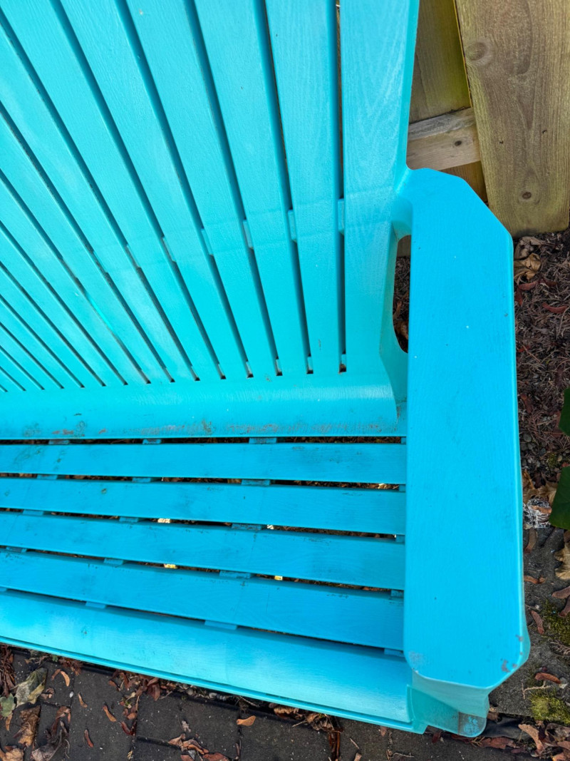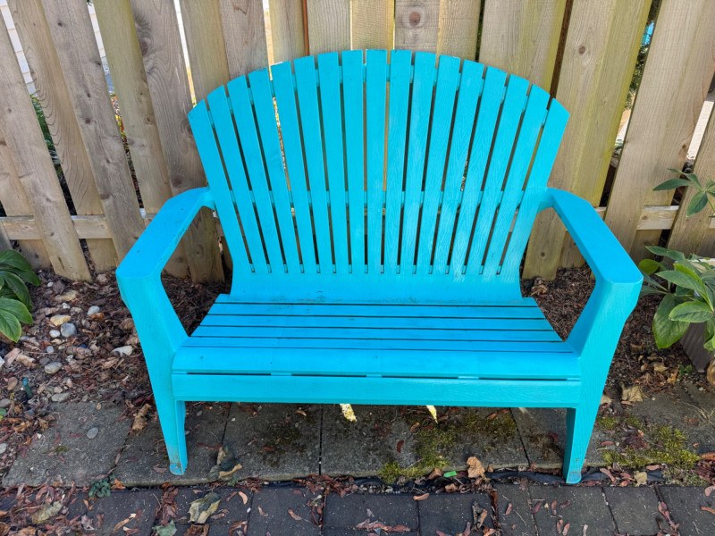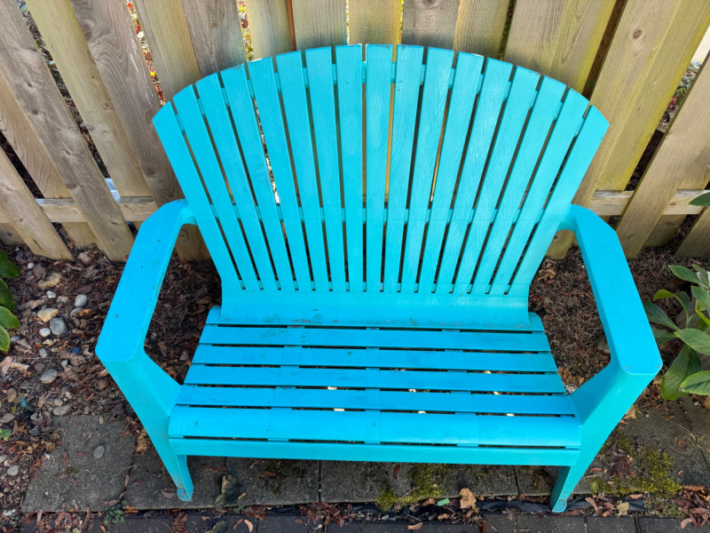 Turquoise Plastic Outdoor Bench – Adirondack Style, 53” Wide.