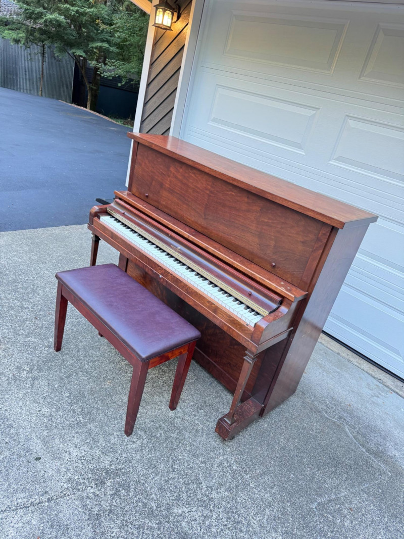 Brinkerhoff Upright Piano w/ Matching Bench – Chicago Maker. Bidding on this lot is an agreement that: (1.) You will have at least 2 capable, able bodied persons to lift and load at a minimum. (2.) You will bring a hand truck and/or any other tools needed to remove this item. If these steps are not followed your item will be forfeit and no refund given.
