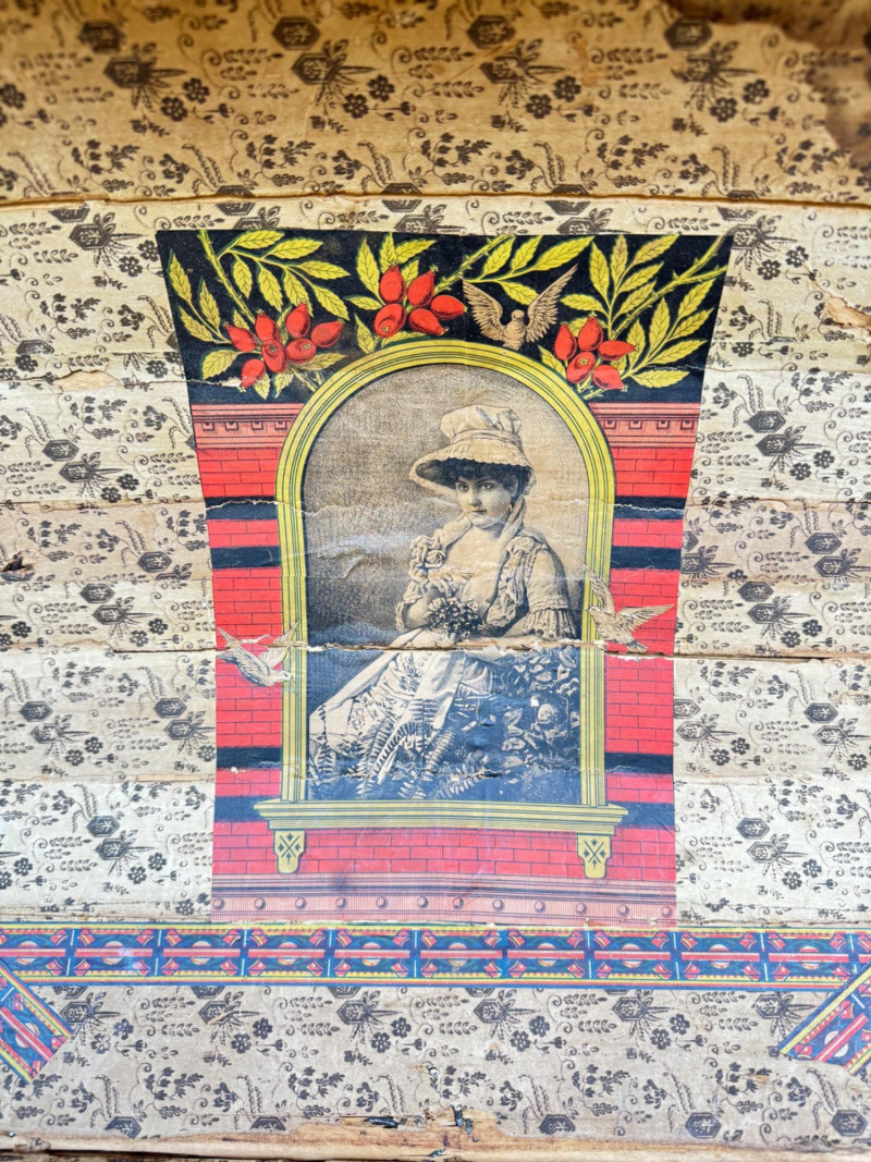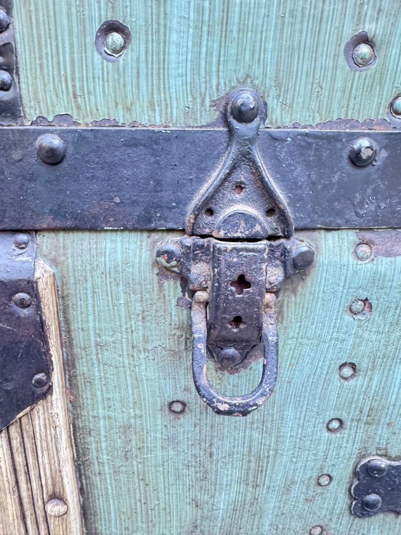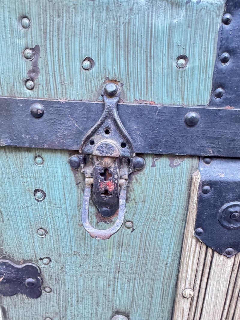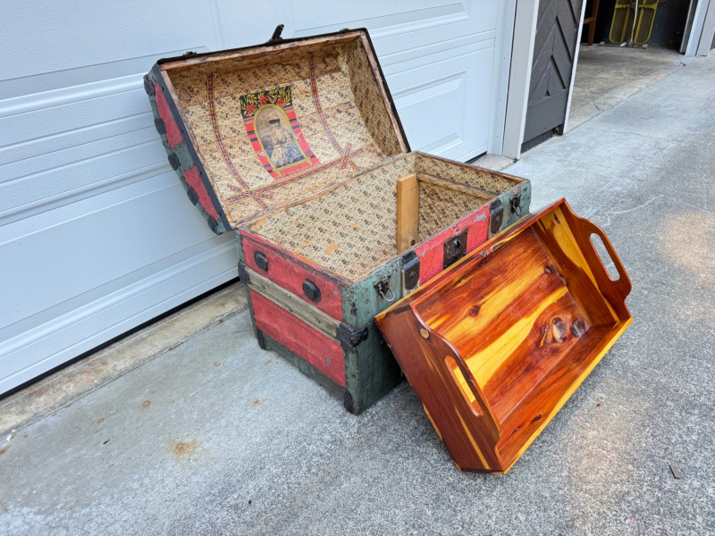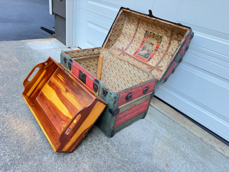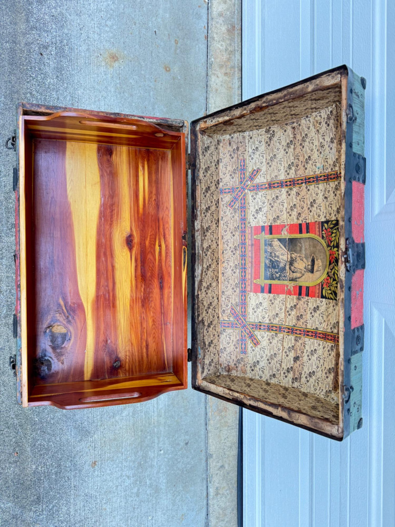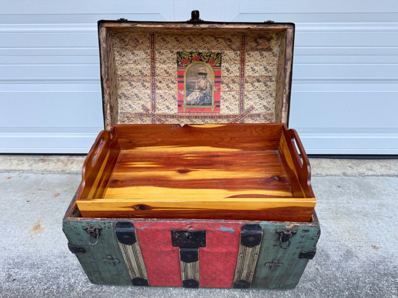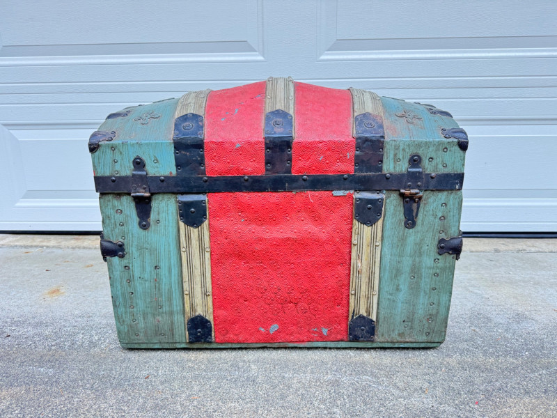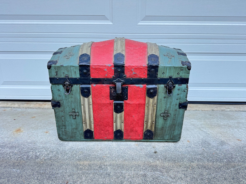Vintage Dome-Top Steamer Trunk – Red & Green Embossed Tin w/ Tray.