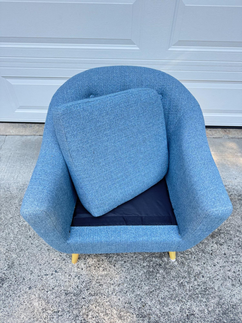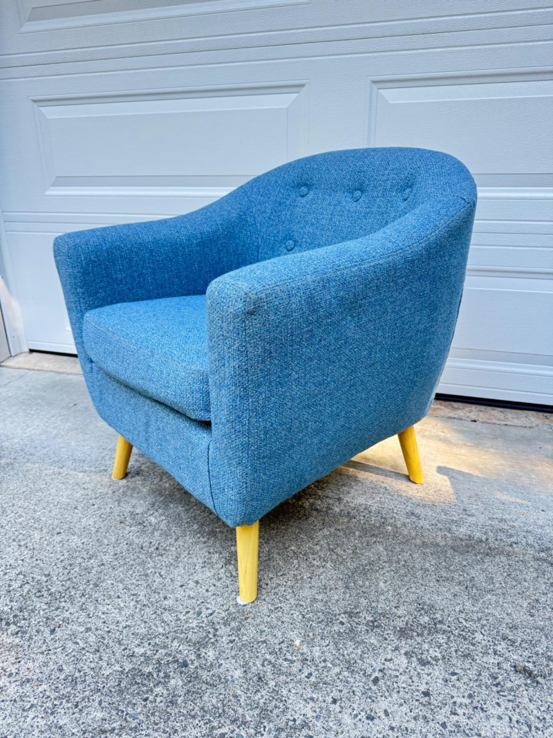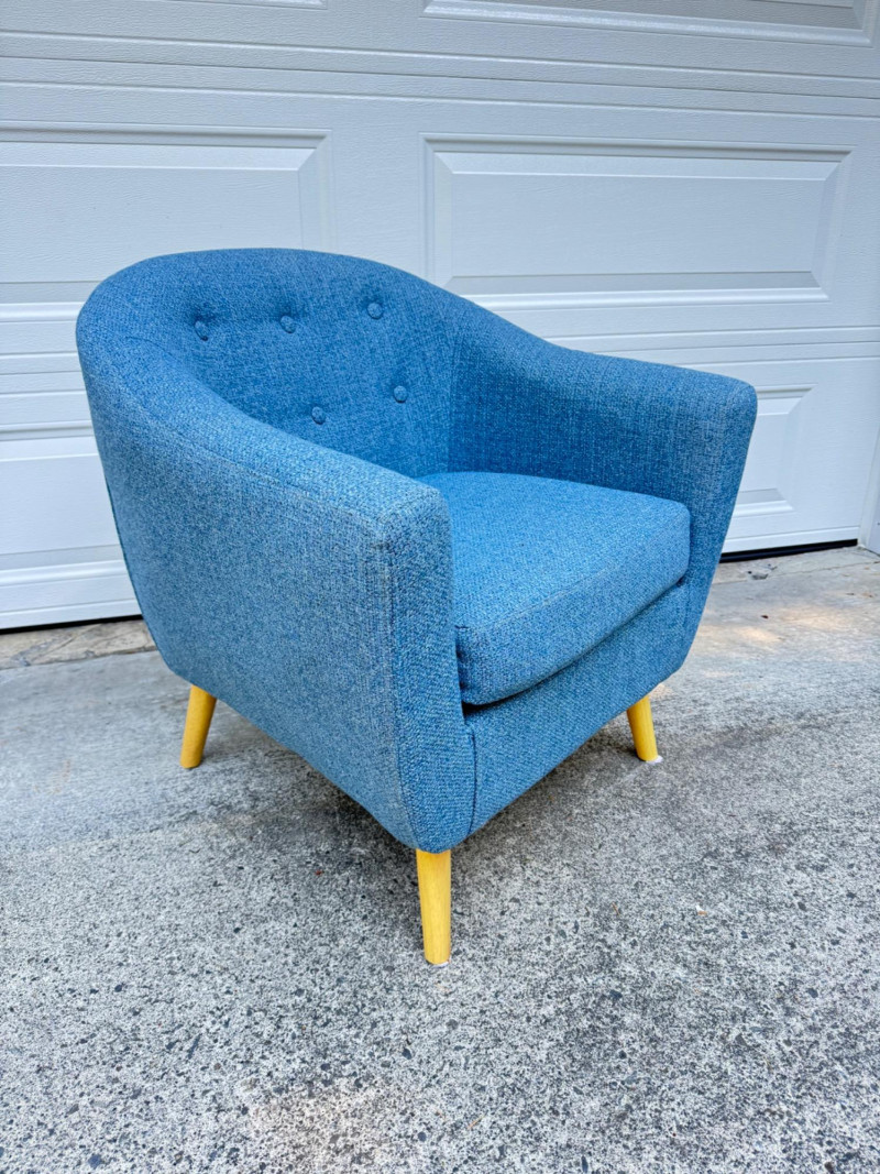 MCM Blue Accent Chair – Button-Tufted Back & Tapered Legs.