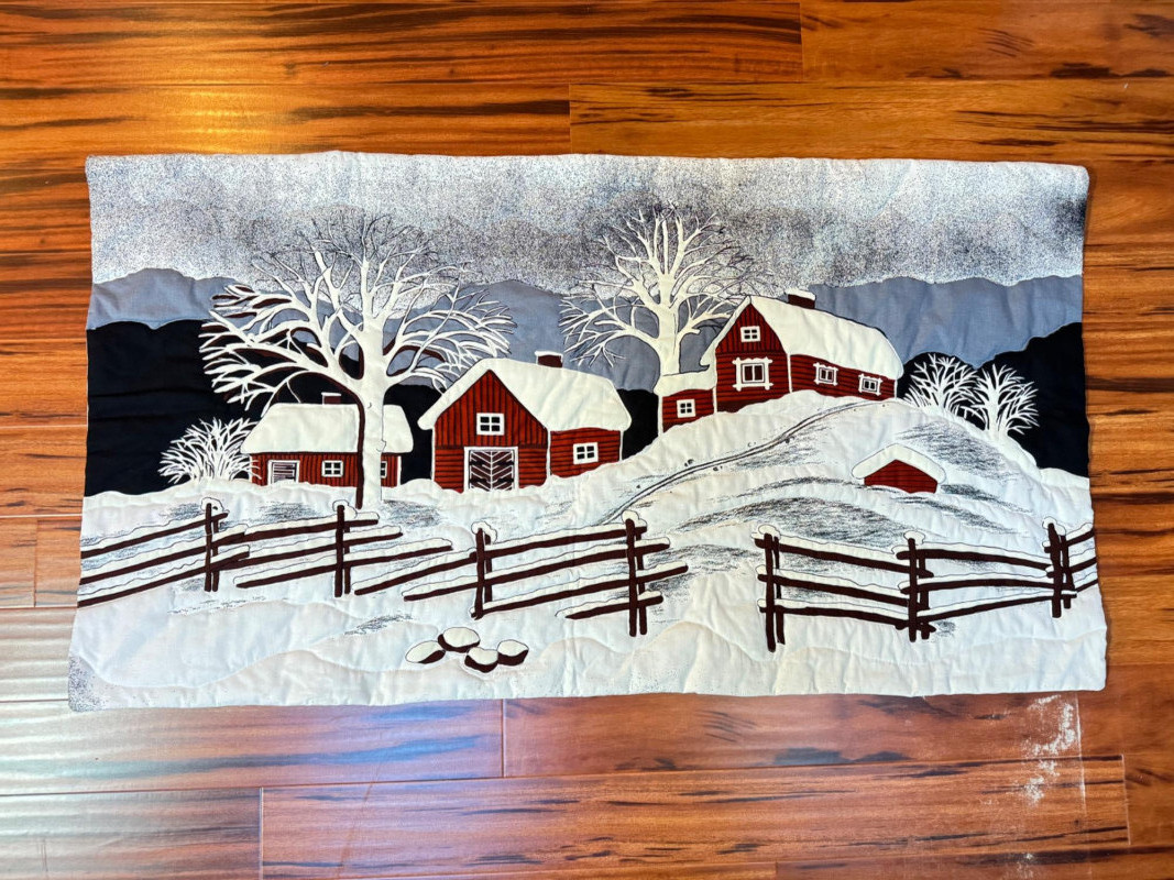 Winter Farm Scene Quilted Wall Hanging w/ Pocket.