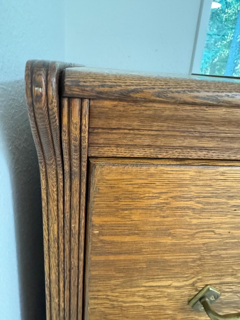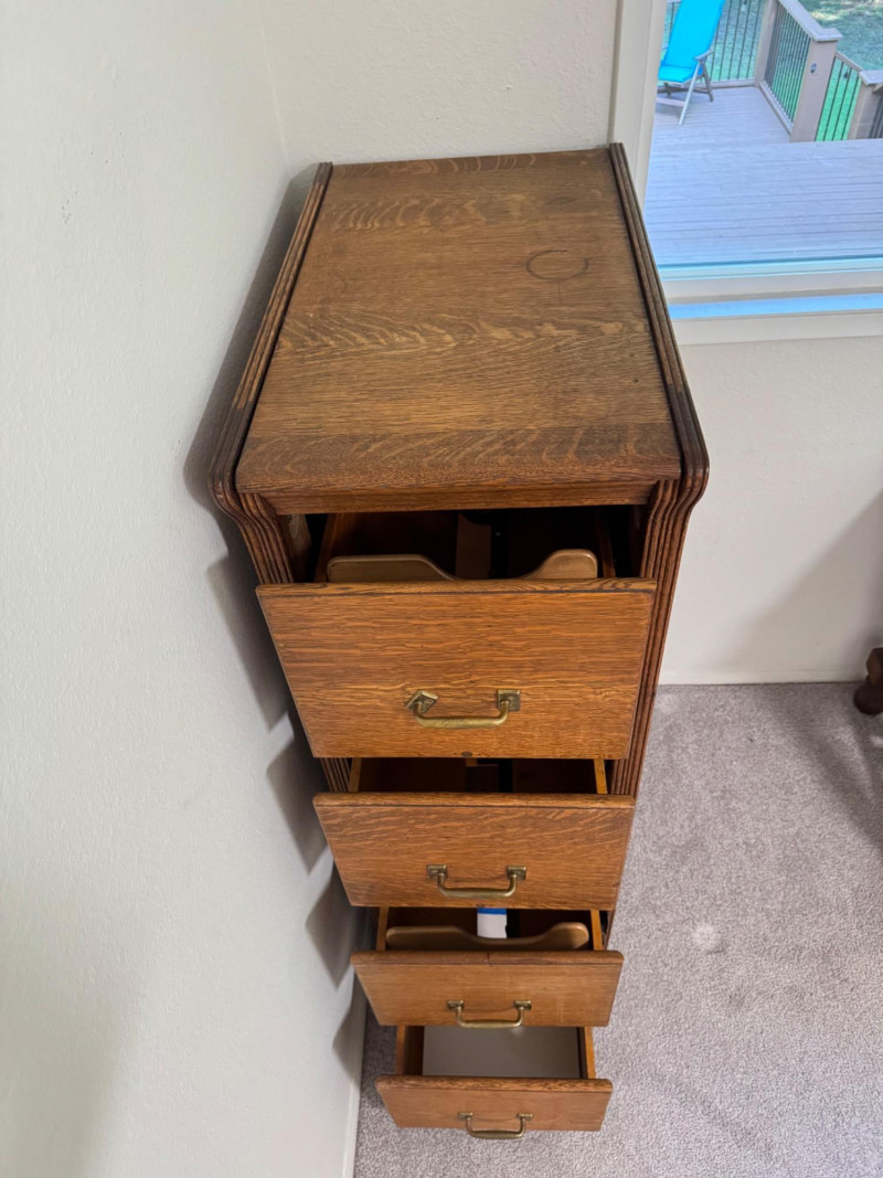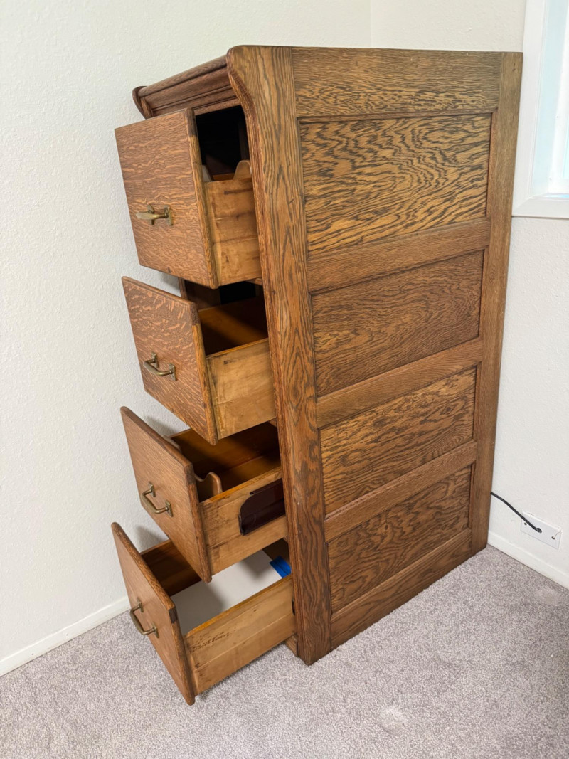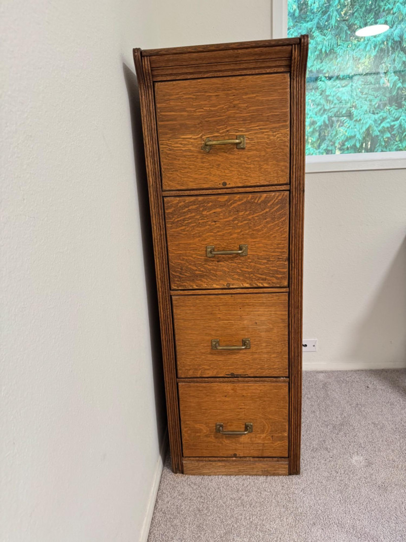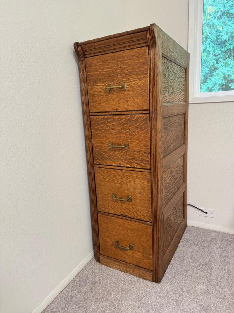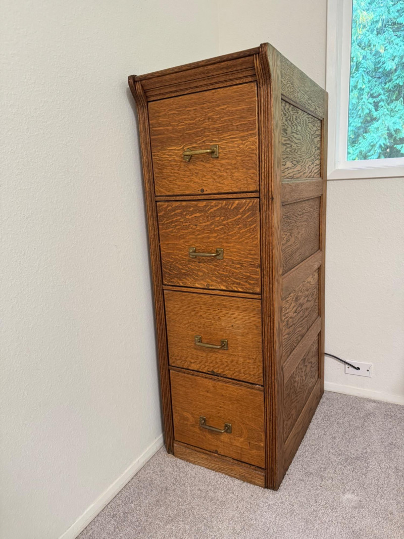 Four-Drawer Wood Filing Cabinet w/ Brass Pulls.